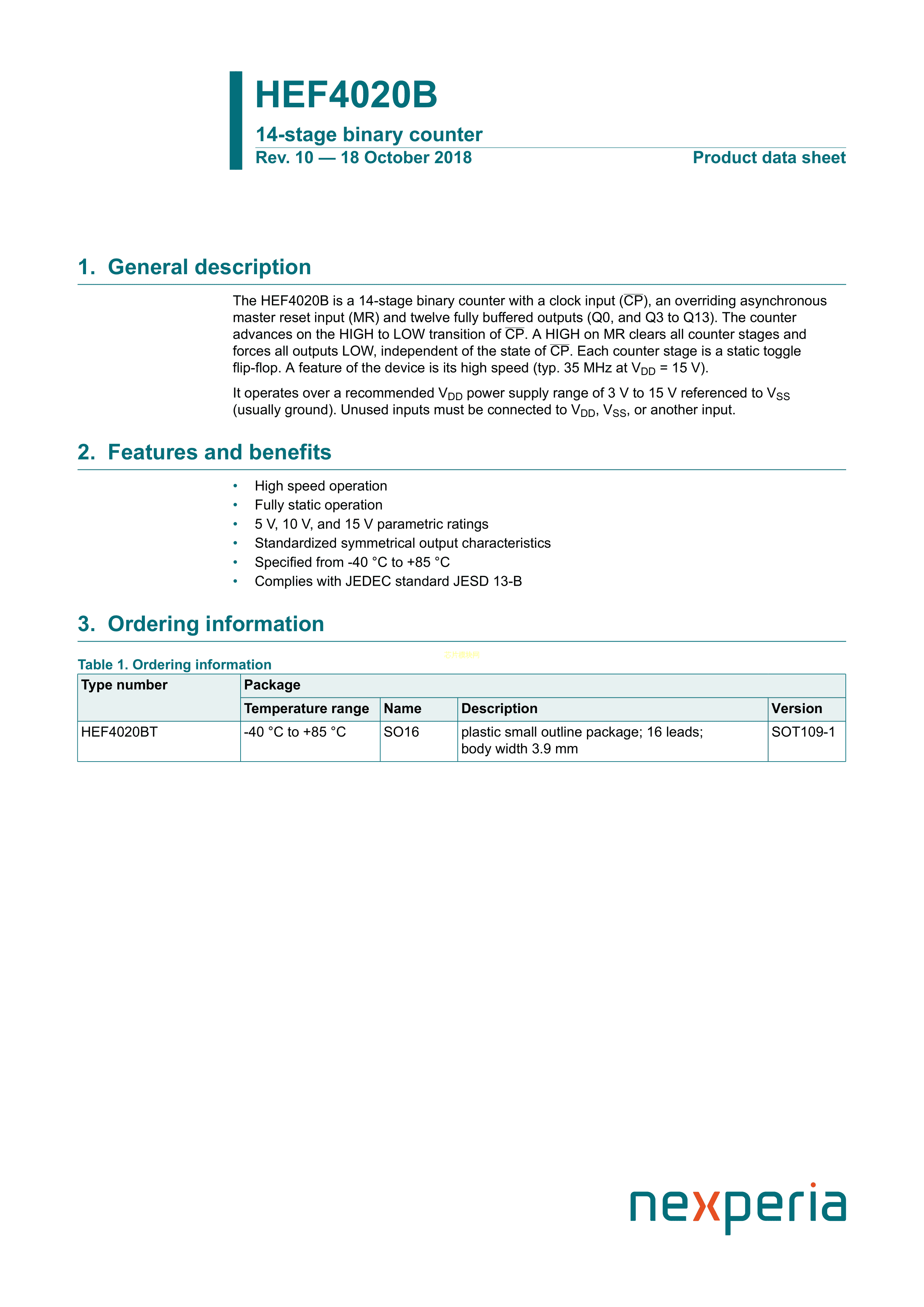HEF4020BT652数据手册SO-16封装Nexperia(安世)PDF规格书,中英文下载
