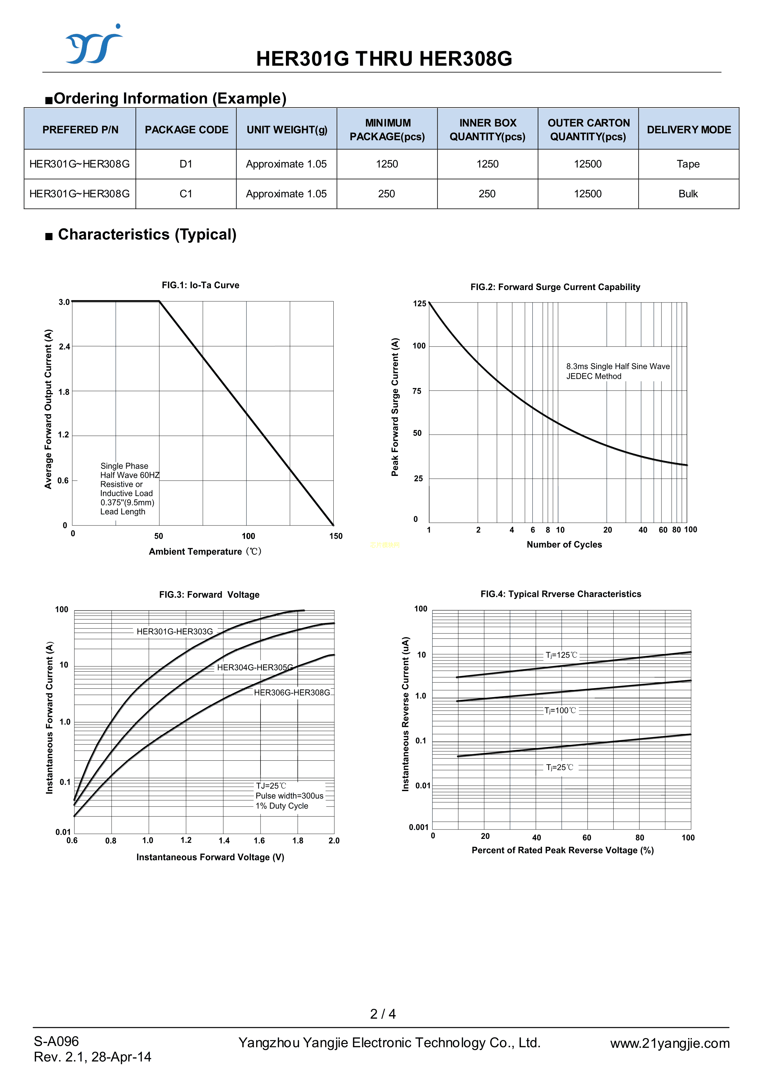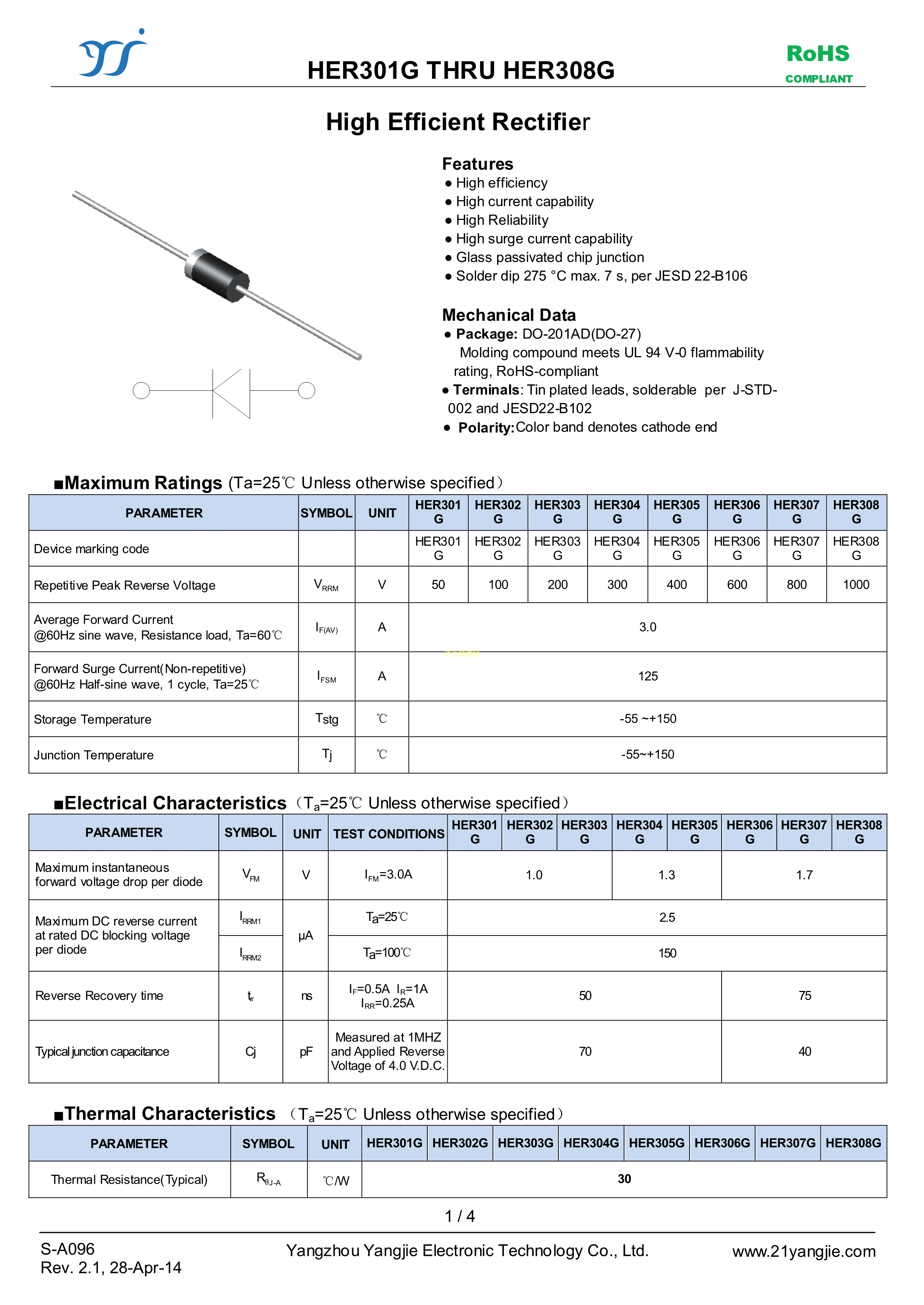 HER308G数据手册DO-201AD封装YANGJIE(扬杰)PDF规格书,中英文下载