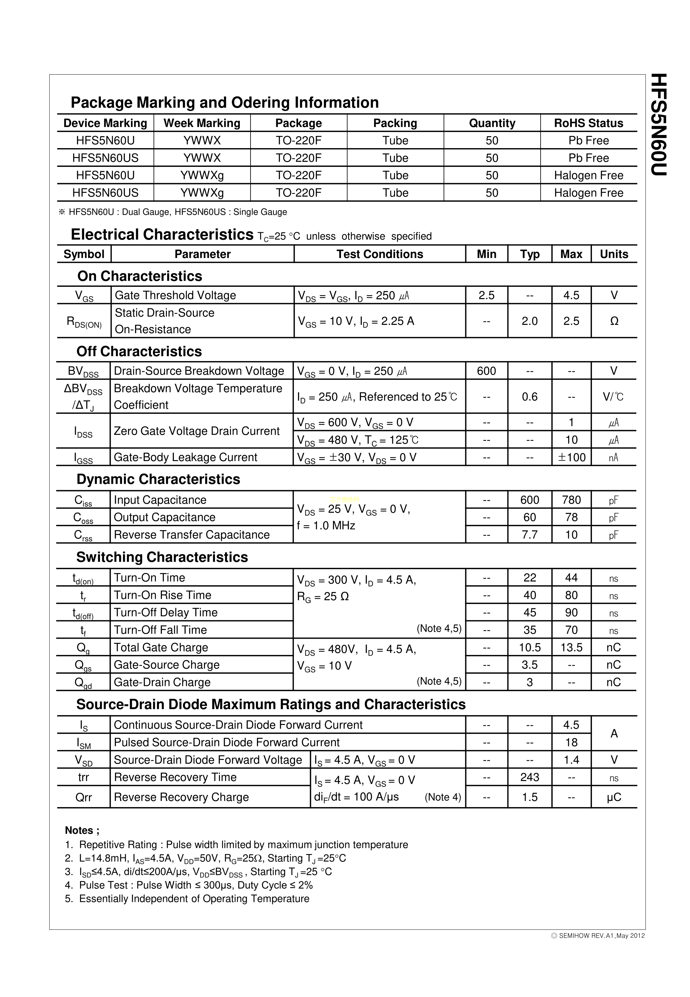 HFS5N60U数据手册TO-220F封装SemiHowPDF规格书,中英文下载