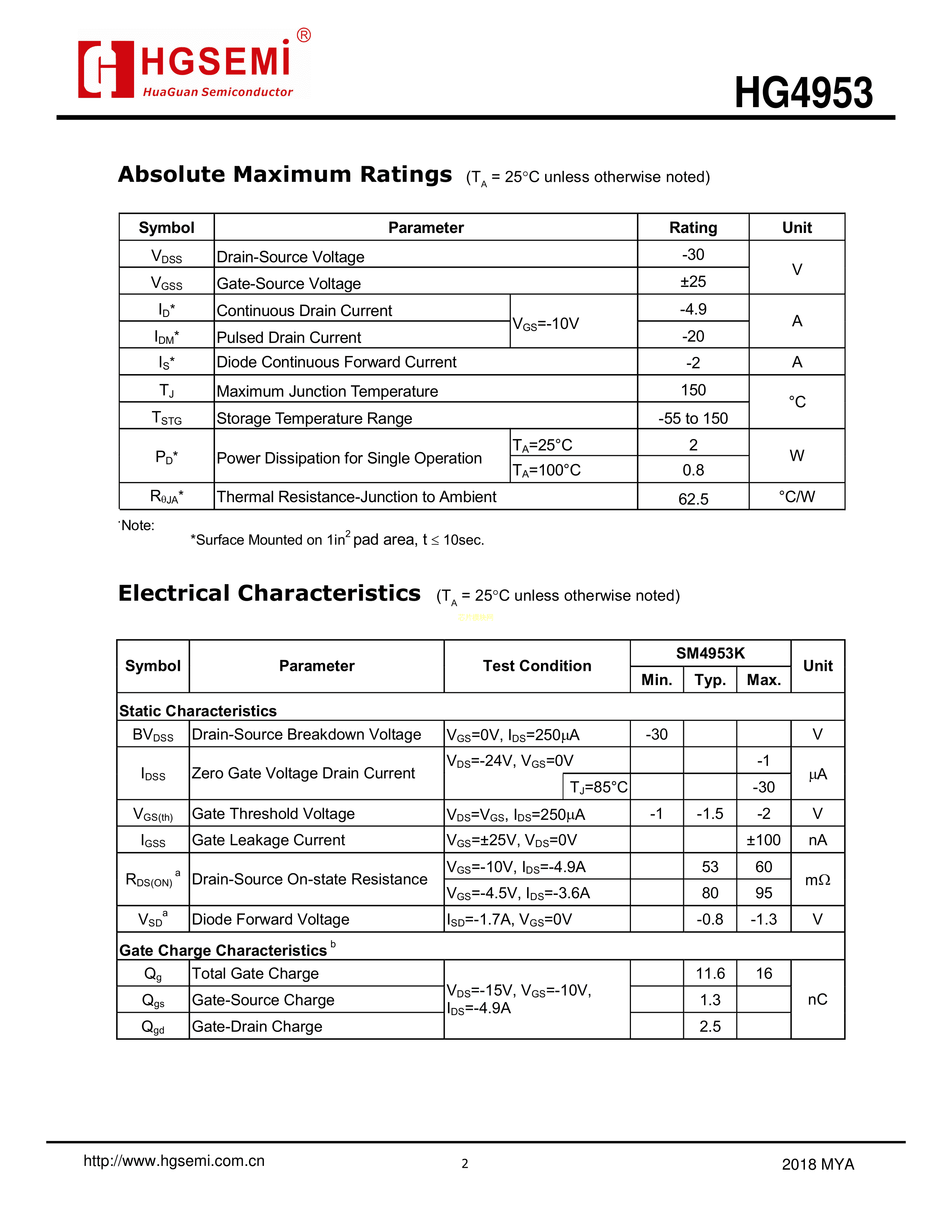HG4953M-TR数据手册SOP-8封装HGSEMI(华冠)PDF规格书,中英文下载