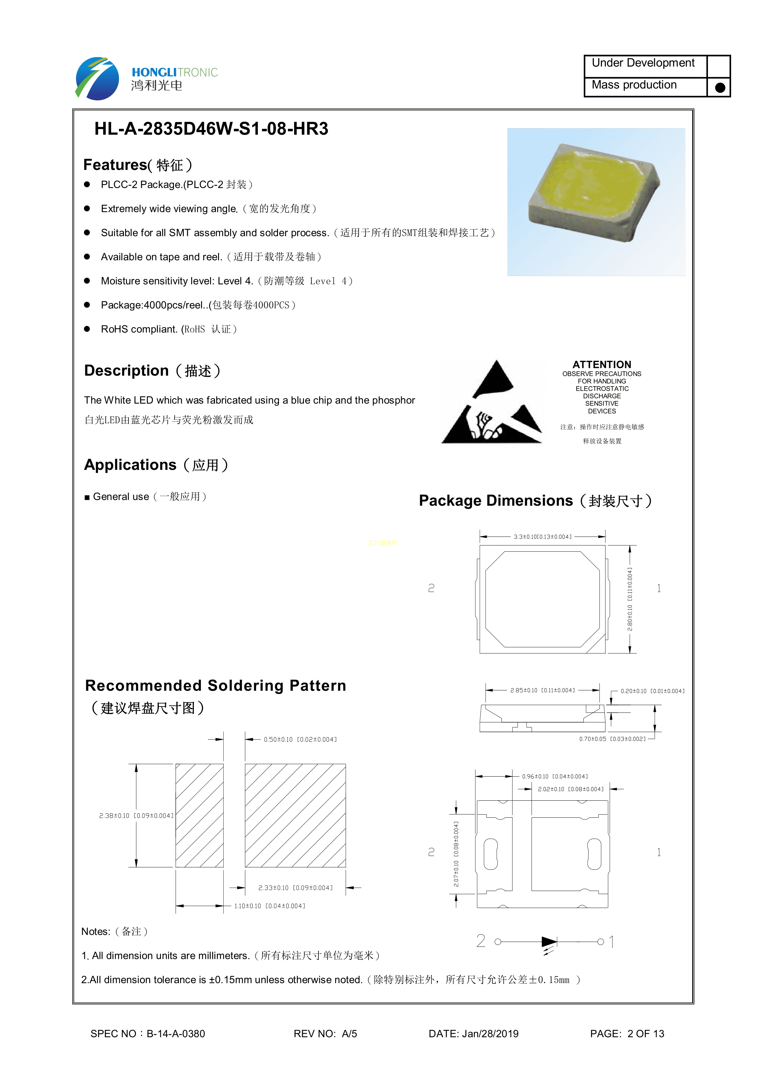 HL-A-2835D46W-S1-08-HR3(色温2800-3100K)数据手册SMD2.8x3.5x0.7mm封装HONGLITRONIC(鸿利光电)PDF规格书,中英文下载