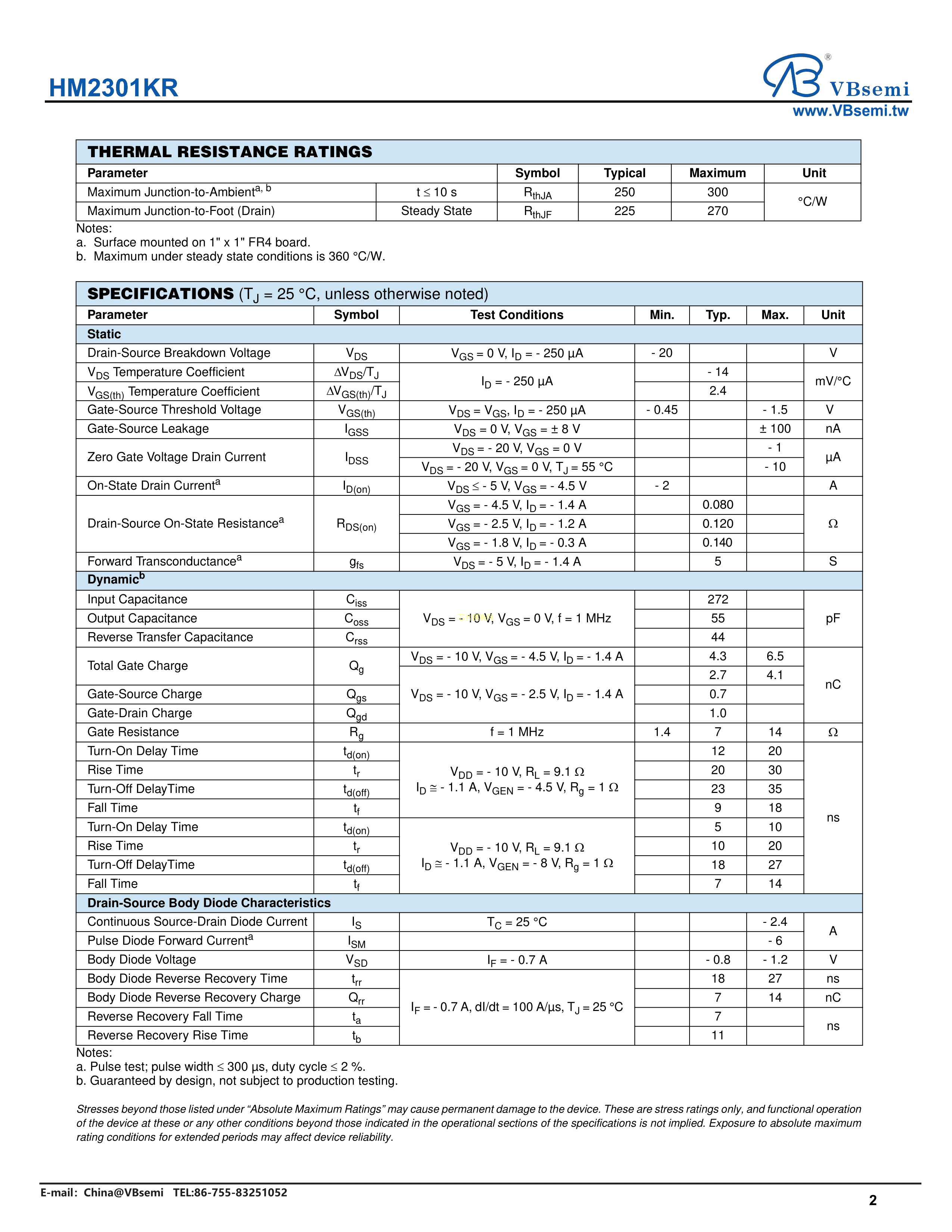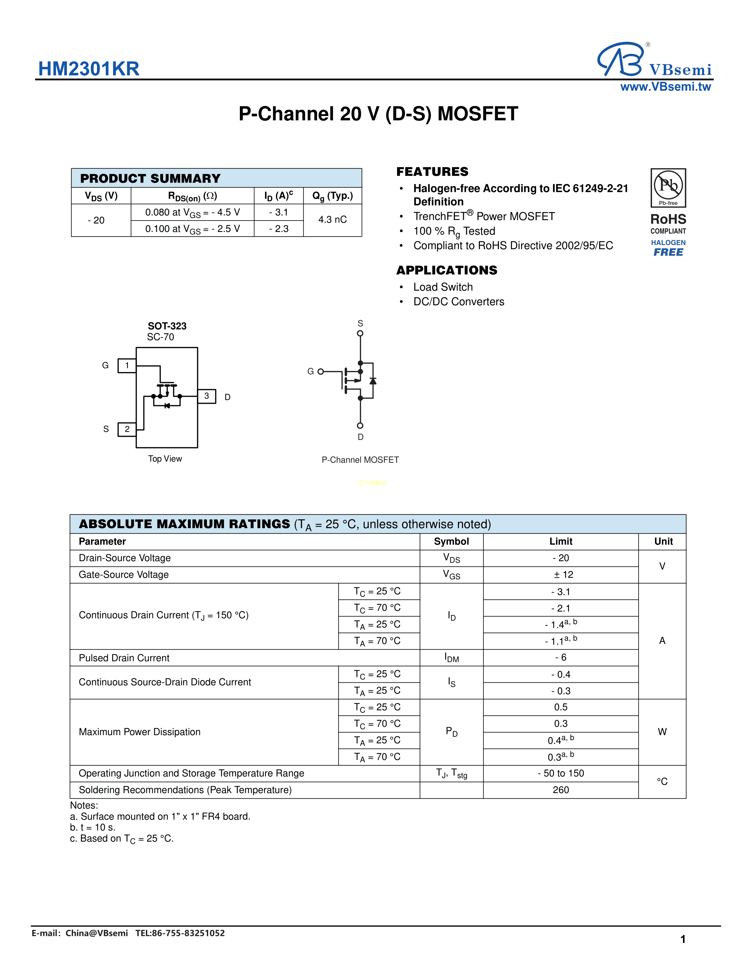 HM2301KR数据手册SOT-323封装VBsemi(台湾微碧)PDF规格书,中英文下载
