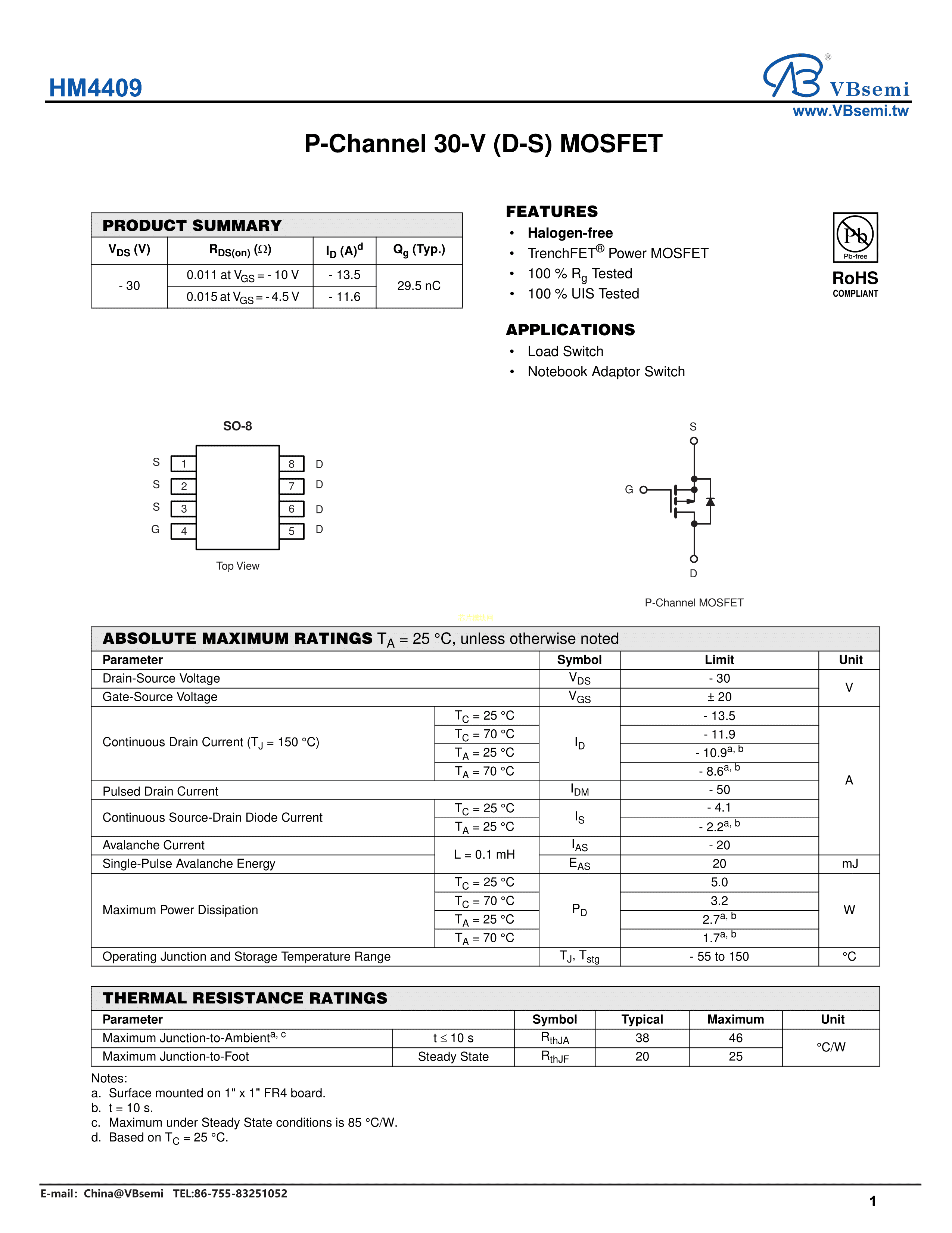 HM4409数据手册SO-8封装VBsemi(台湾微碧)PDF规格书,中英文下载