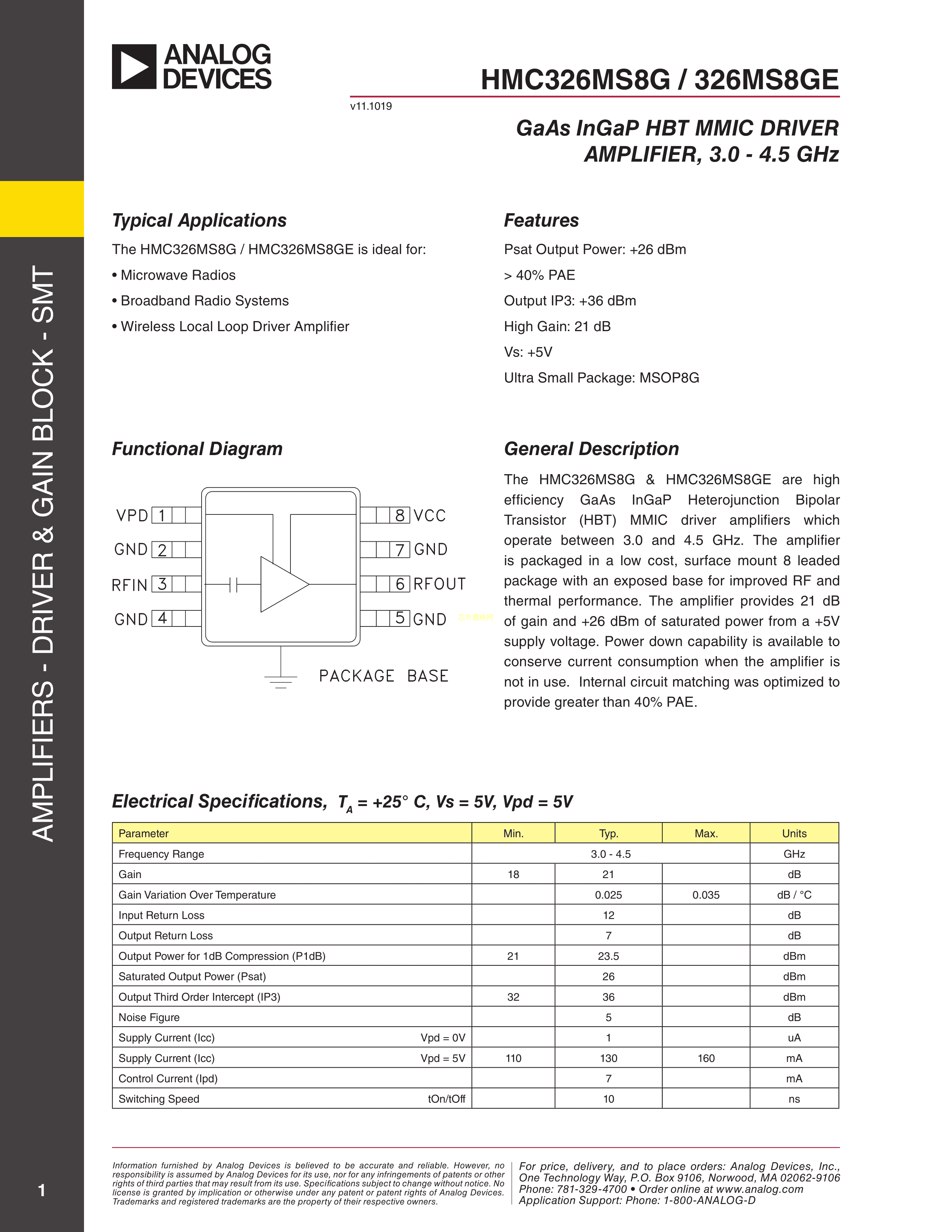 HMC326MS8GE数据手册MSOP-8封装ADI(亚德诺)-LINEARPDF规格书,中英文下载