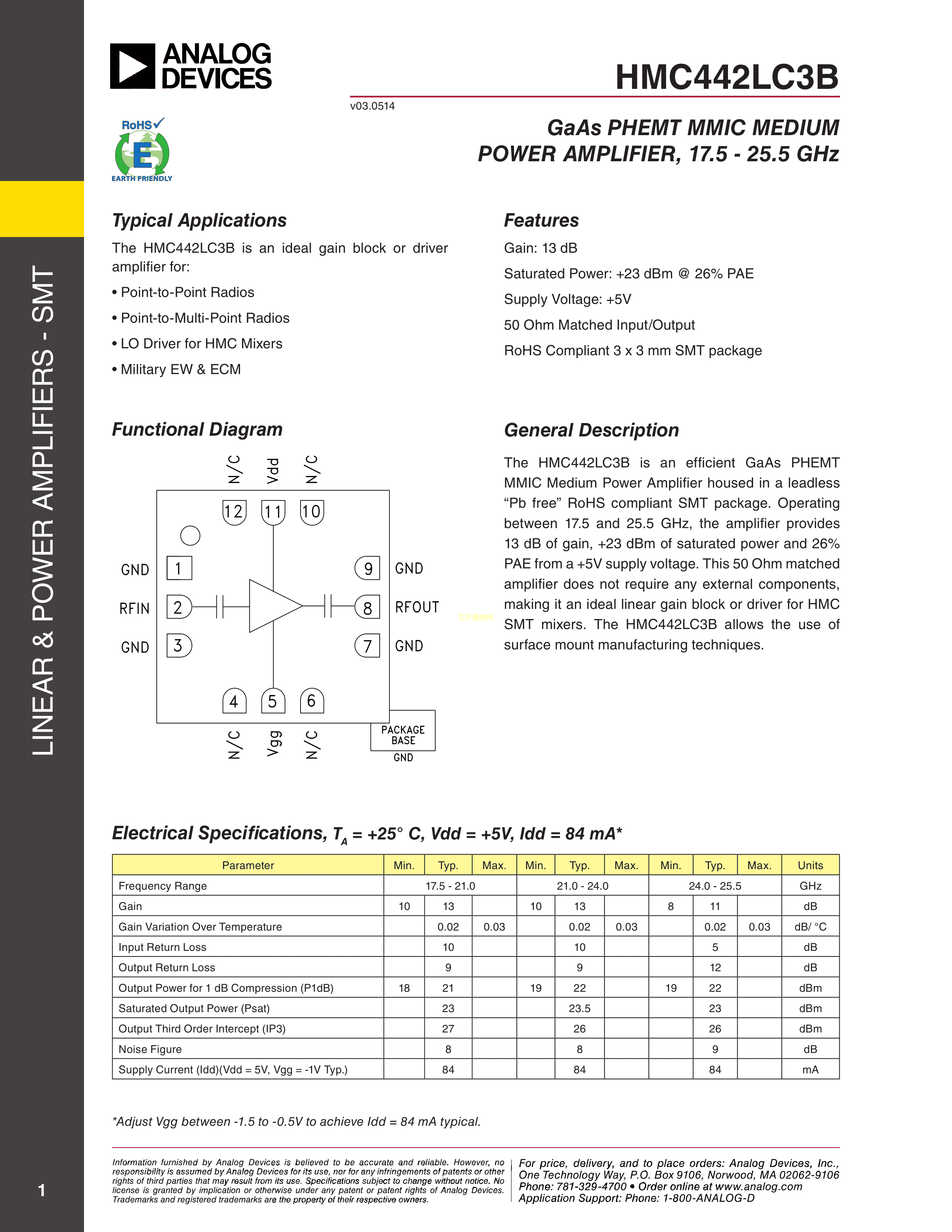 HMC442LC3BTR-R5数据手册SMT-12(3x3)封装ADI(亚德诺)-LINEARPDF规格书,中英文下载
