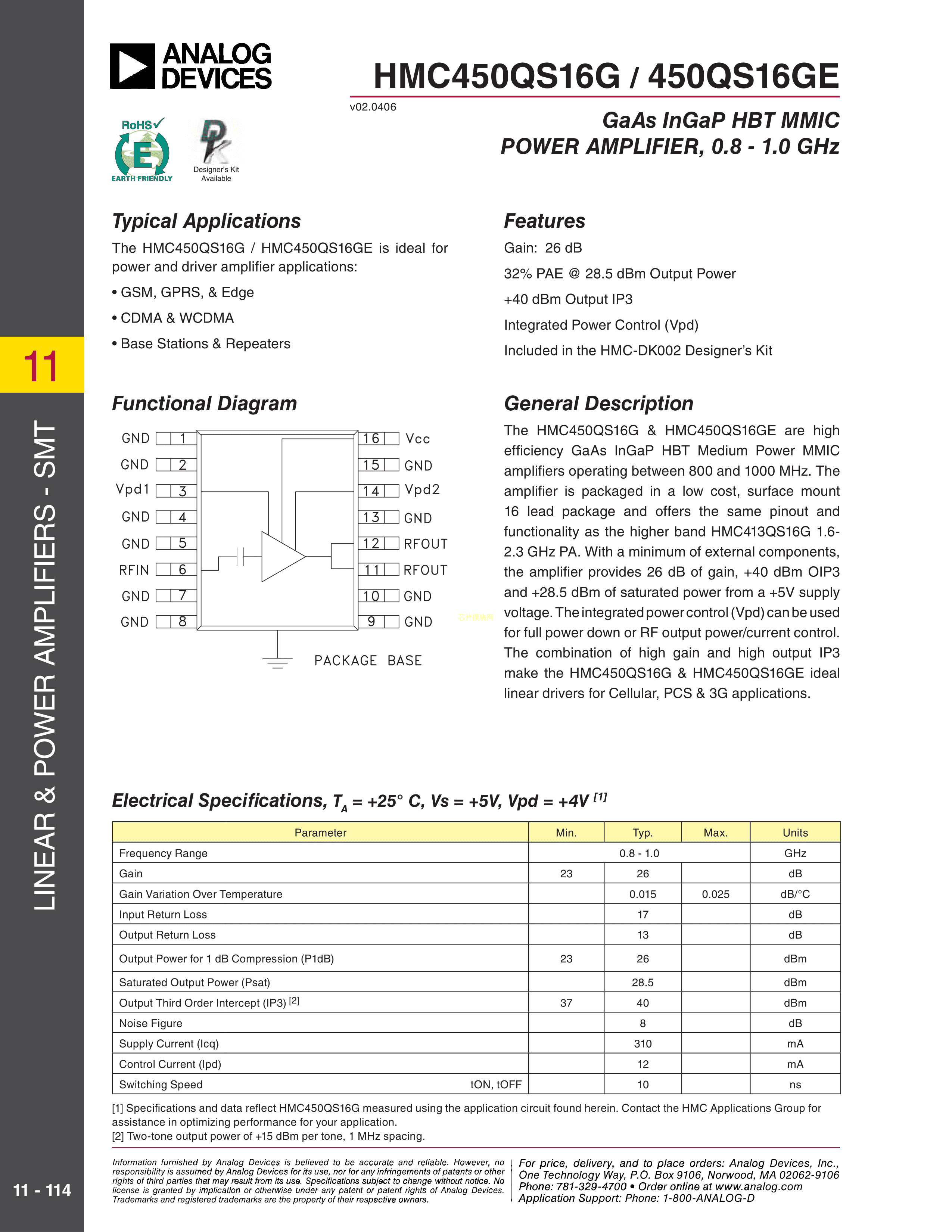HMC450QS16GETR数据手册QSOP-16封装ADI(亚德诺)-LINEARPDF规格书,中英文下载
