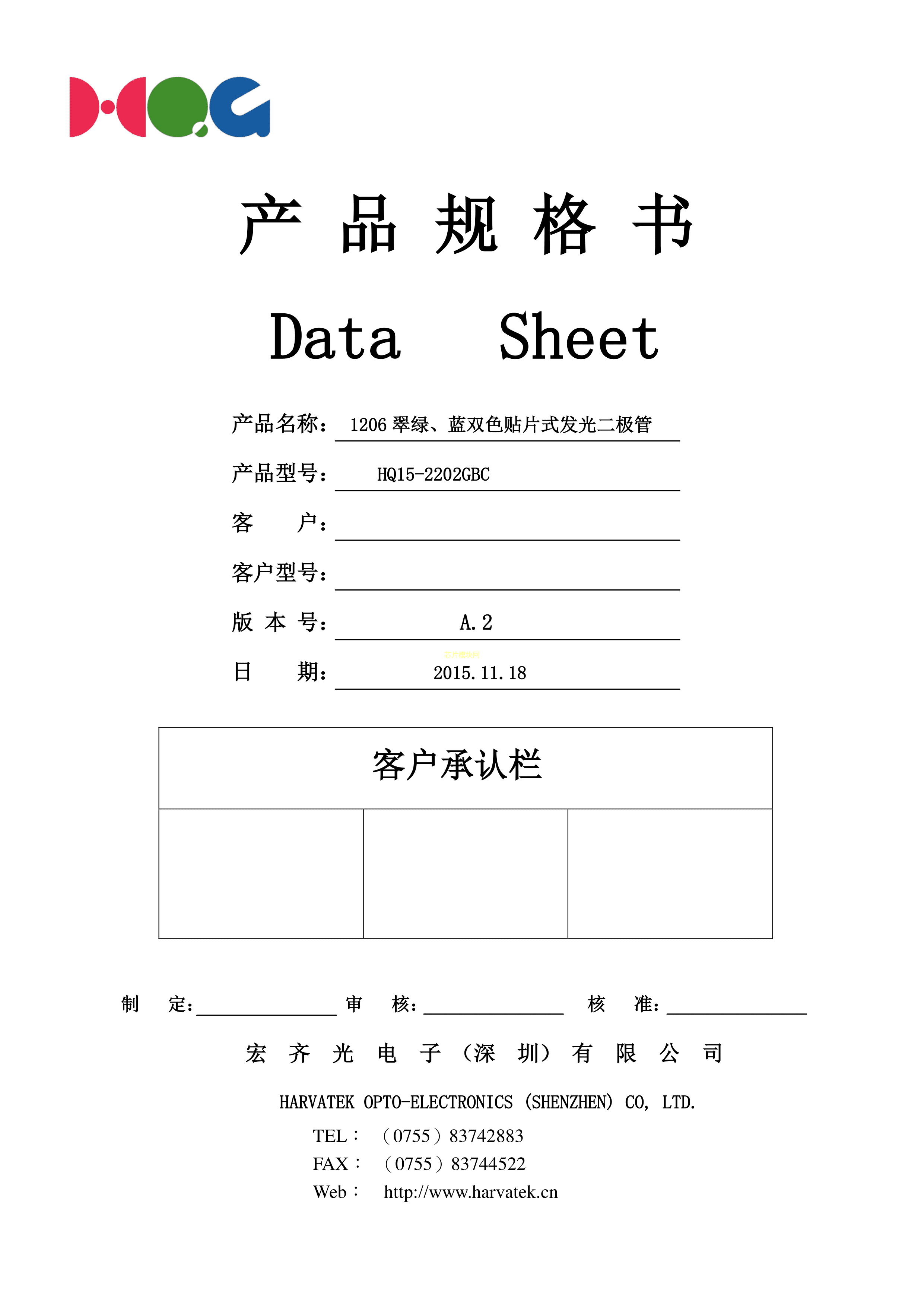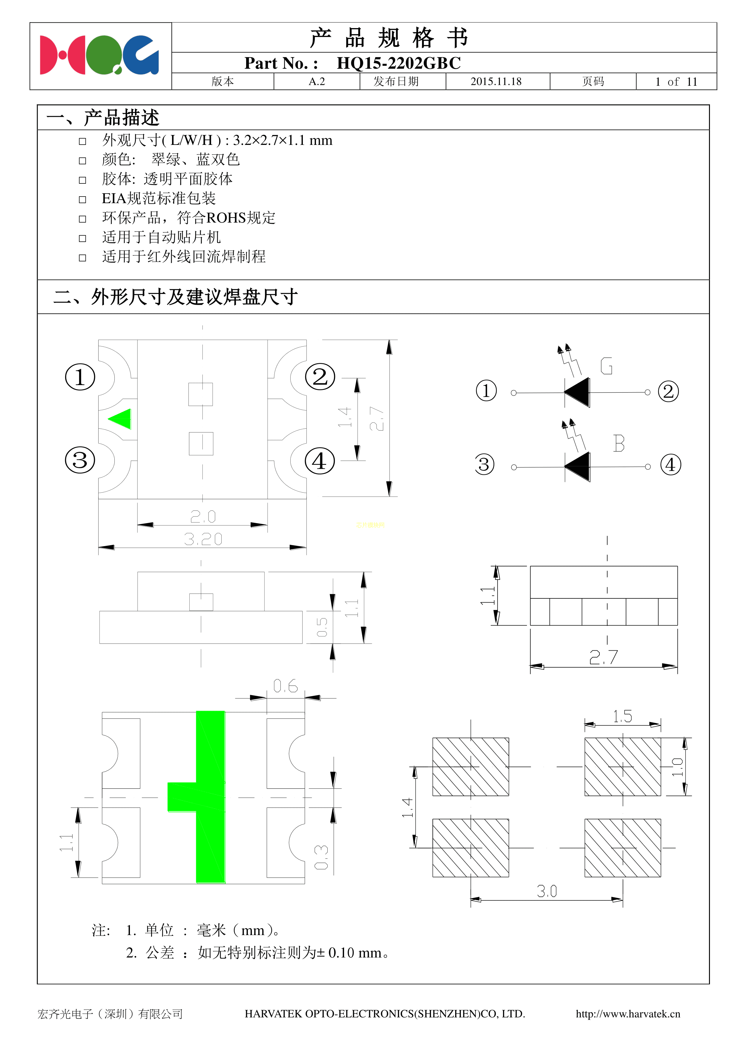 HQ15-2202GBC数据手册SMD3.2x2.7x1.1mm封装宏齐光PDF规格书,中英文下载