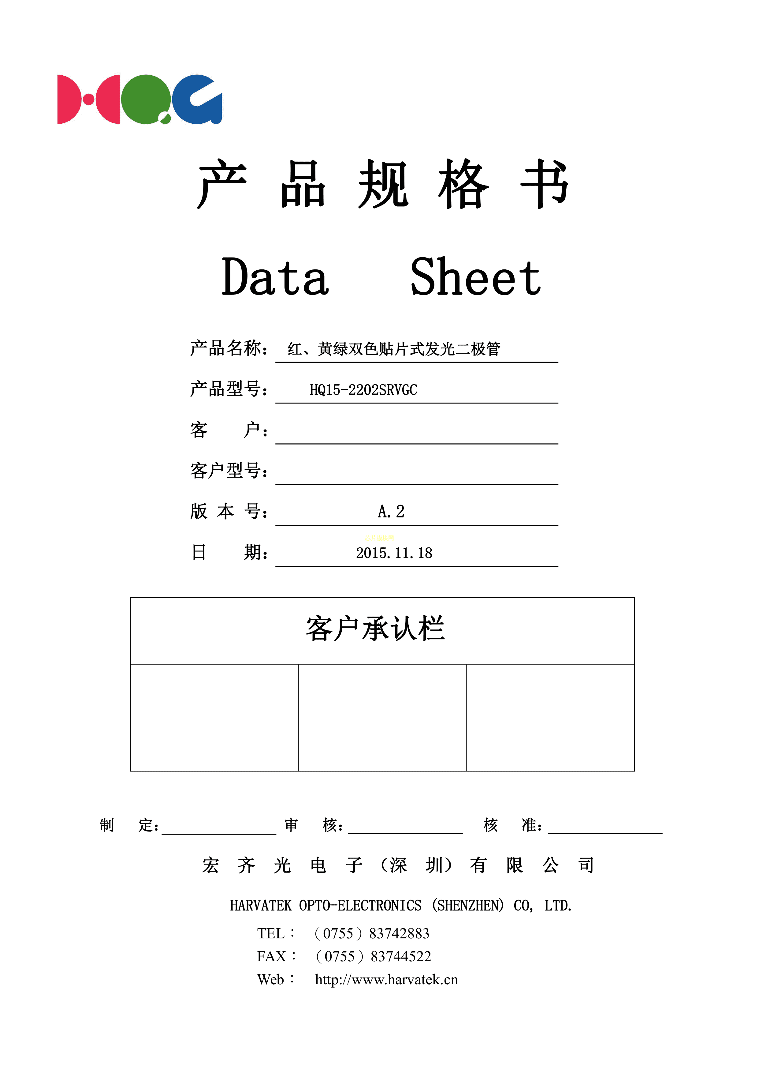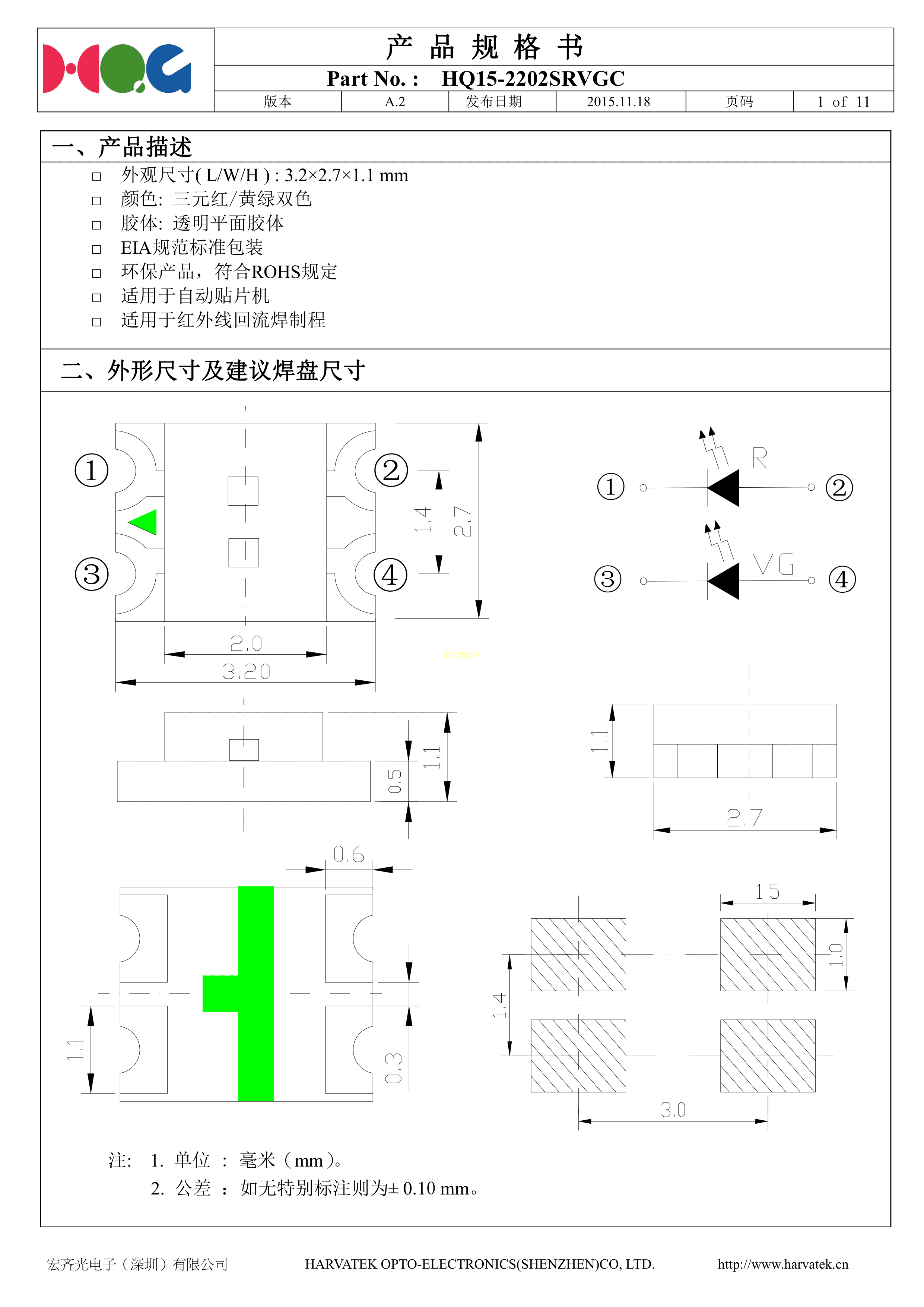 HQ15-2202SRVGC数据手册SMD3.2x2.7x1.1mm封装宏齐光PDF规格书,中英文下载