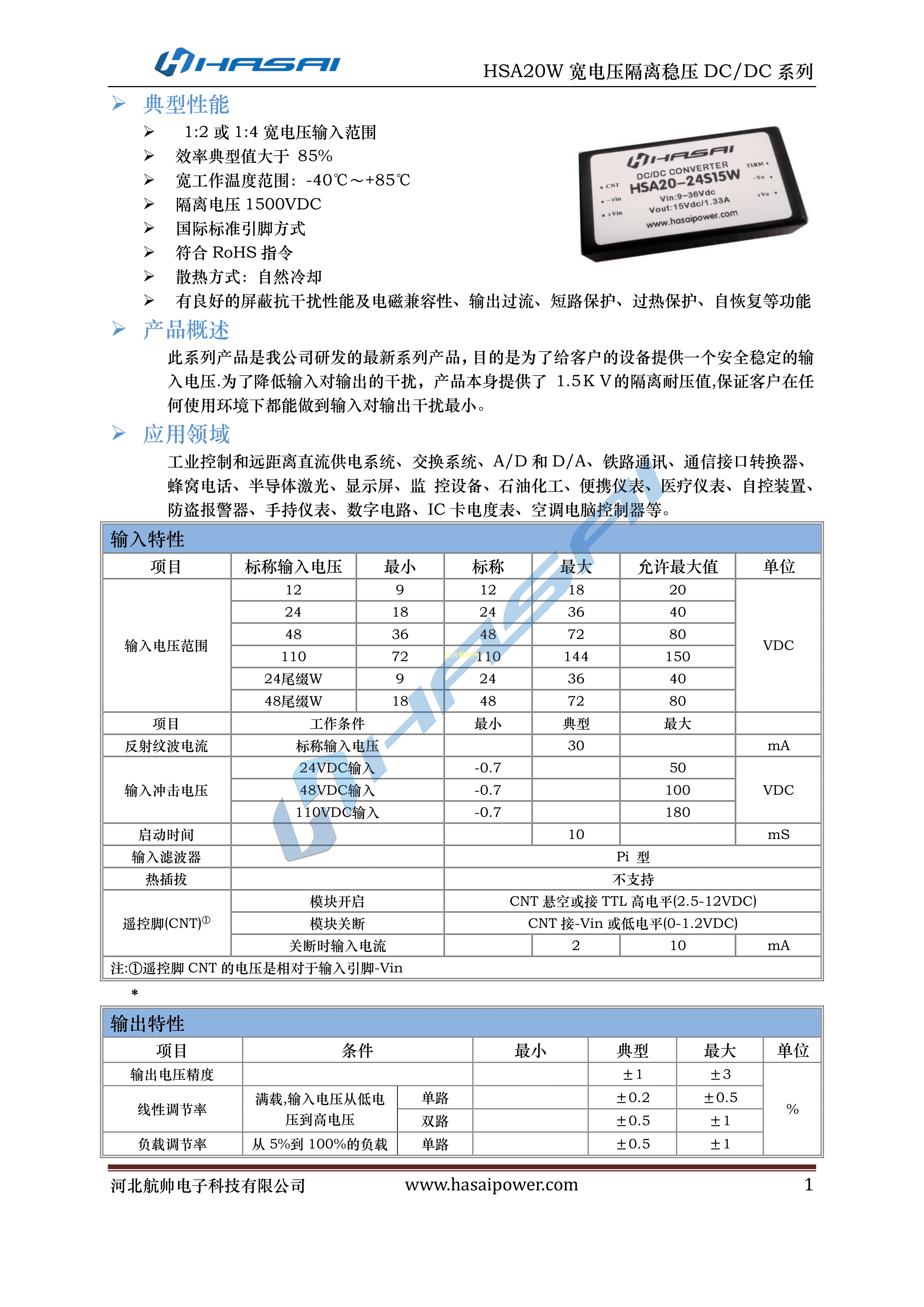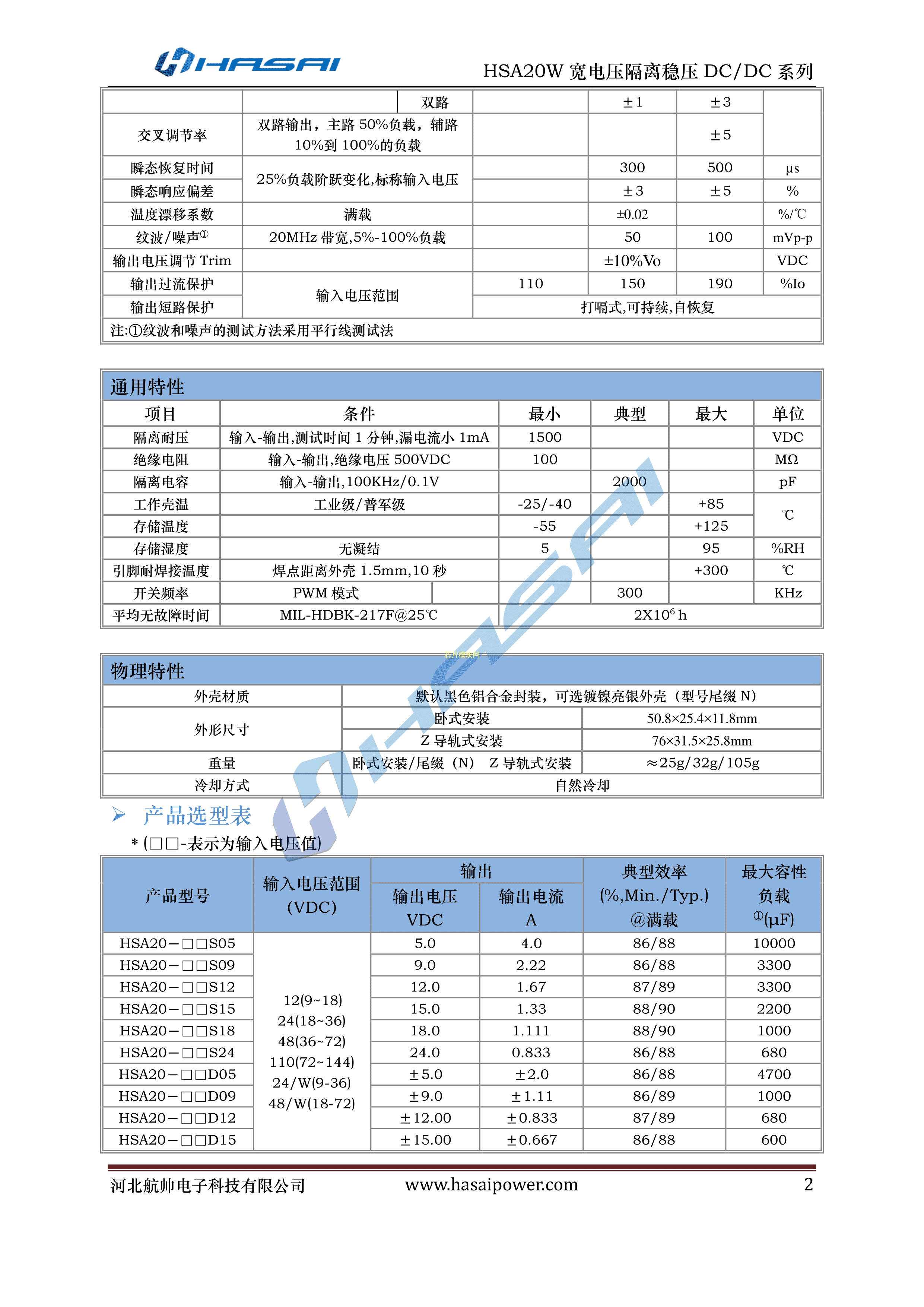 HSA20-48S12W数据手册插件封装HASAI(航帅电源)PDF规格书,中英文下载