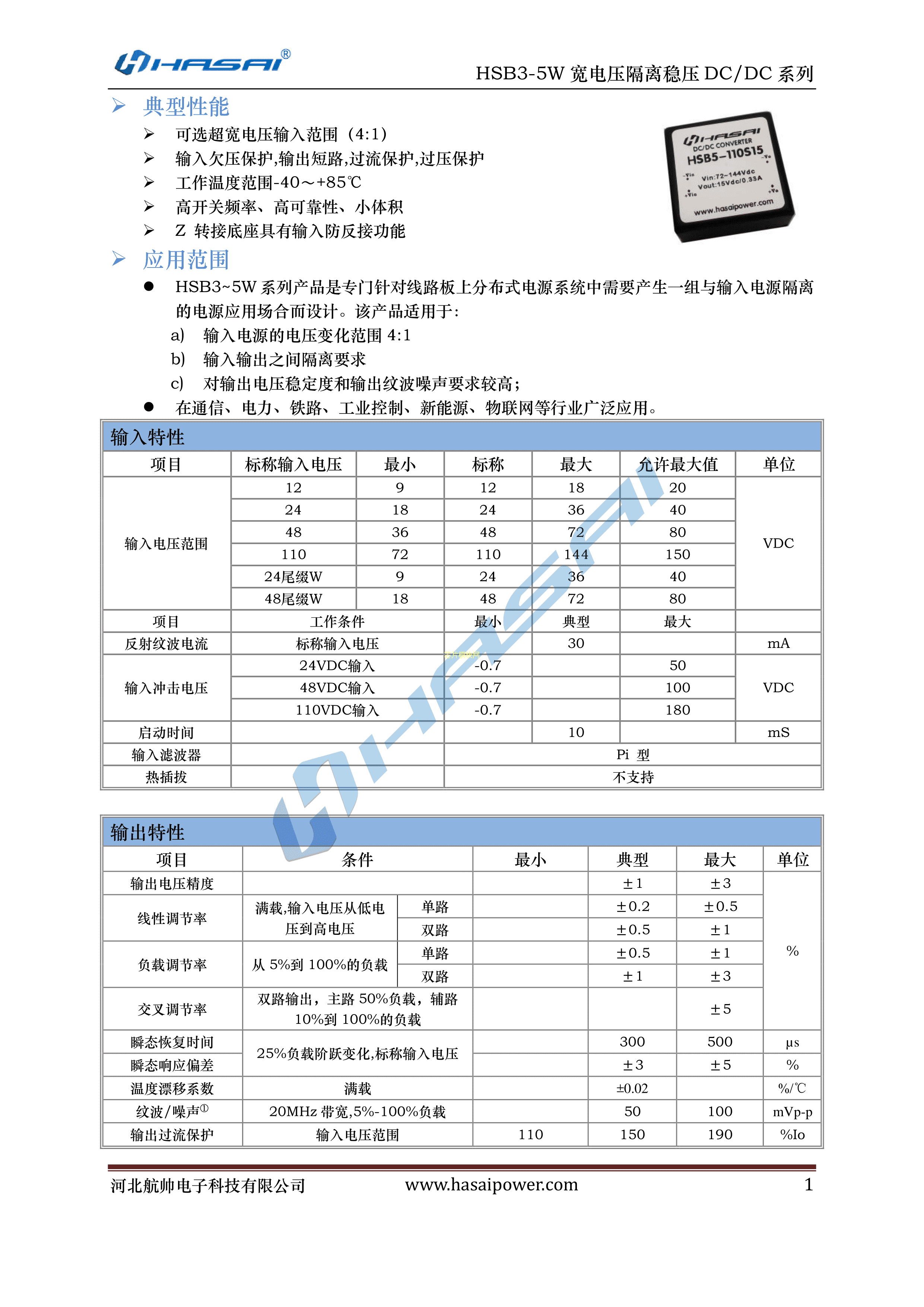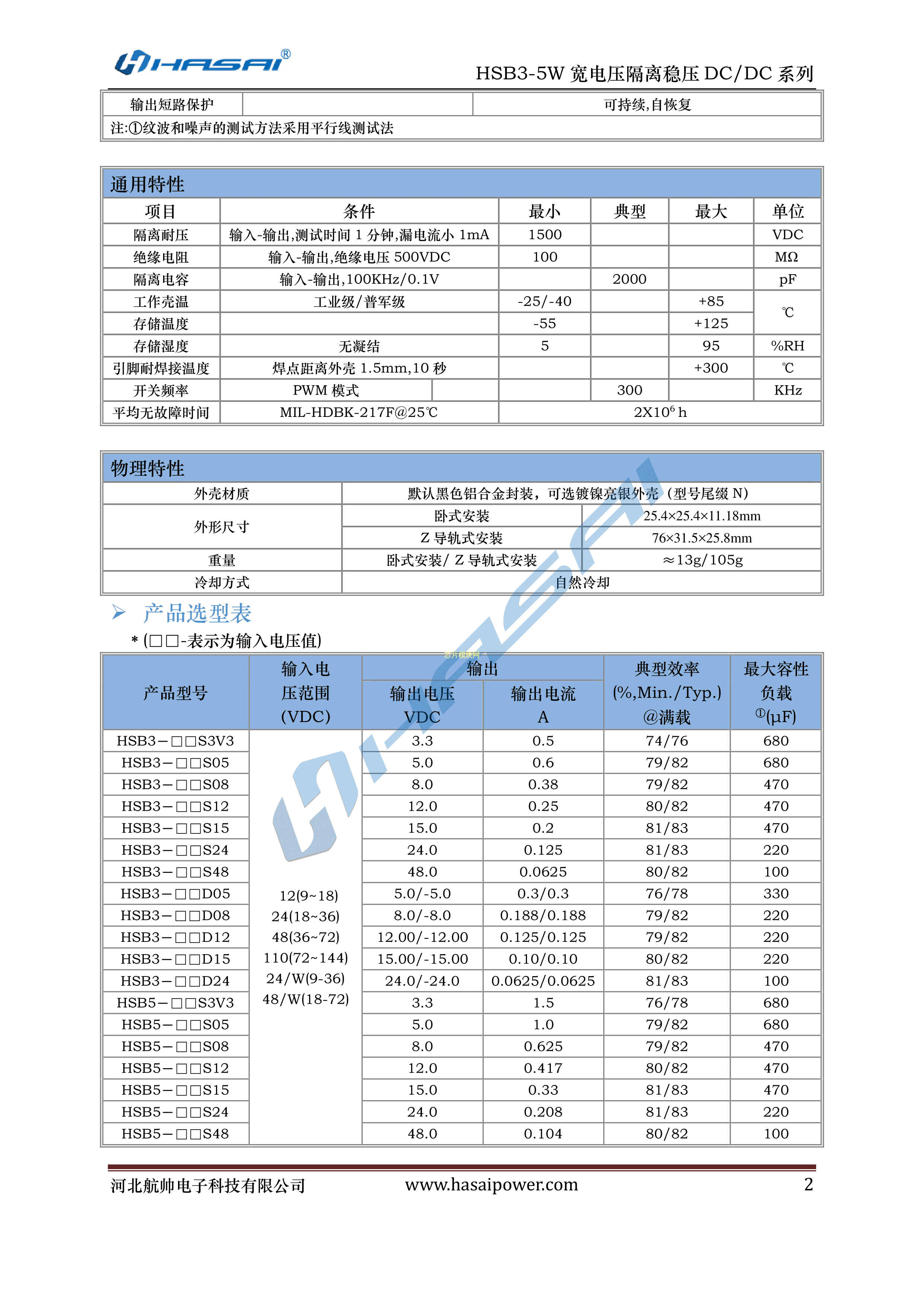 HSB5-48S05数据手册插件封装HASAI(航帅电源)PDF规格书,中英文下载
