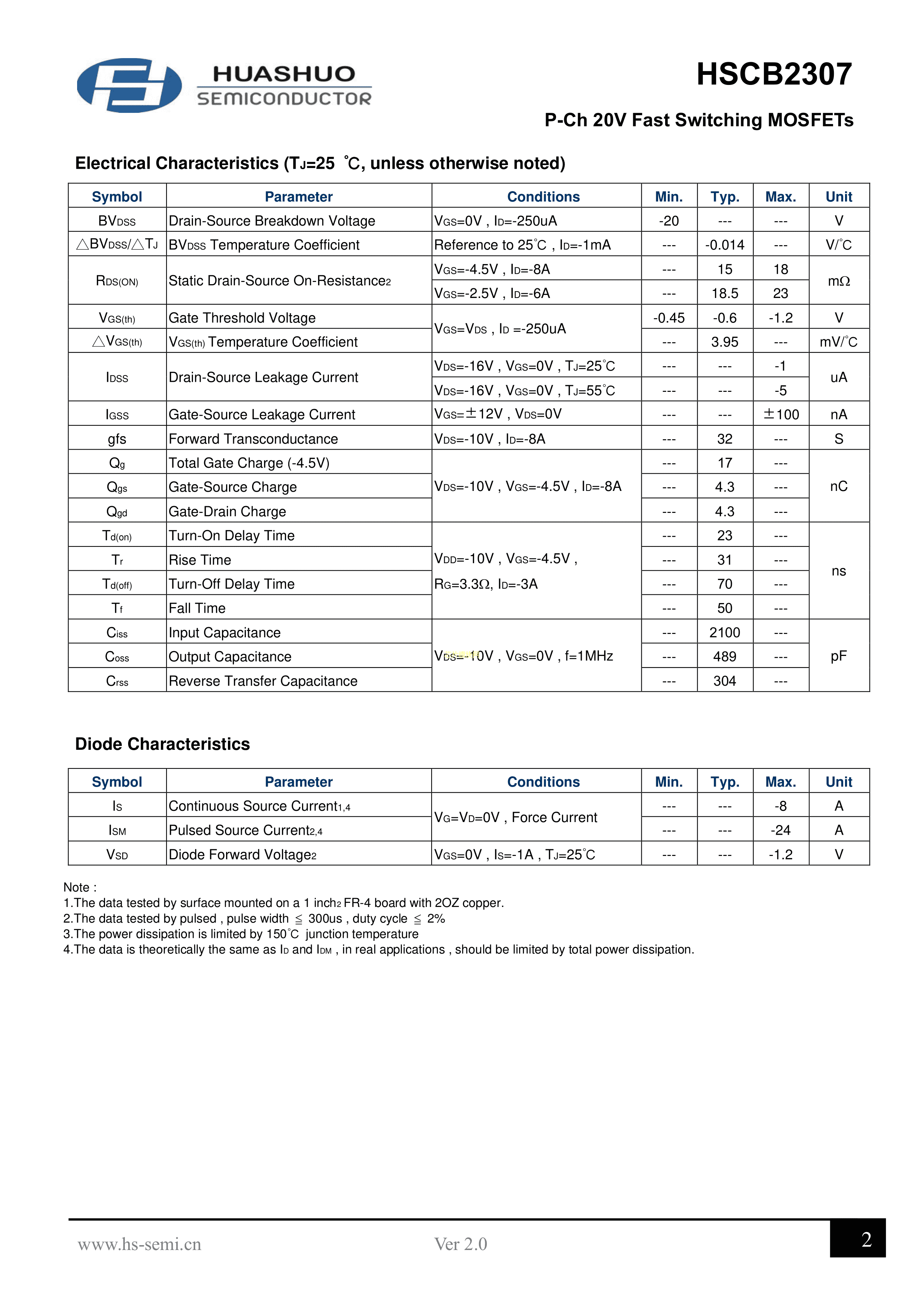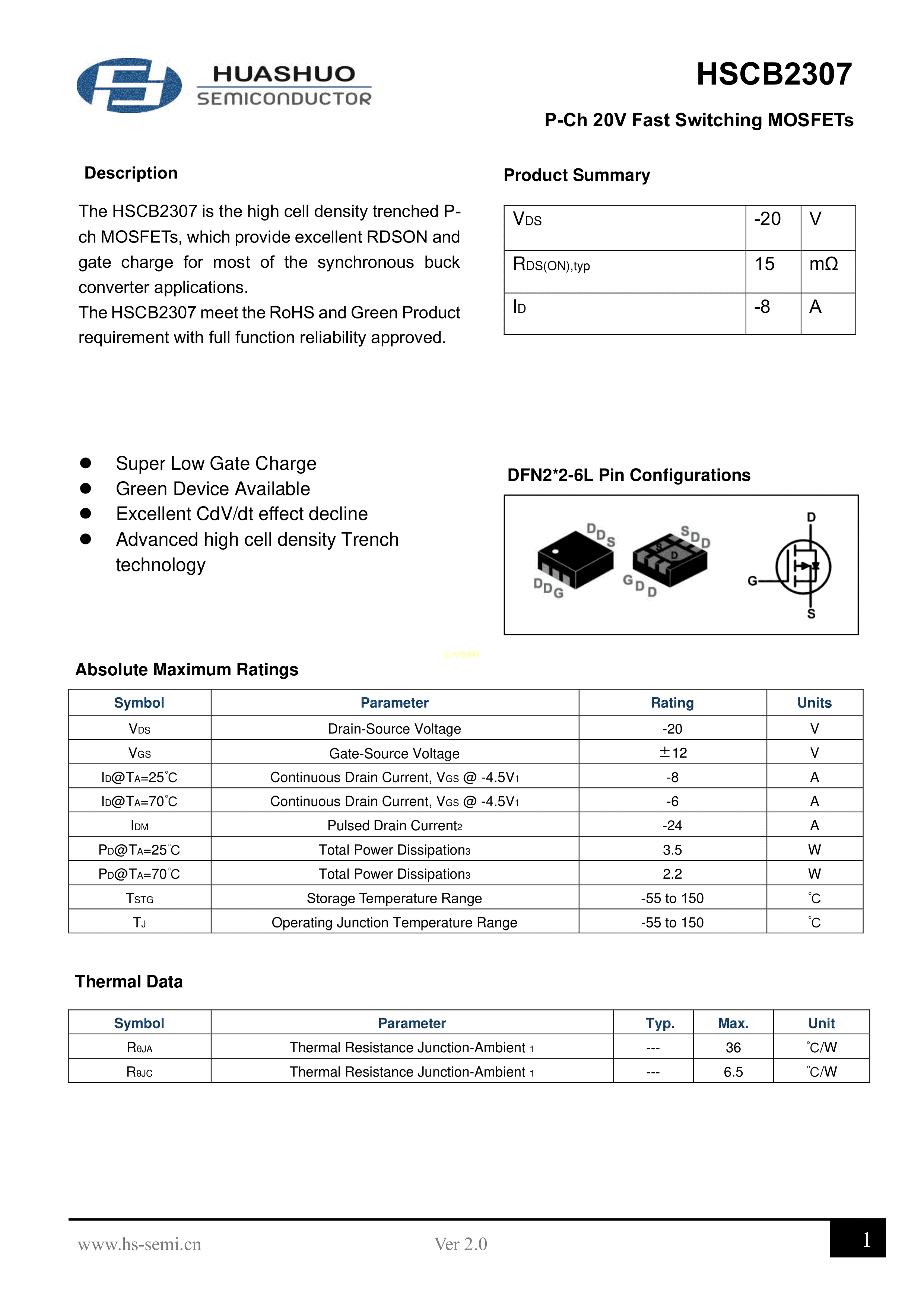 HSCB2307数据手册DFN2x2-6L封装HUASHUO(华朔)PDF规格书,中英文下载