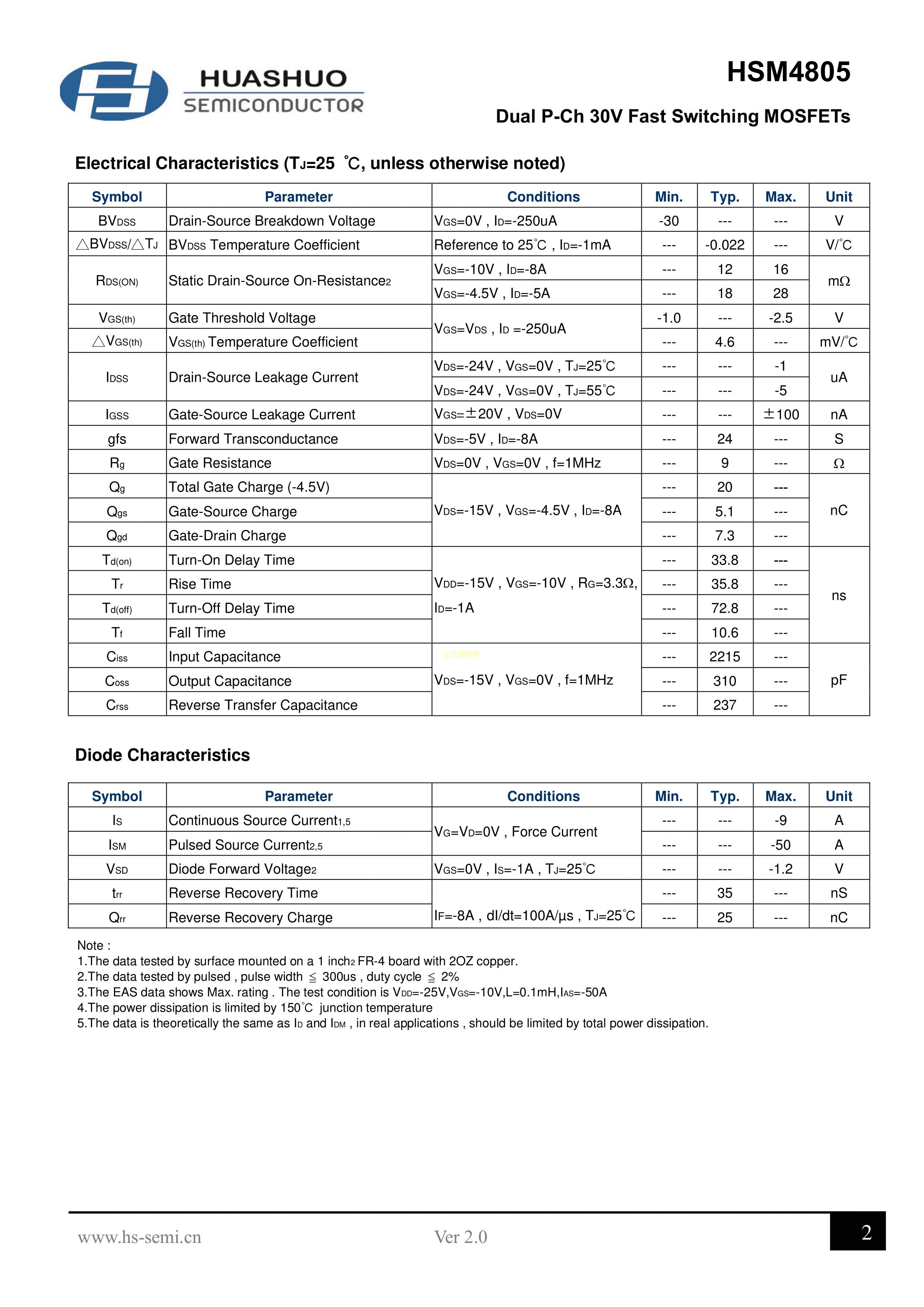 HSM4805数据手册SOP-8封装HUASHUO(华朔)PDF规格书,中英文下载
