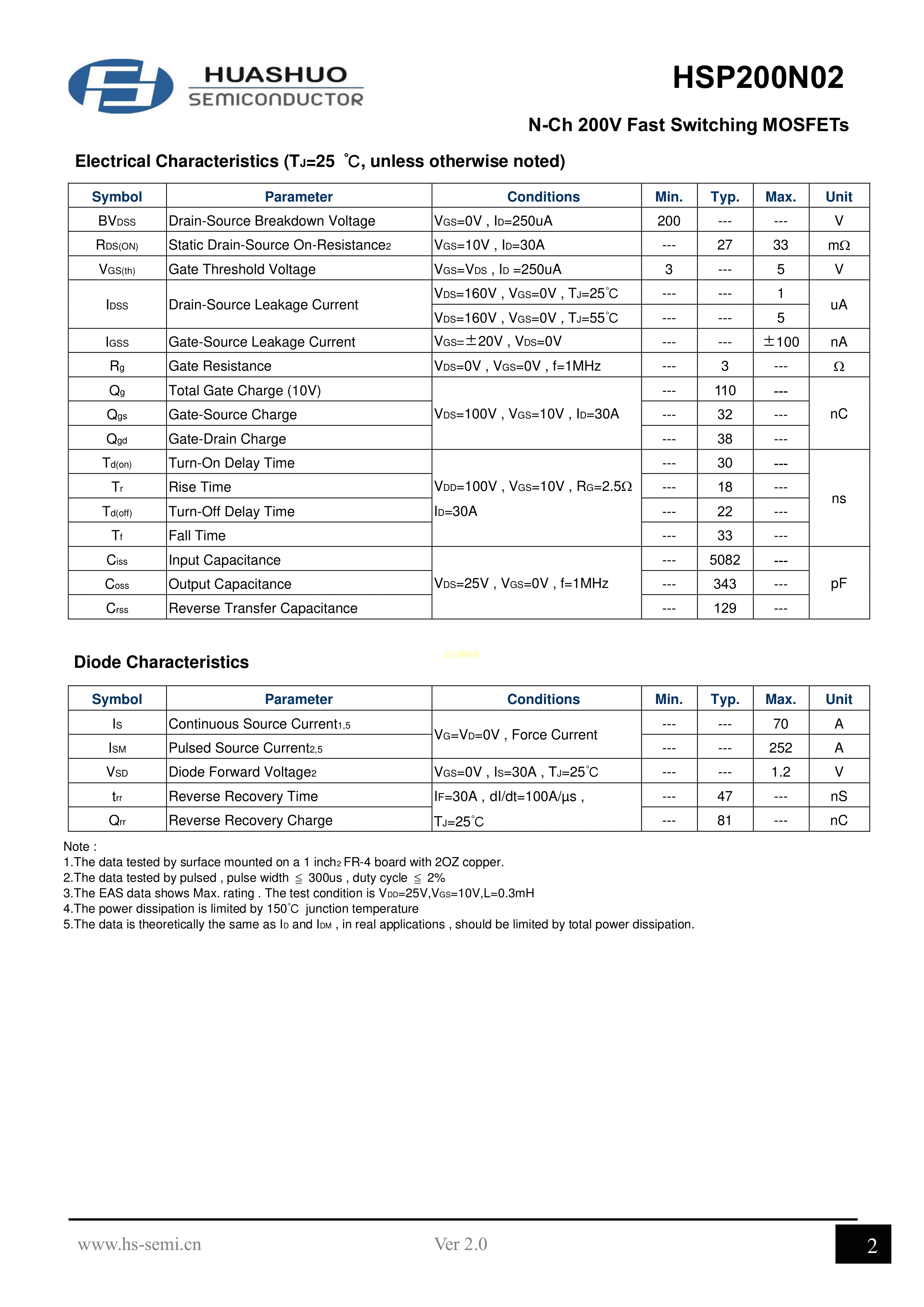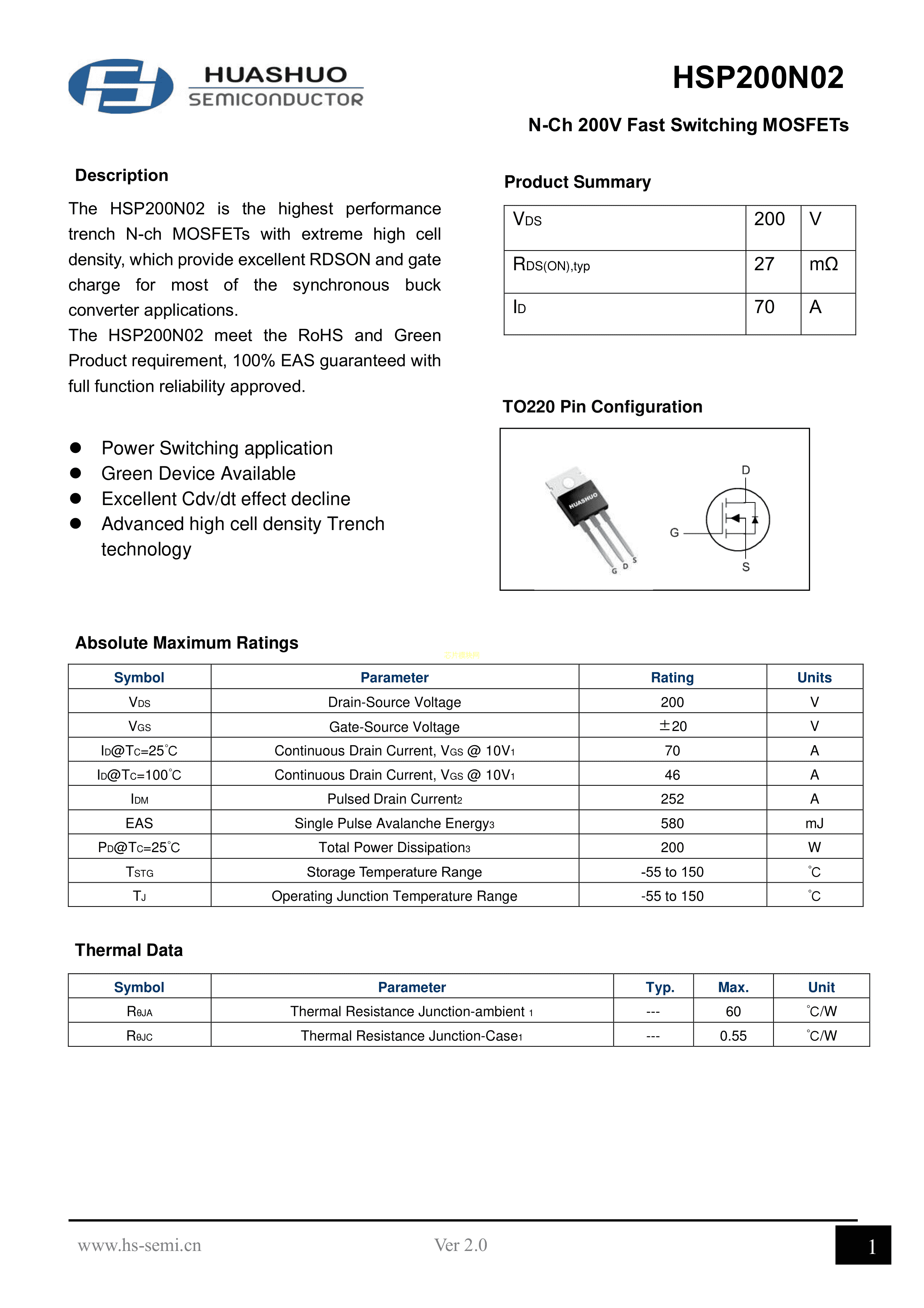 HSP200N02数据手册TO-220封装HUASHUO(华朔)PDF规格书,中英文下载