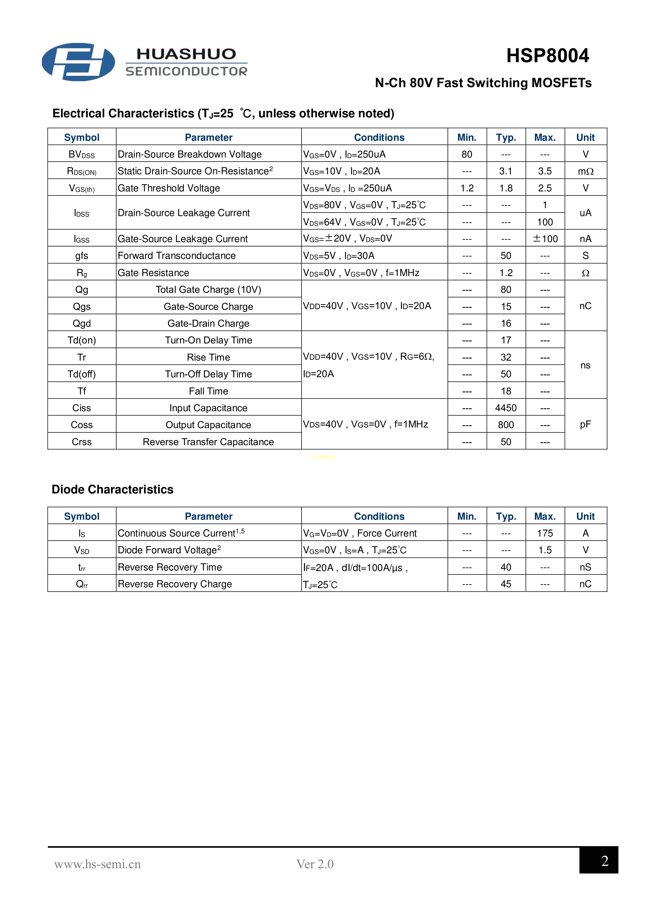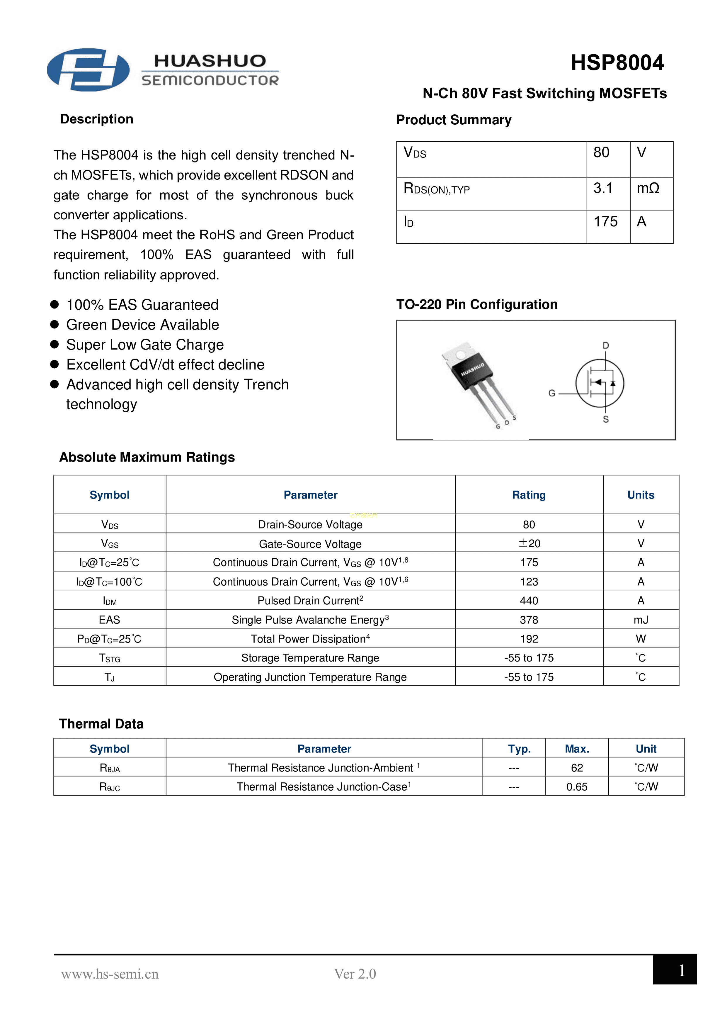 HSP8004数据手册TO-220封装HUASHUO(华朔)PDF规格书,中英文下载