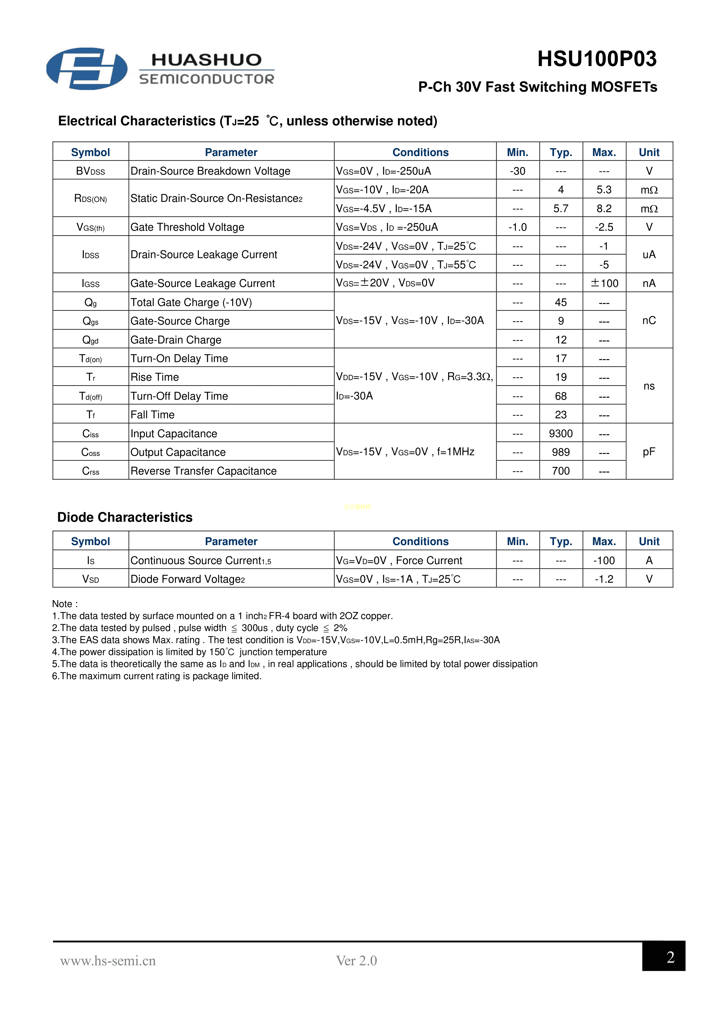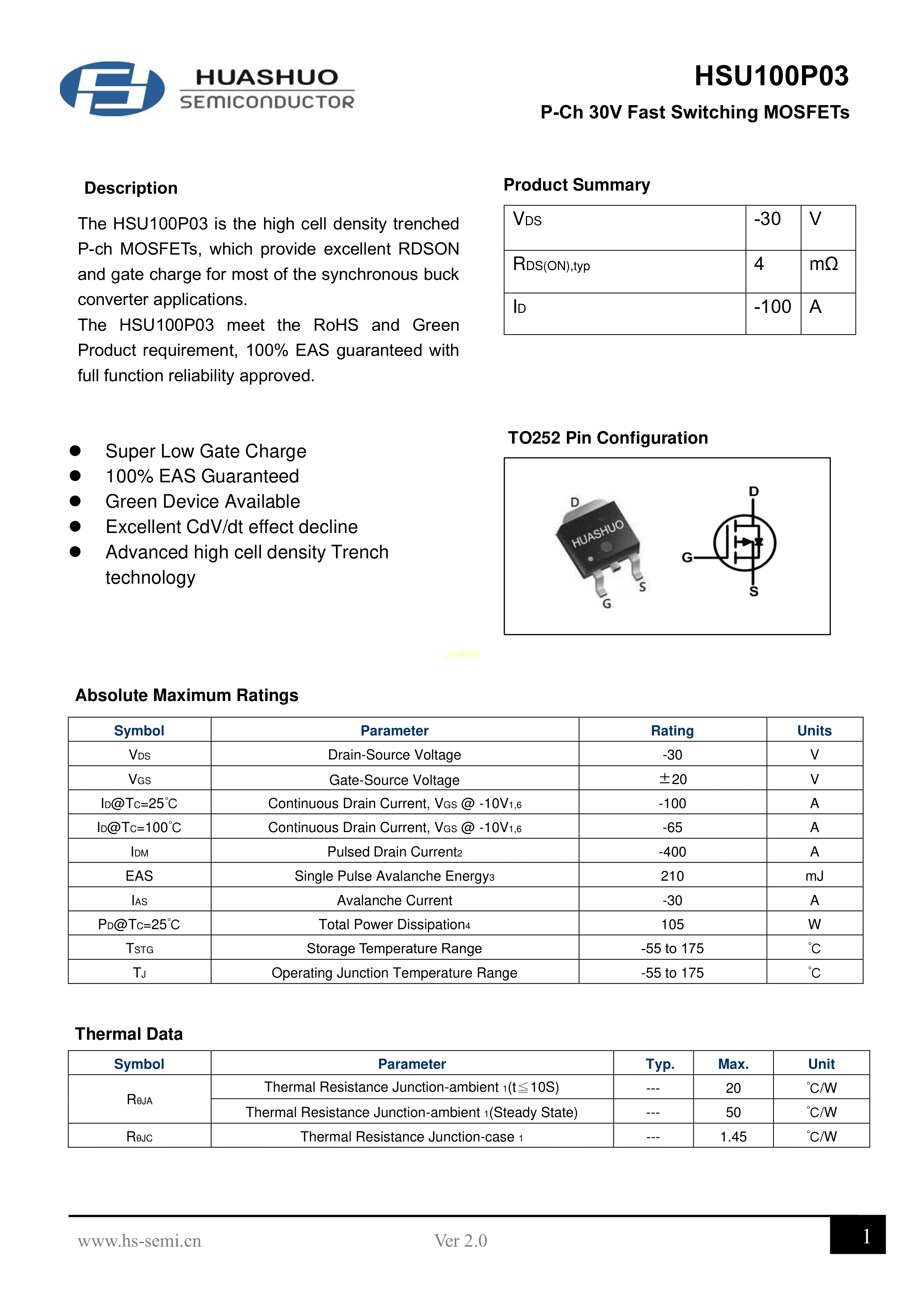 HSU100P03数据手册TO-252封装HUASHUO(华朔)PDF规格书,中英文下载