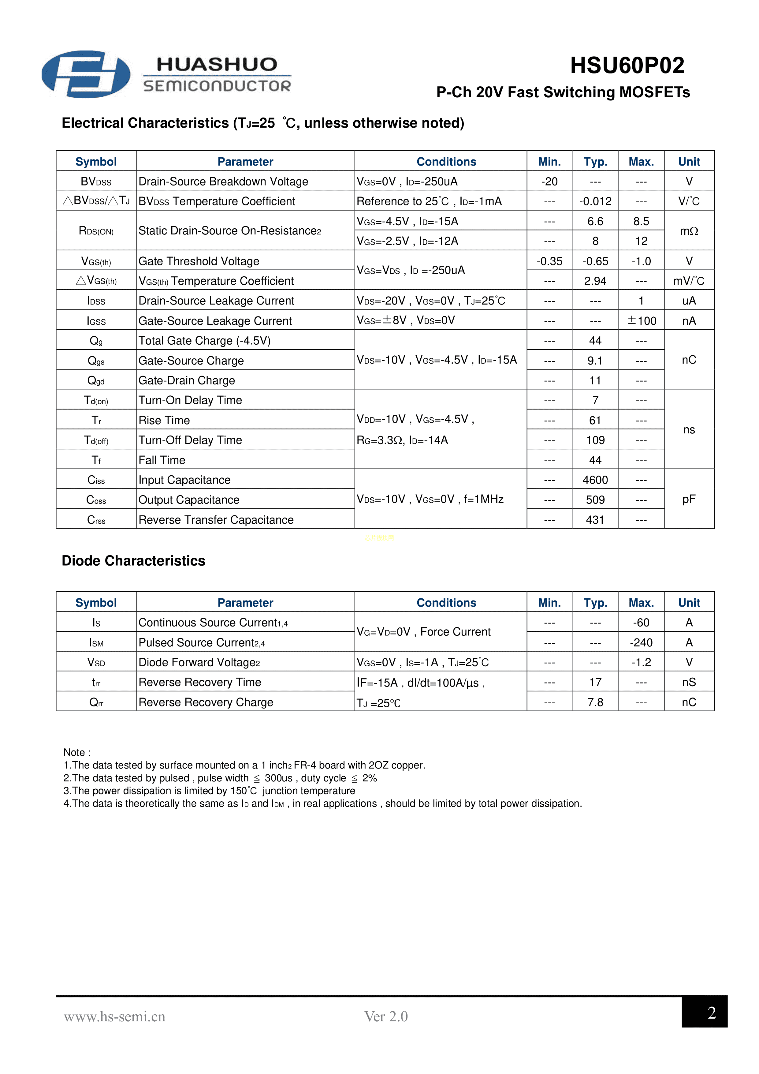 HSU60P02数据手册TO-252封装HUASHUO(华朔)PDF规格书,中英文下载