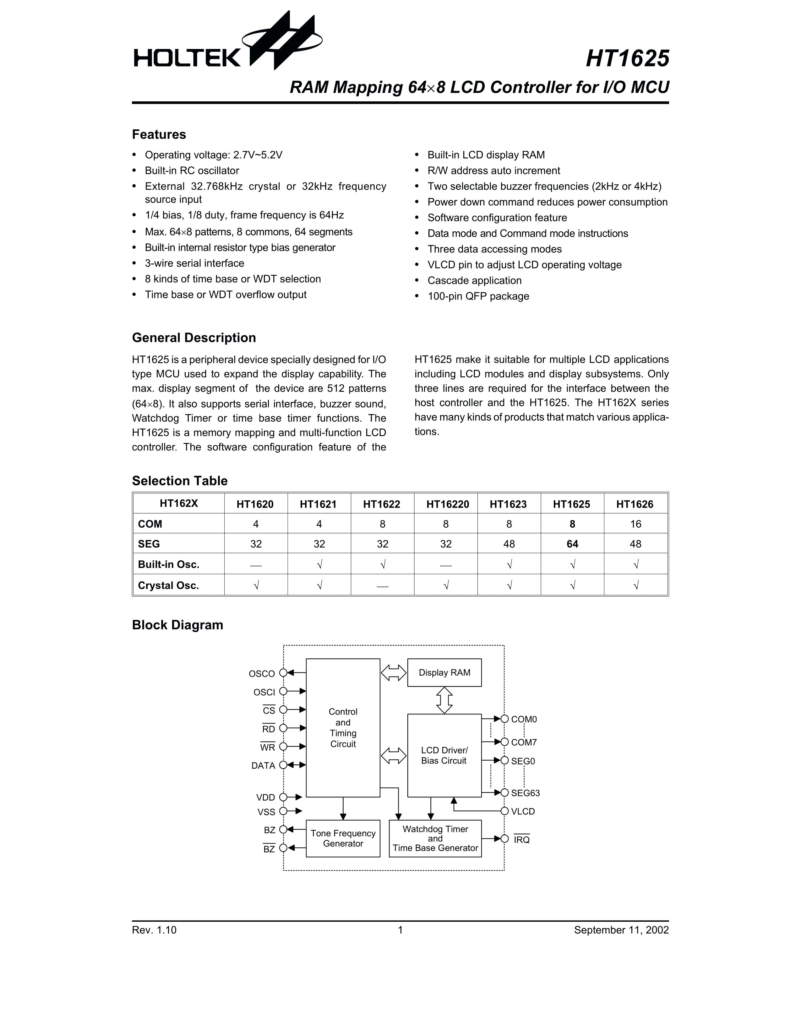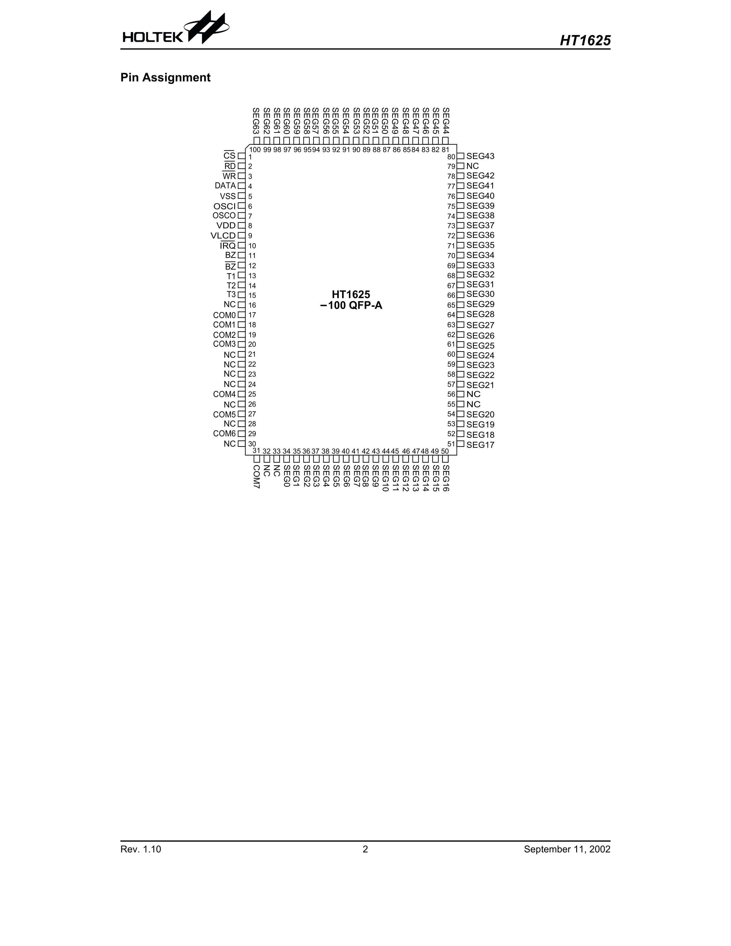 HT1625数据手册QFP-100封装HOLTEK(台湾合泰-盛群)PDF规格书,中英文下载