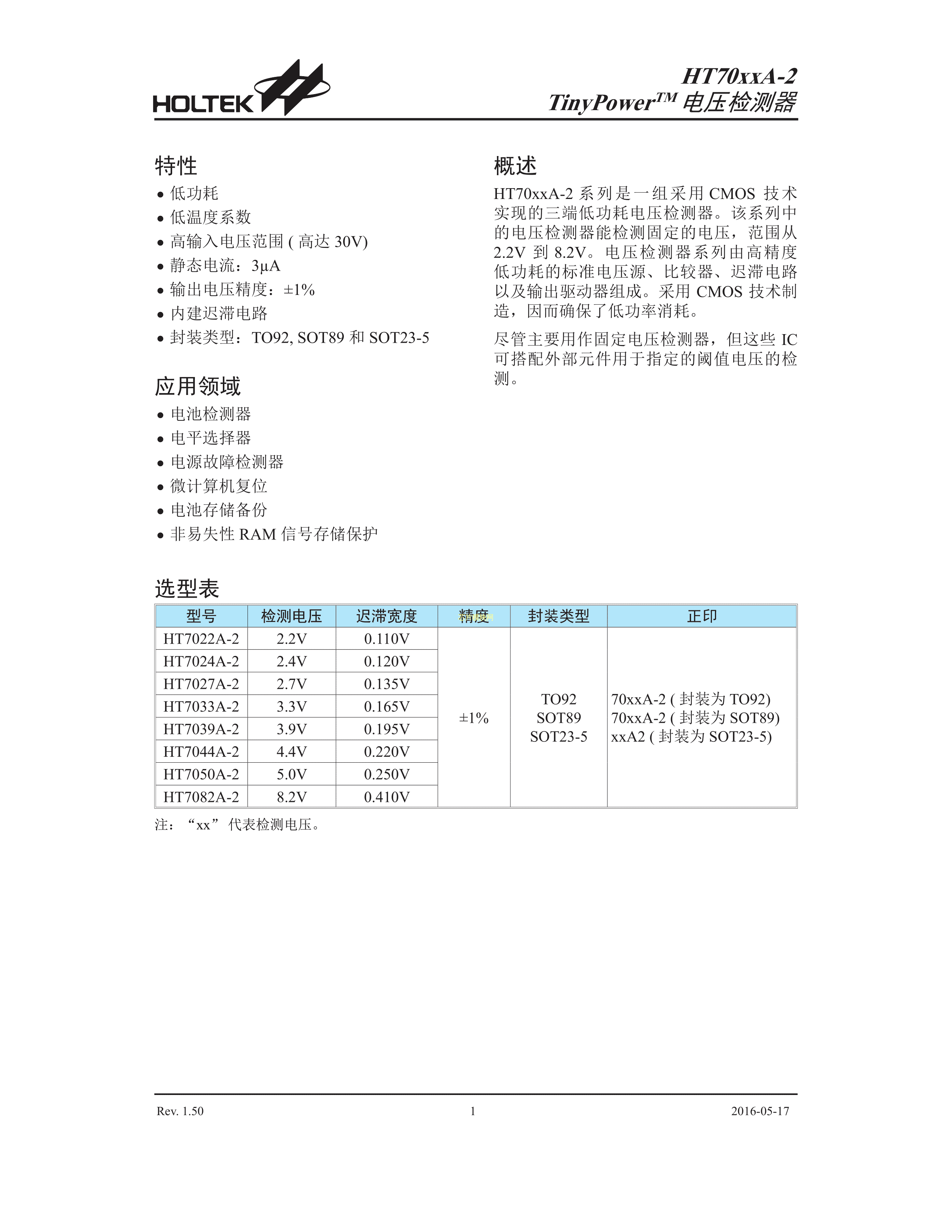 HT7027A-2数据手册SOT-89(SOT-89-3)封装HOLTEK(台湾合泰-盛群)PDF规