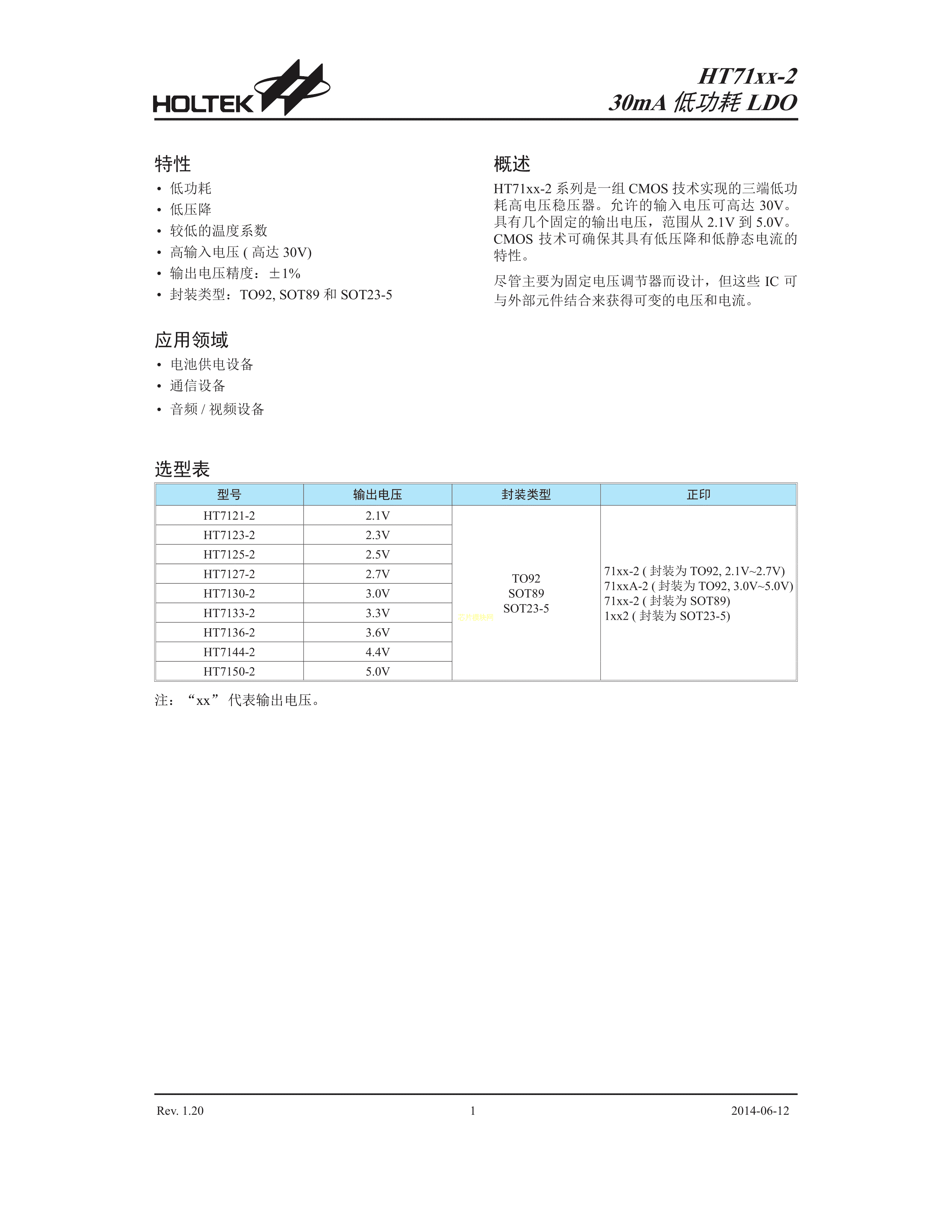 HT7123-2数据手册SOT-23-5封装HOLTEK(台湾合泰-盛群)PDF规格书,中英文下载