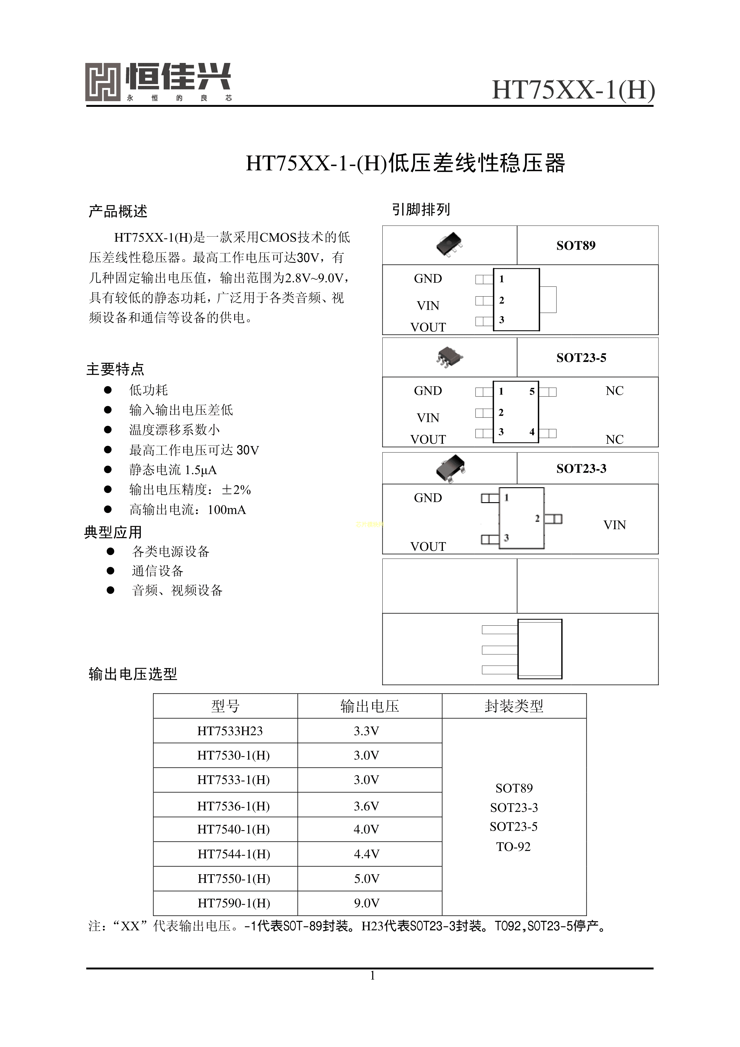 HT7533-1(H)数据手册SOT-89封装HX(恒佳兴)PDF规格书,中英文下载