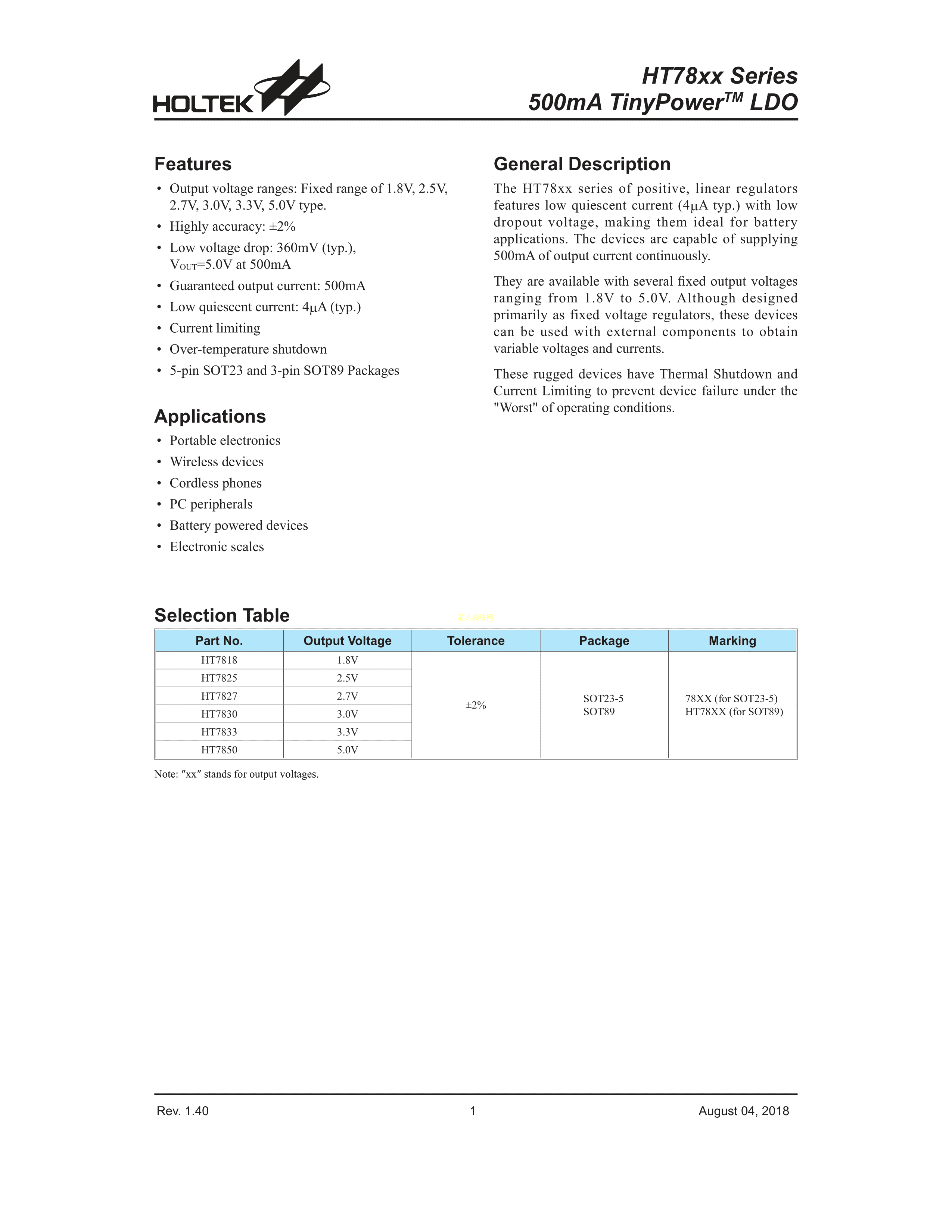 HT7827数据手册SOT-23-5封装HOLTEK(台湾合泰-盛群)PDF规格书,中英文下载