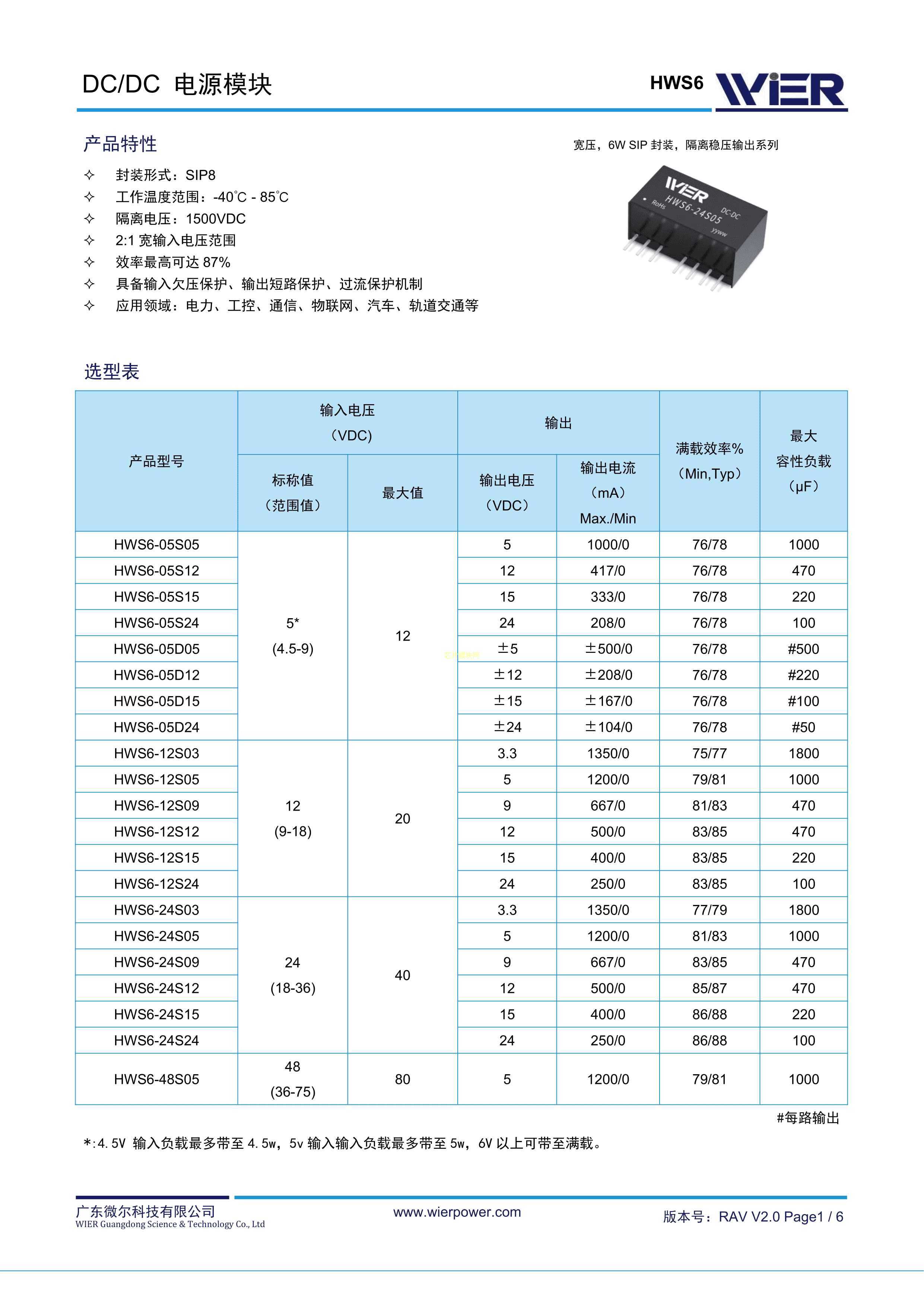 HWS6-05D15数据手册SIP-8封装WIER(微尔)PDF规格书,中英文下载