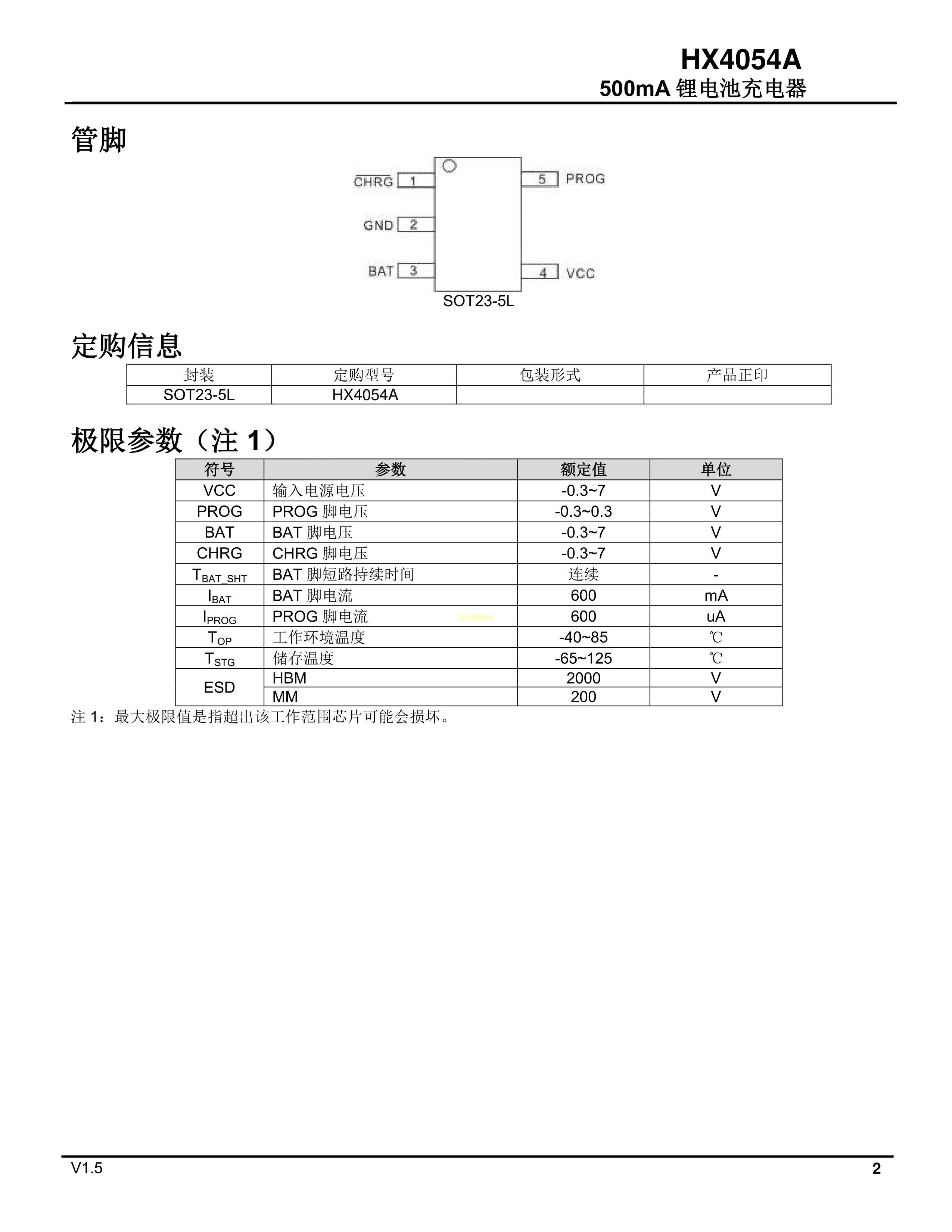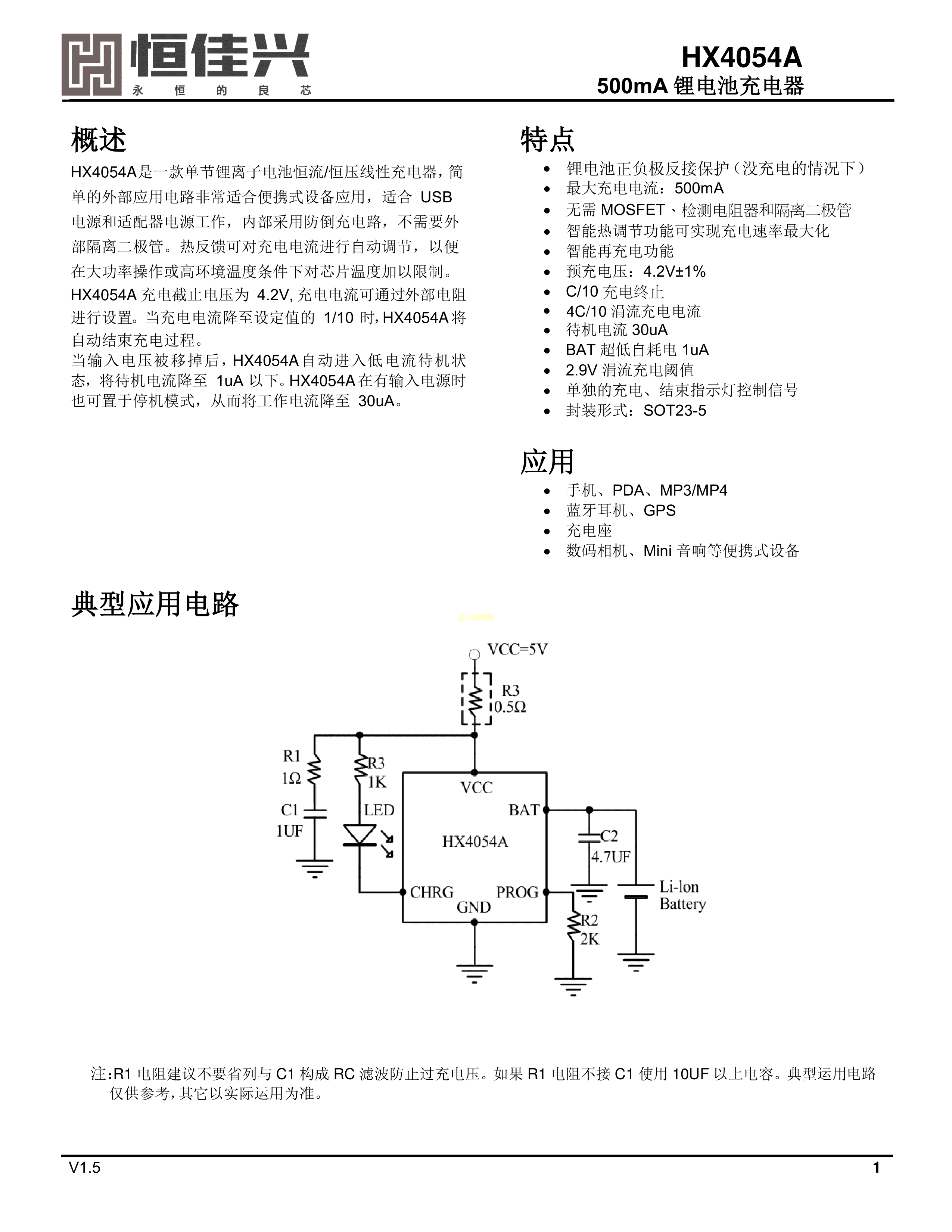 HX4054A数据手册SOT-23-5封装HX(恒佳兴)PDF规格书,中英文下载