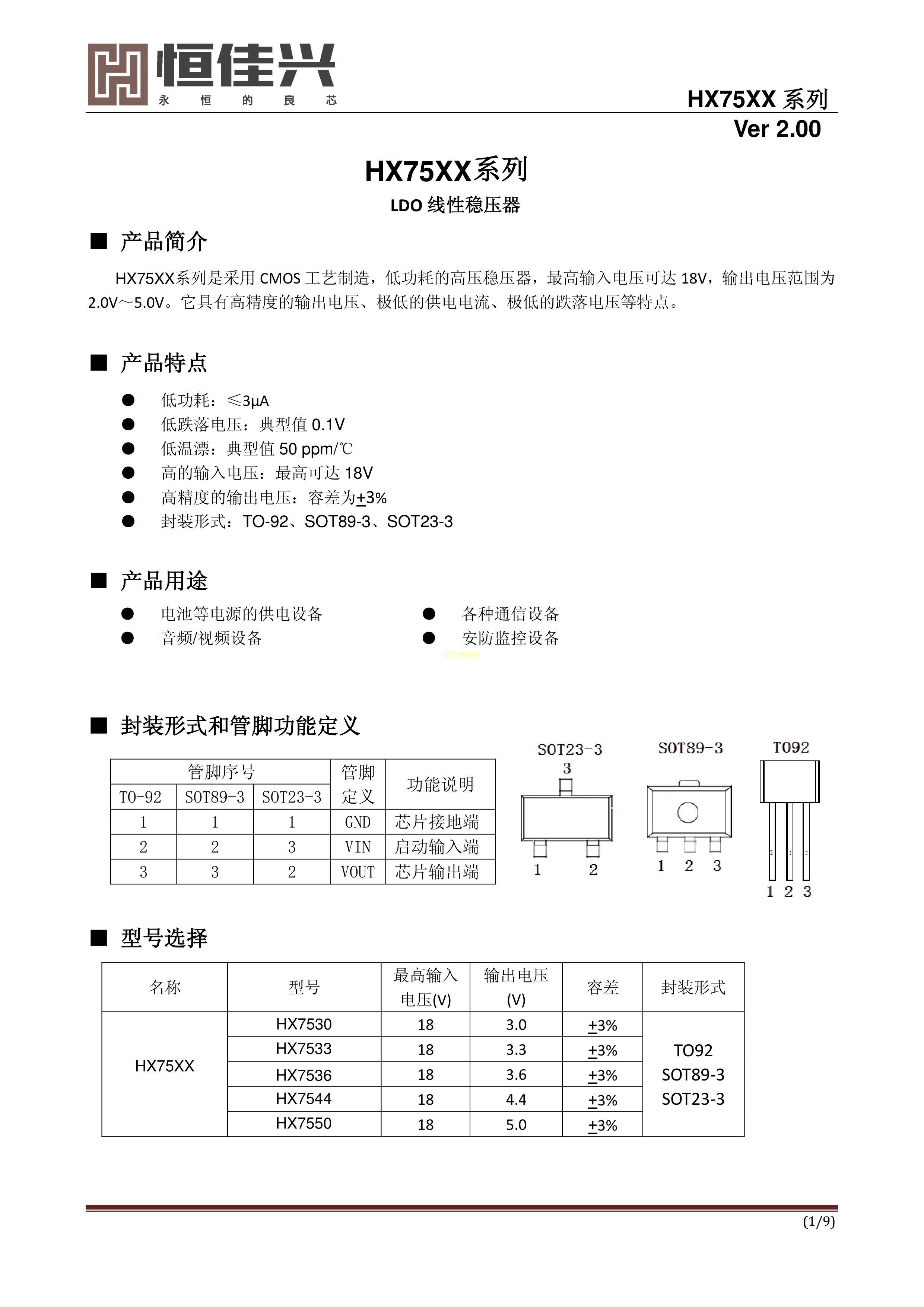 HX7533数据手册SOT-89封装HX(恒佳兴)PDF规格书,中英文下载