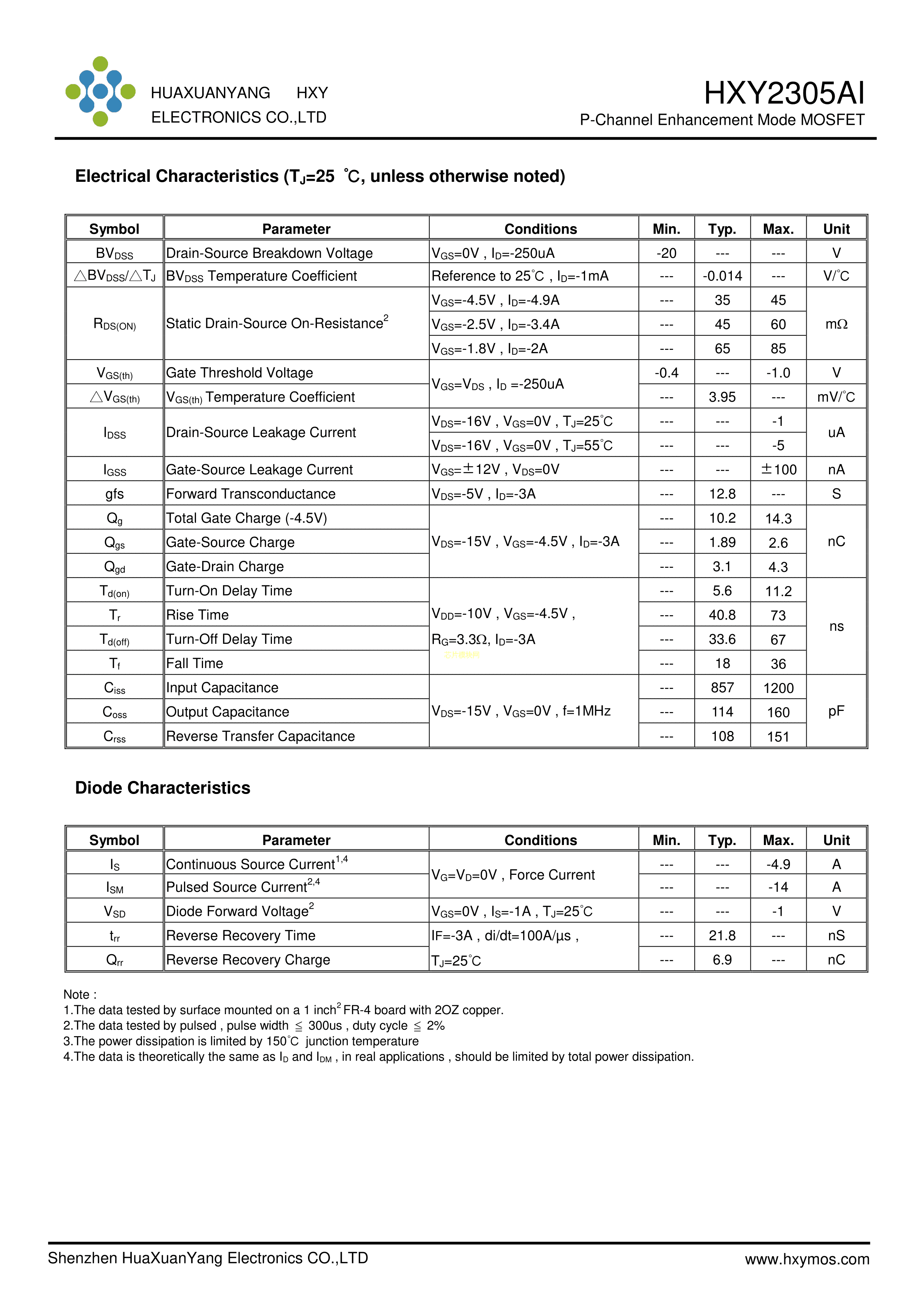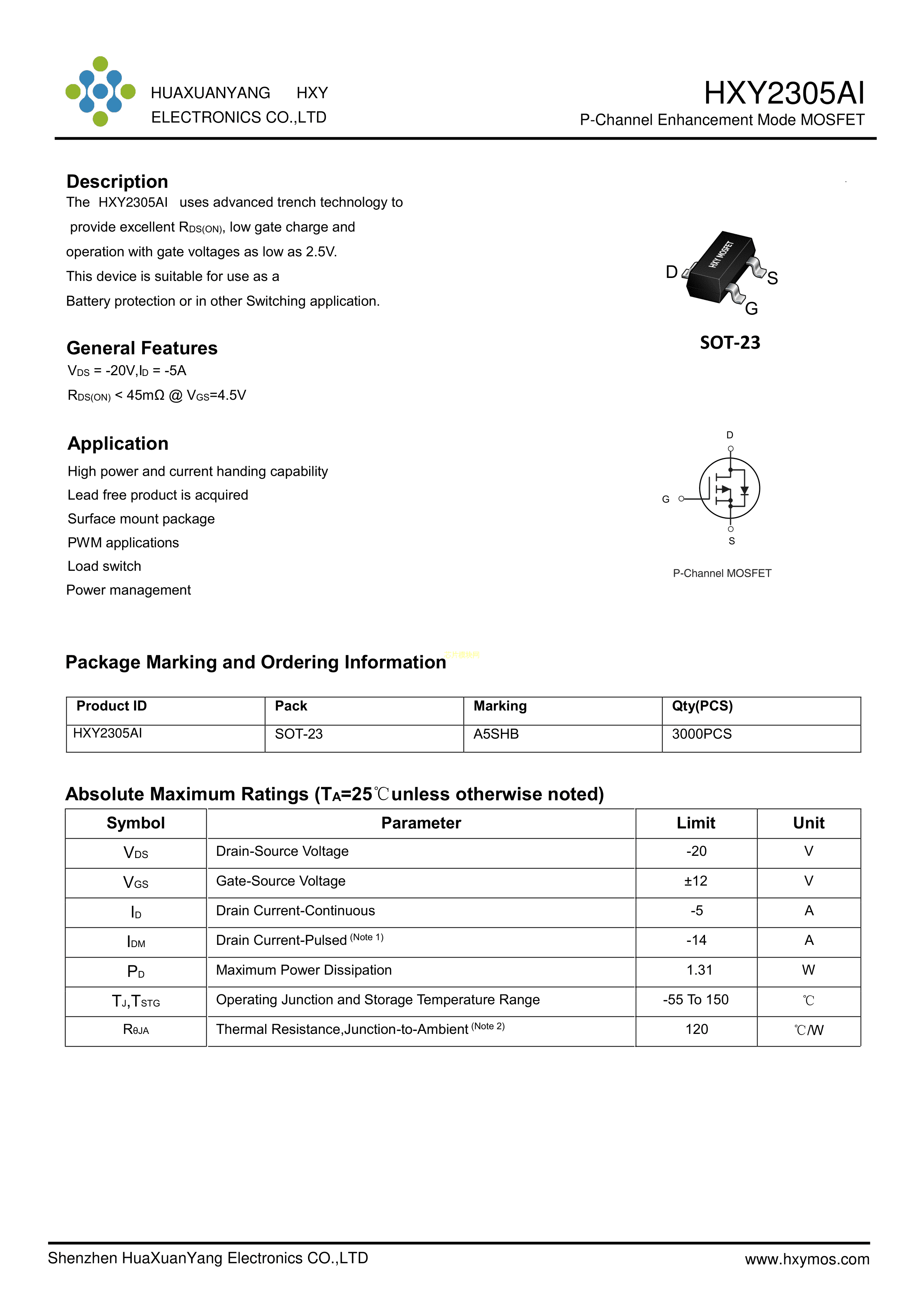 HXY2305AI数据手册SOT-23封装HXYMOSFET(华轩阳电子)PDF规格书,中英文下载
