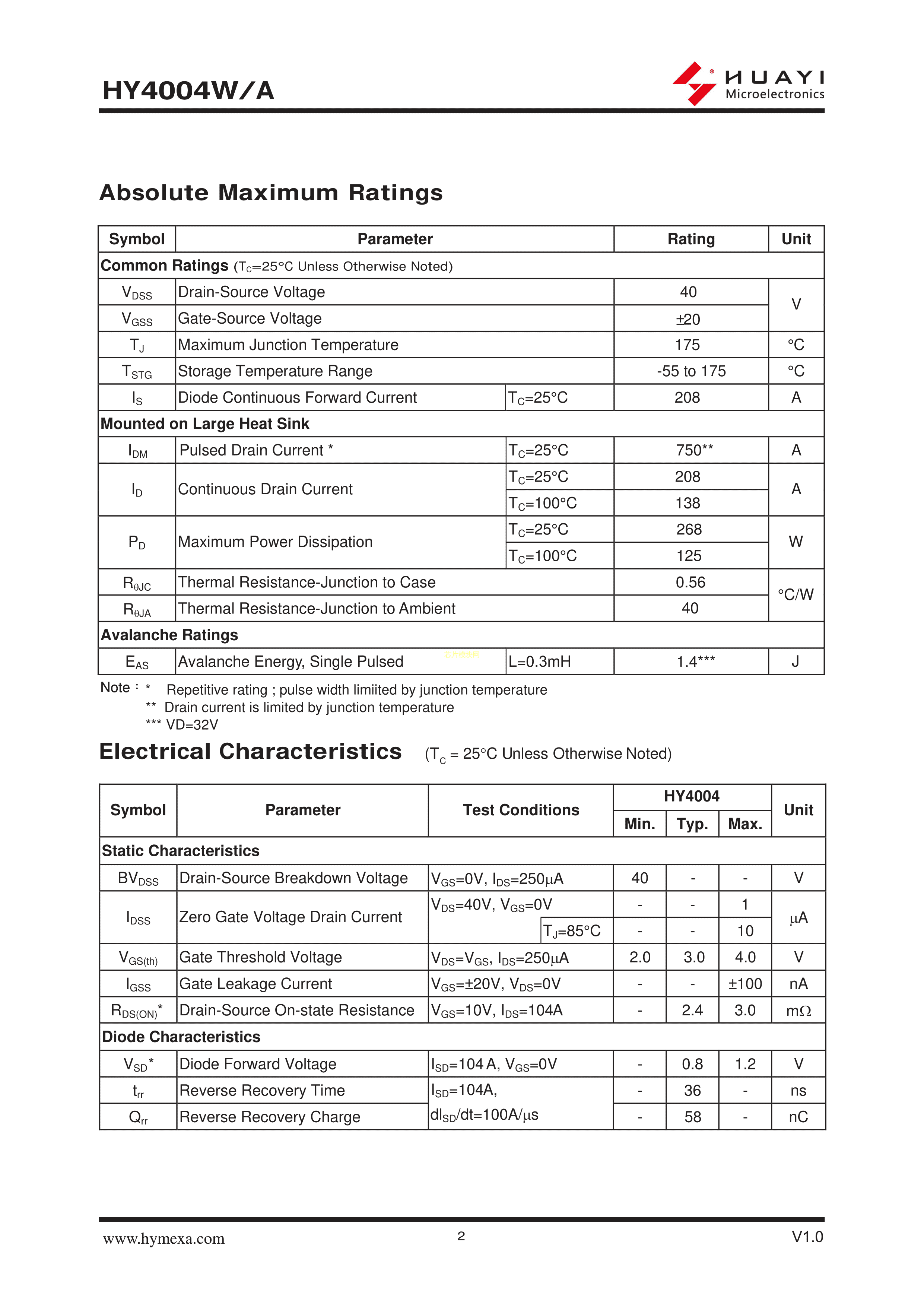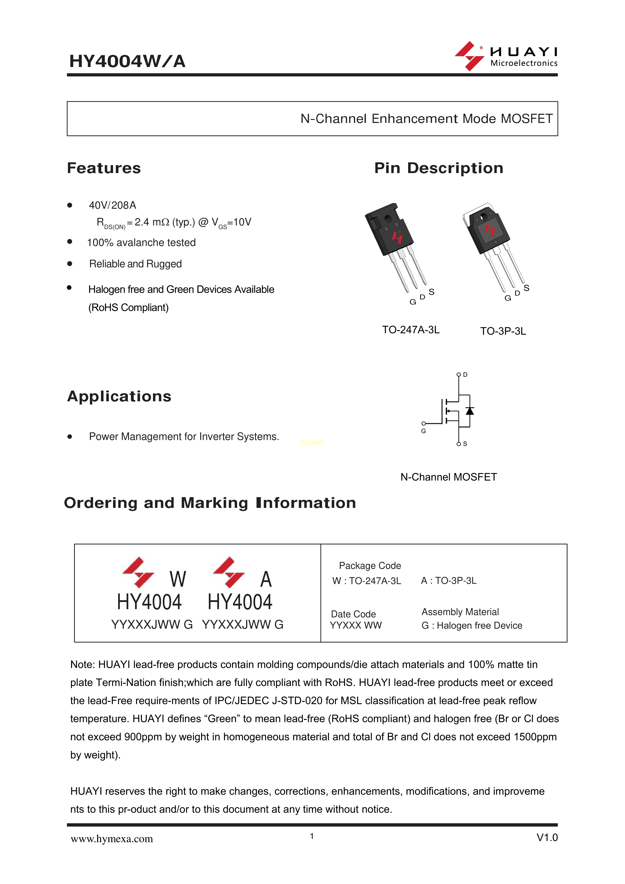 HY4004A数据手册TO-3P封装HUAYI(华羿微)PDF规格书,中英文下载