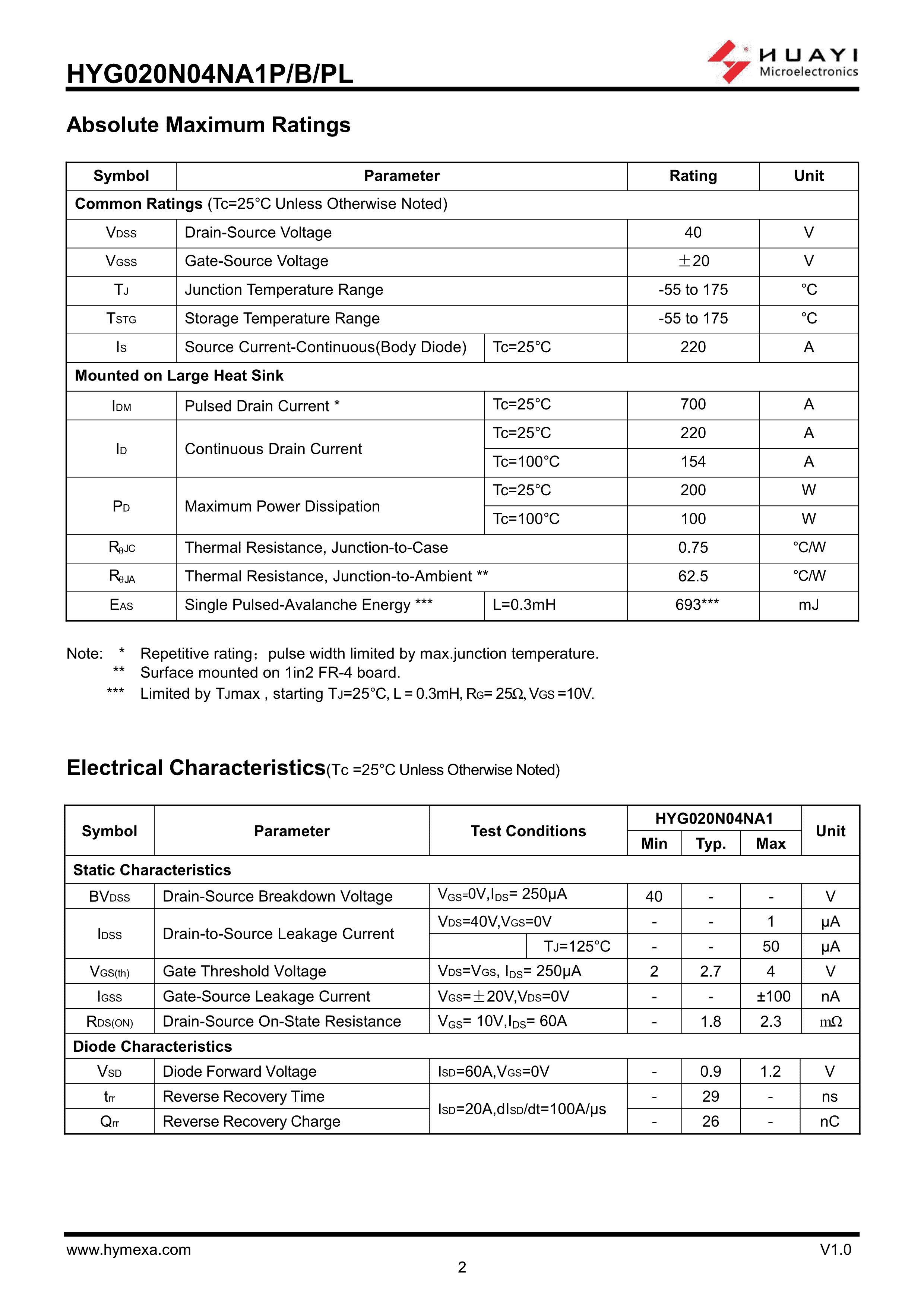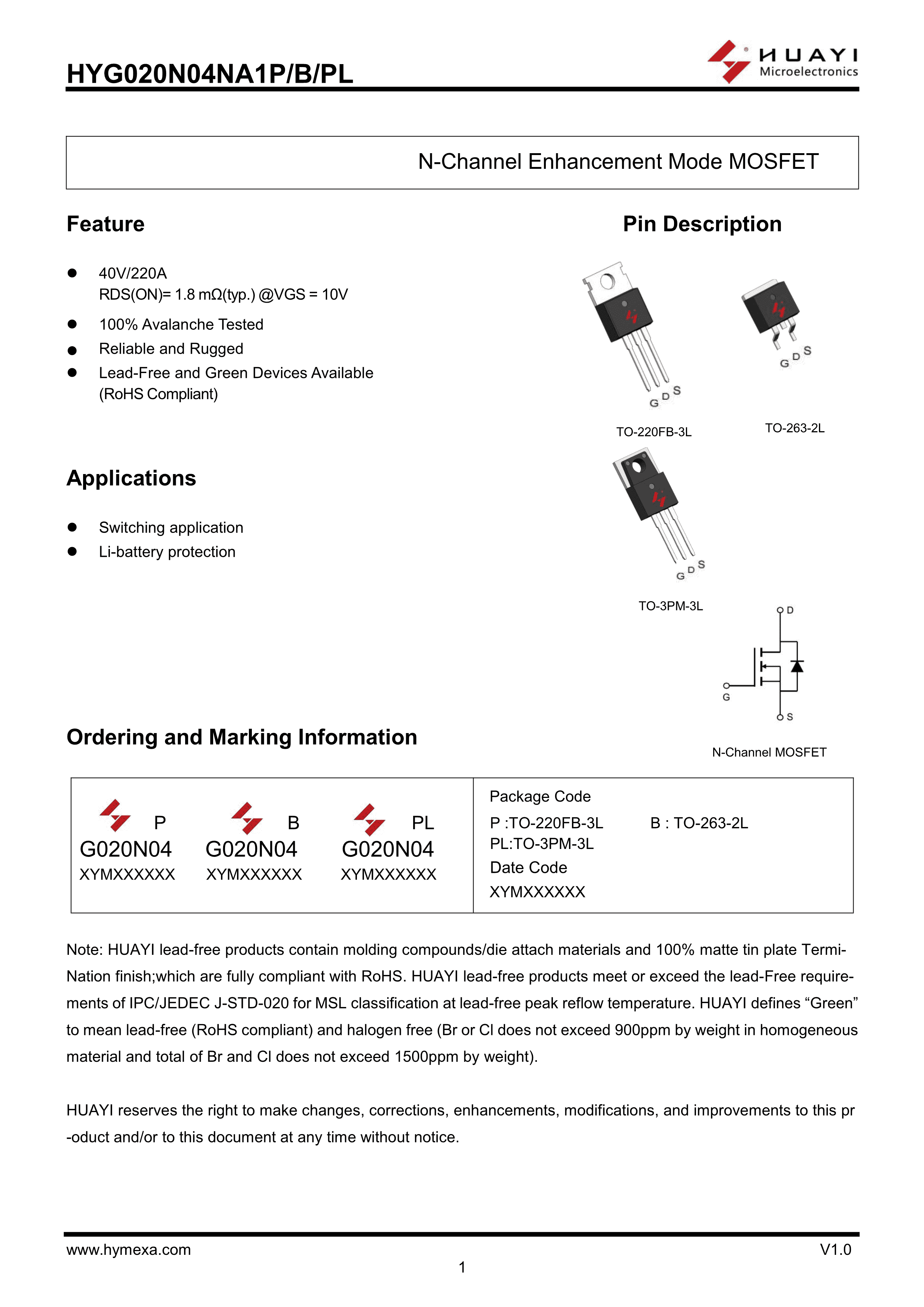 HYG020N04NA1P数据手册TO-220FB-3L封装HUAYI(华羿微)PDF规格书,中英文