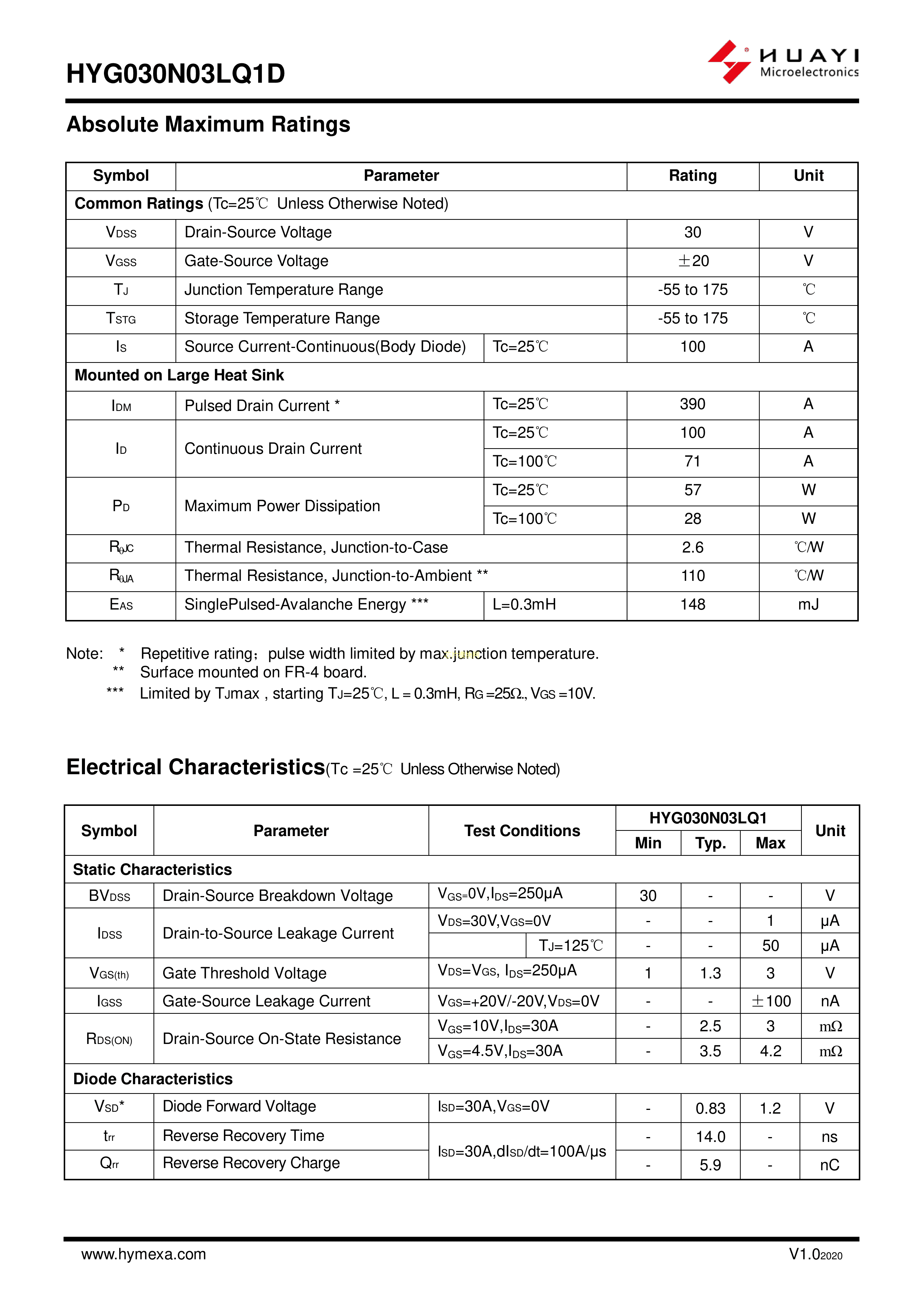 HYG030N03LQ1D数据手册TO-252-2L封装HUAYI(华羿微)PDF规格书,中英文下载