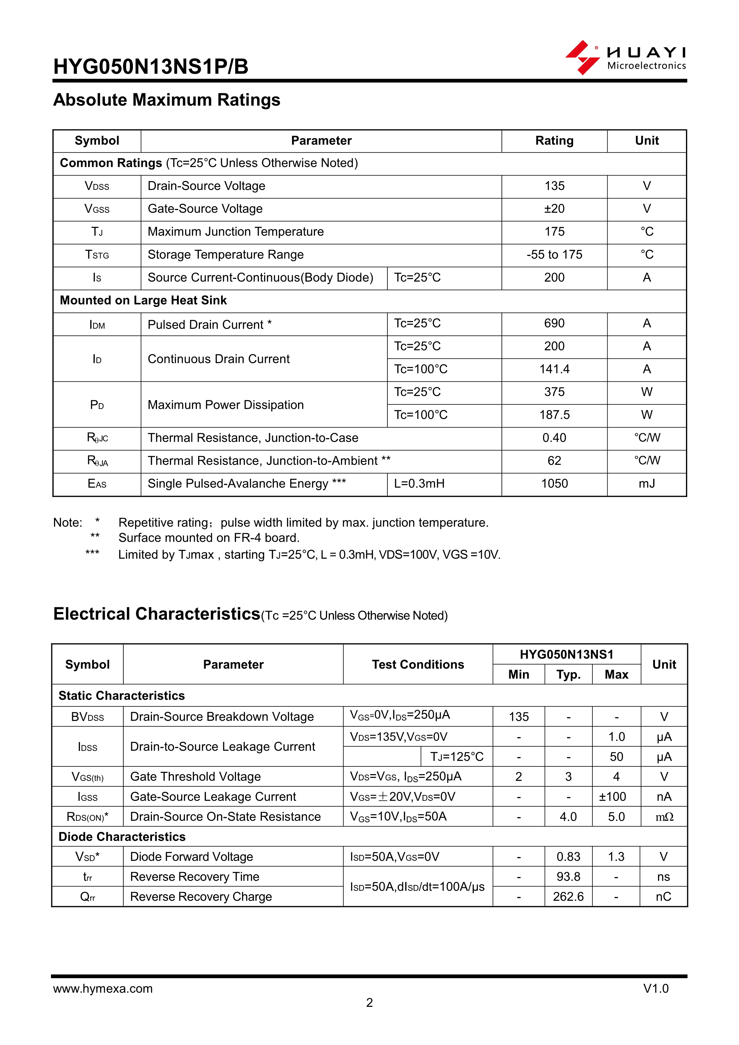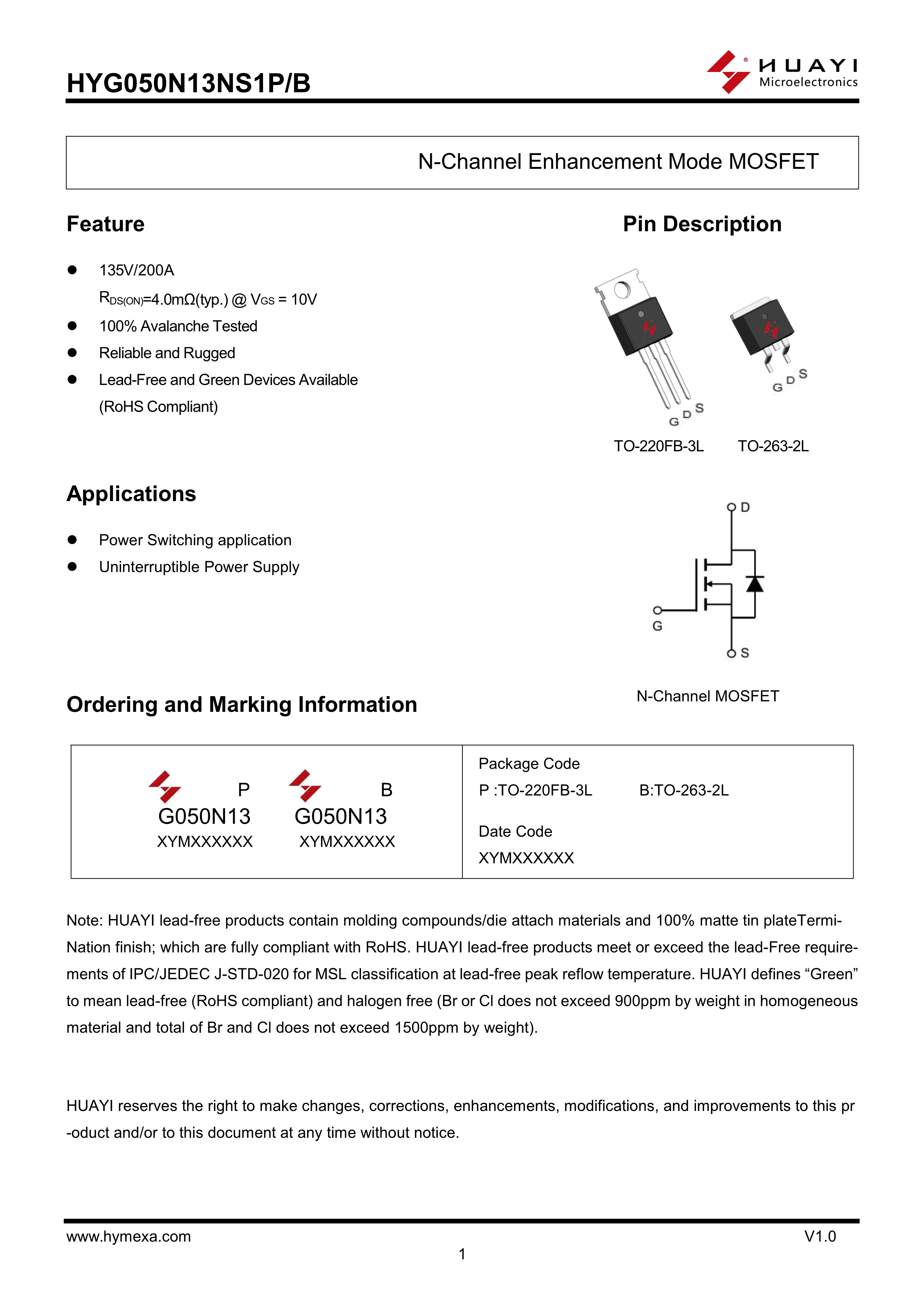 HYG050N13NS1B数据手册TO-263-2L封装HUAYI(华羿微)PDF规格书,中英文下载