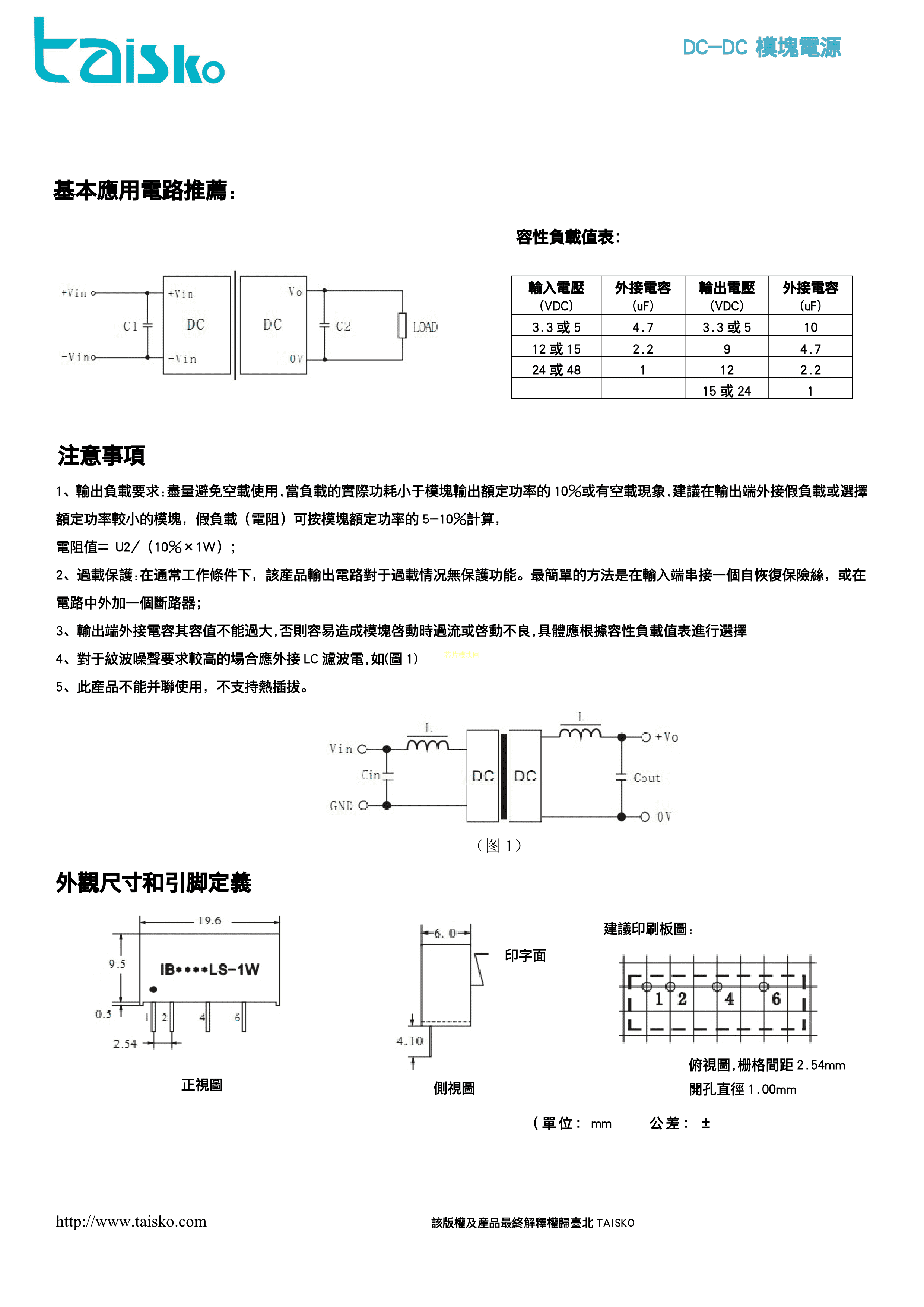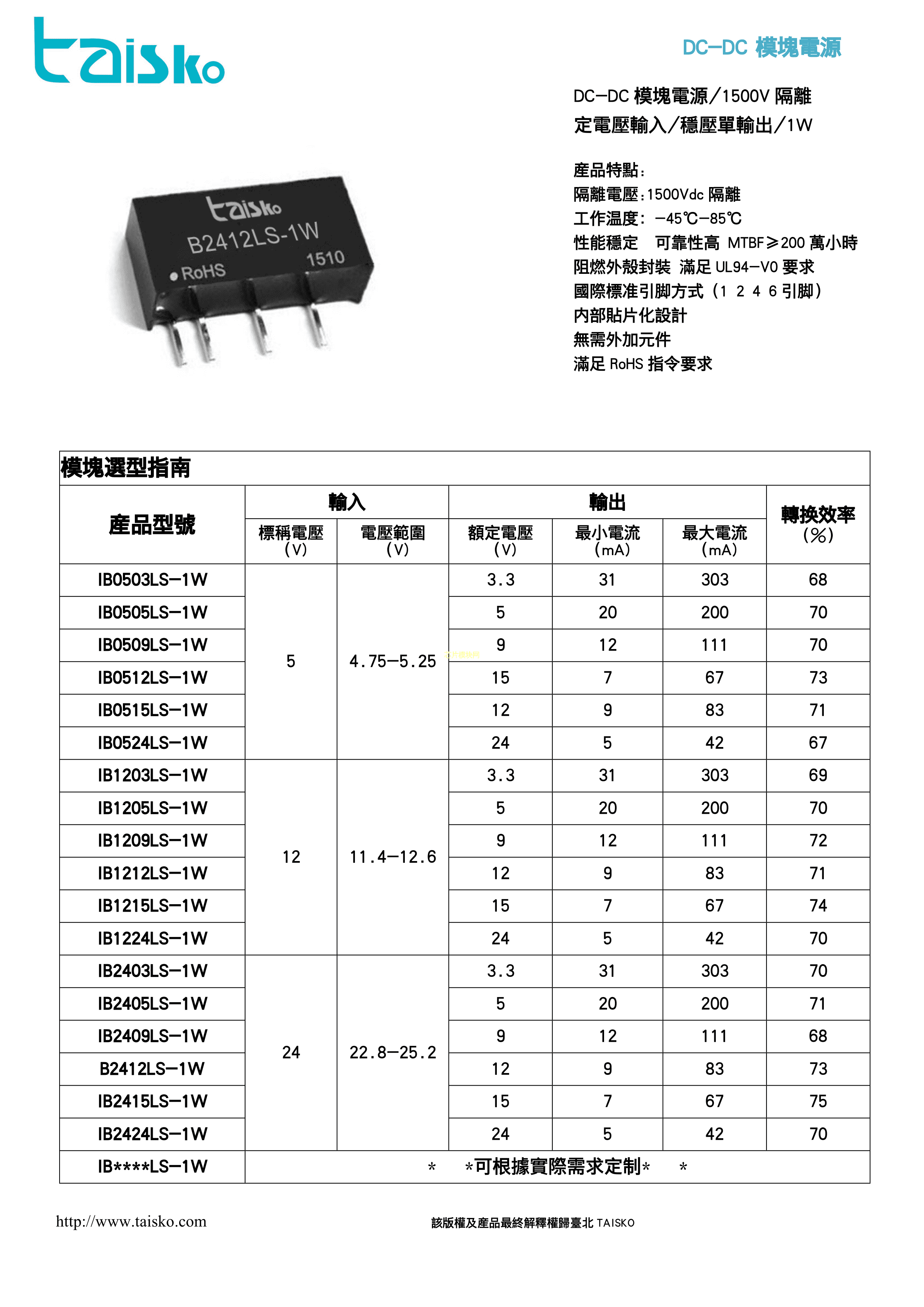 IB1205LS-1W数据手册插件封装Taisko(台思科)PDF规格书,中英文下载