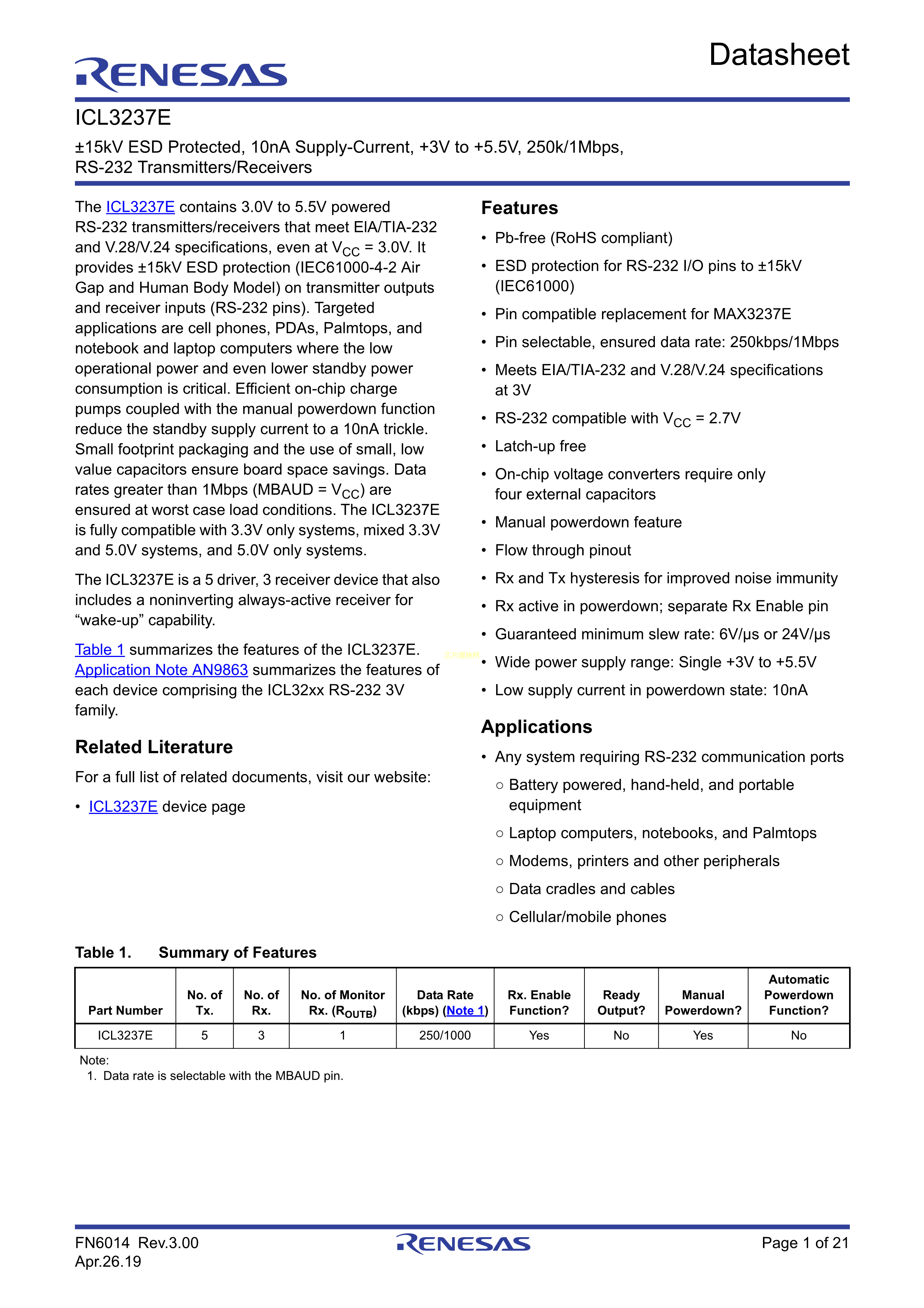 ICL3237EIAZ-T数据手册SSOP-28封装RENESAS(瑞萨)-IDTPDF规格书,中英