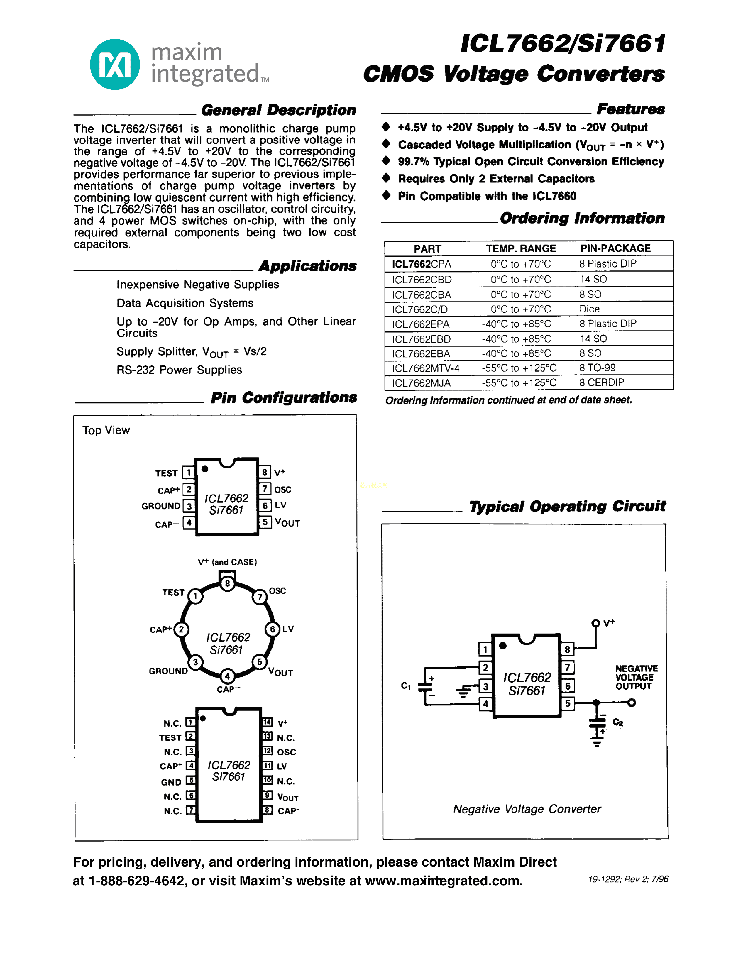 ICL7662EBD+T数据手册SO-14封装MAXIM(美信)PDF规格书,中英文下载