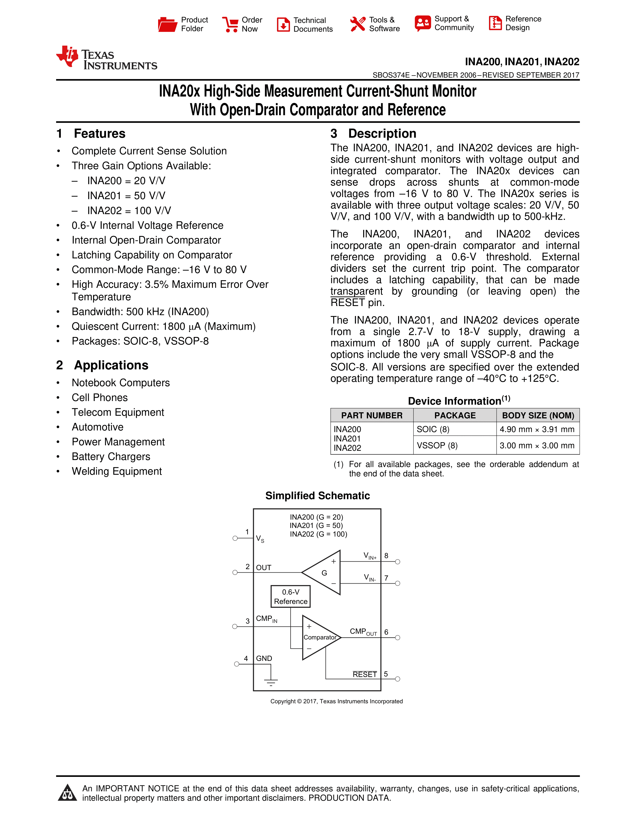 INA200AID数据手册SOIC-8封装TI(德州仪器)PDF规格书,中英文下载