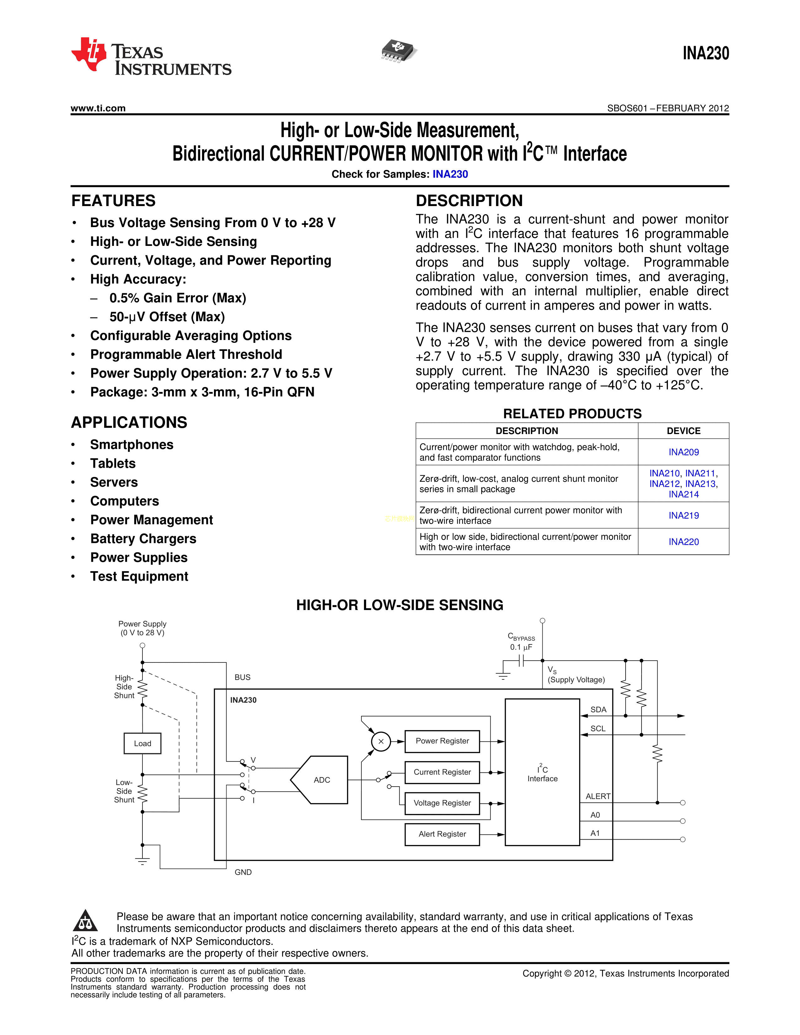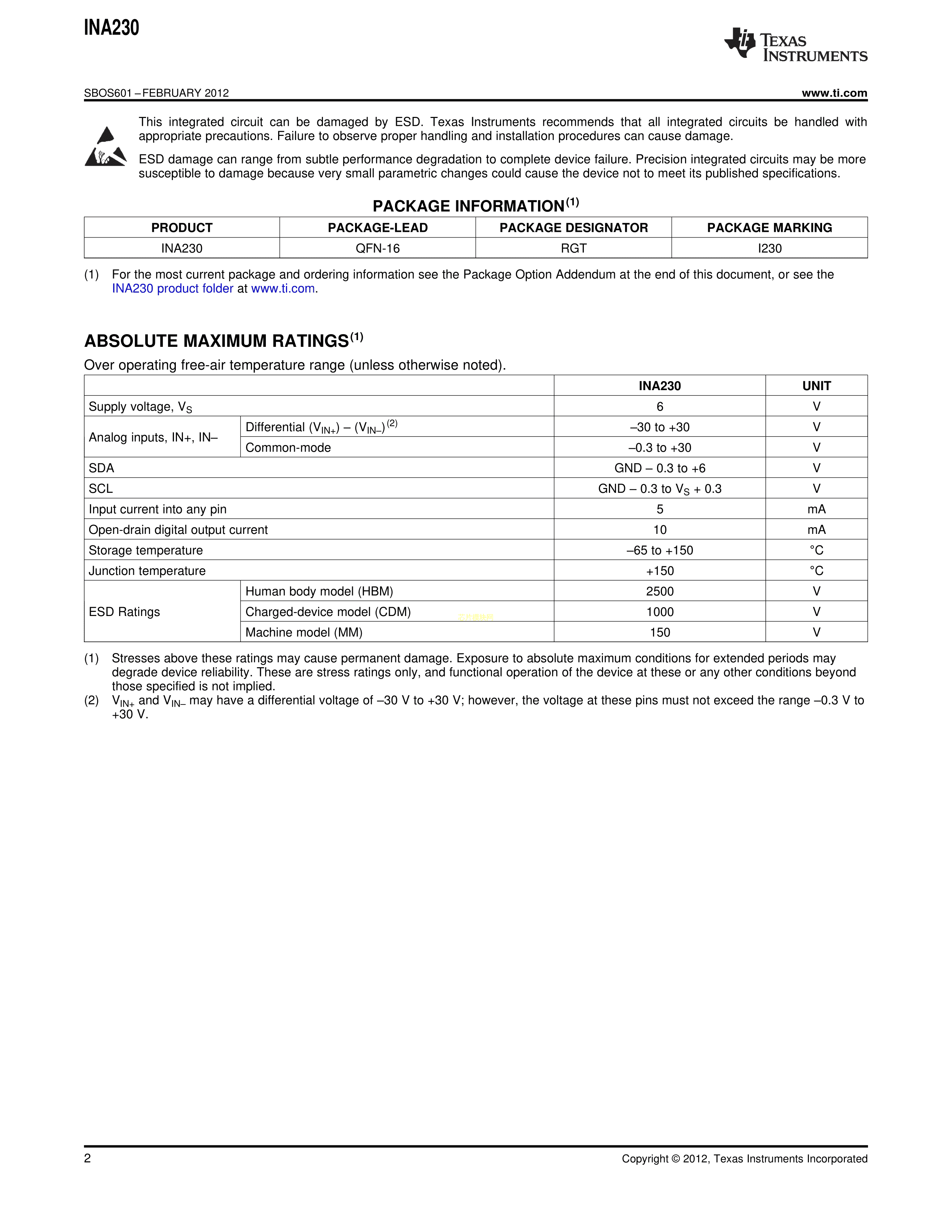INA230AIRGTT数据手册VQFN-16封装TI(德州仪器)PDF规格书,中英文下载