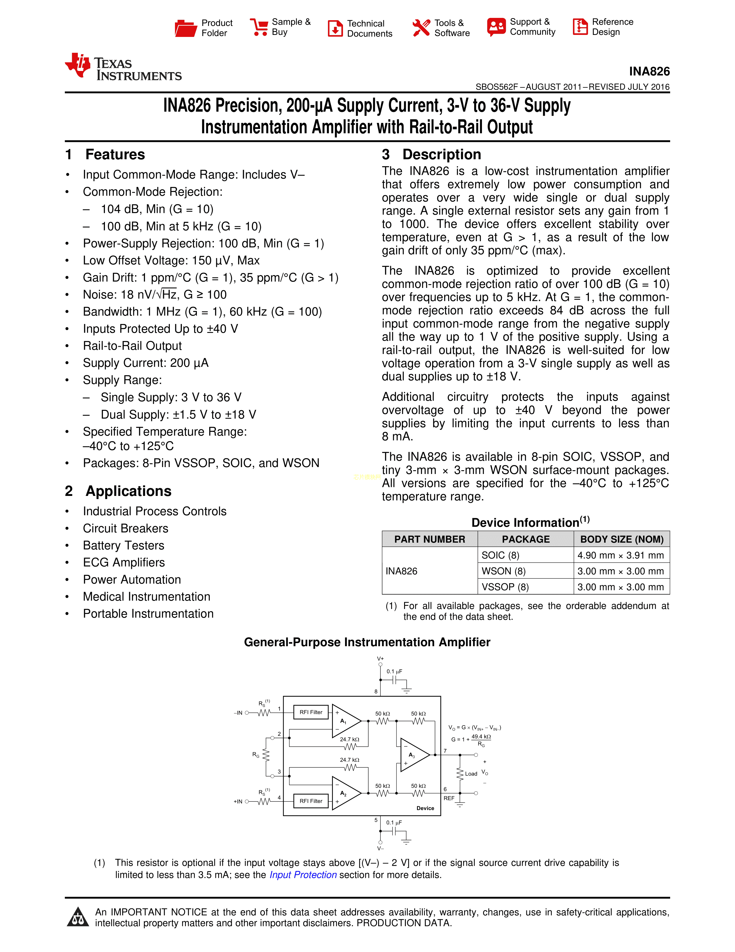INA826AIDRGT数据手册SON-8封装TI(德州仪器)PDF规格书,中英文下载
