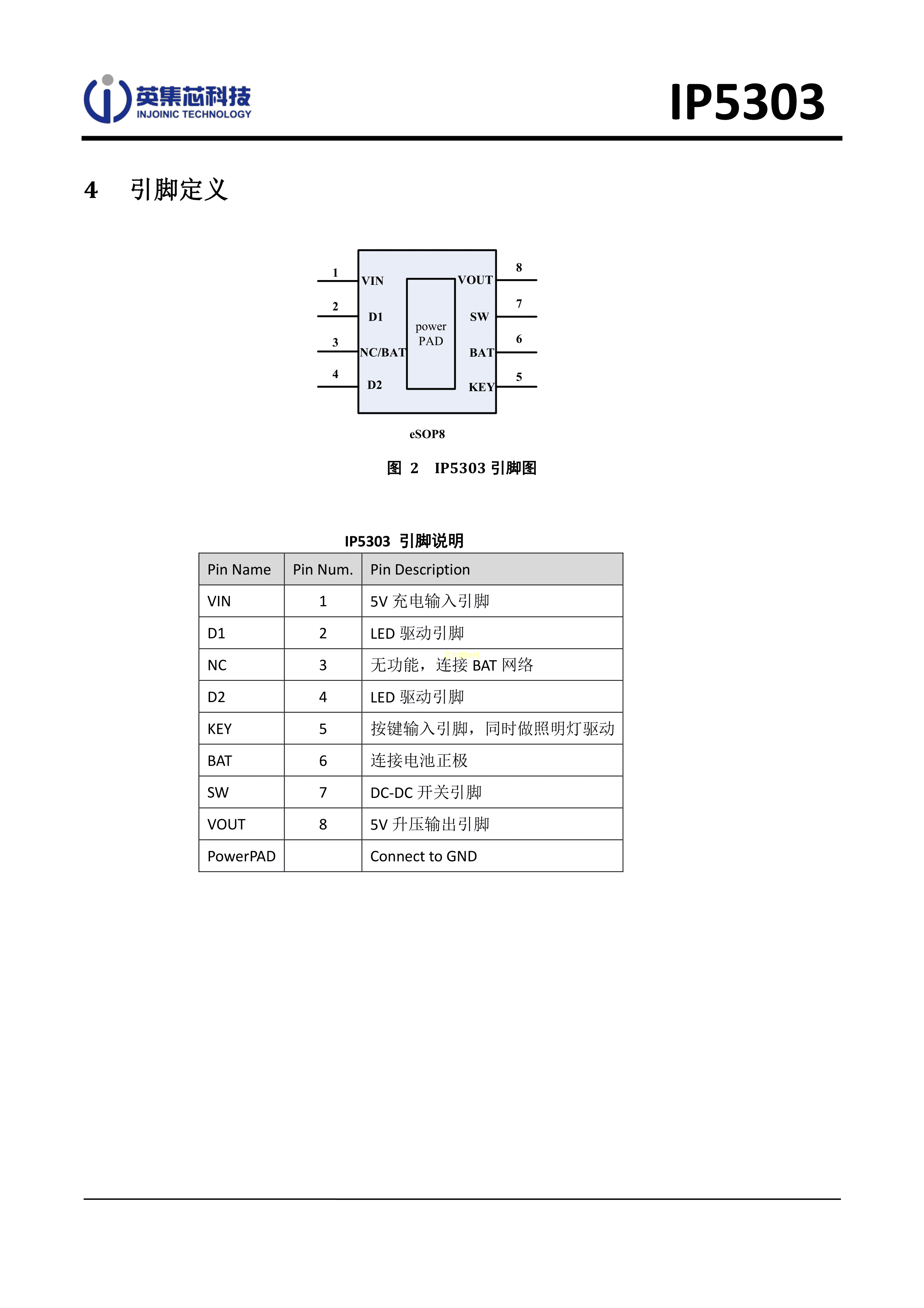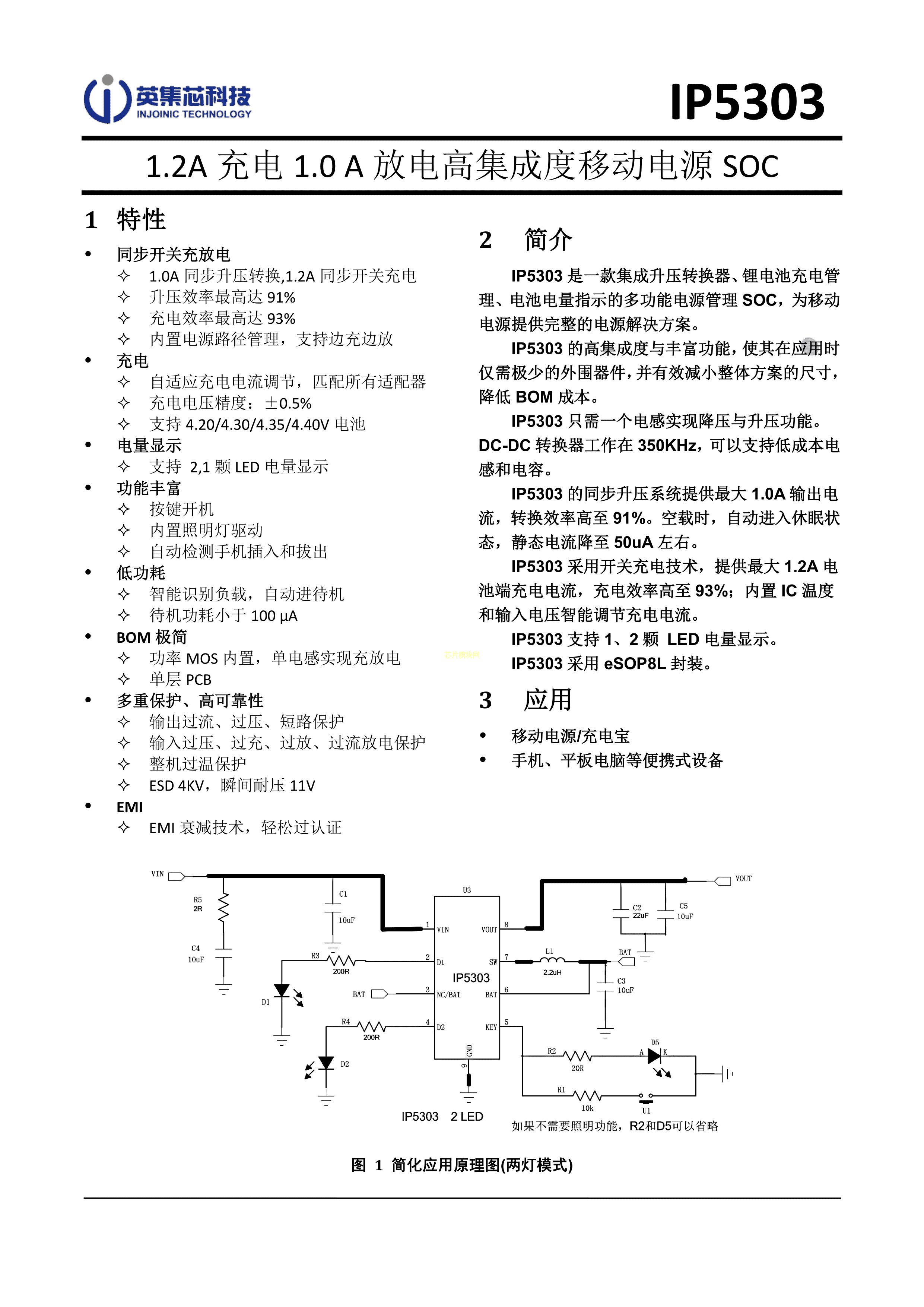 IP5303数据手册ESOP-8封装INJOINIC(英集芯)PDF规格书,中英文下载