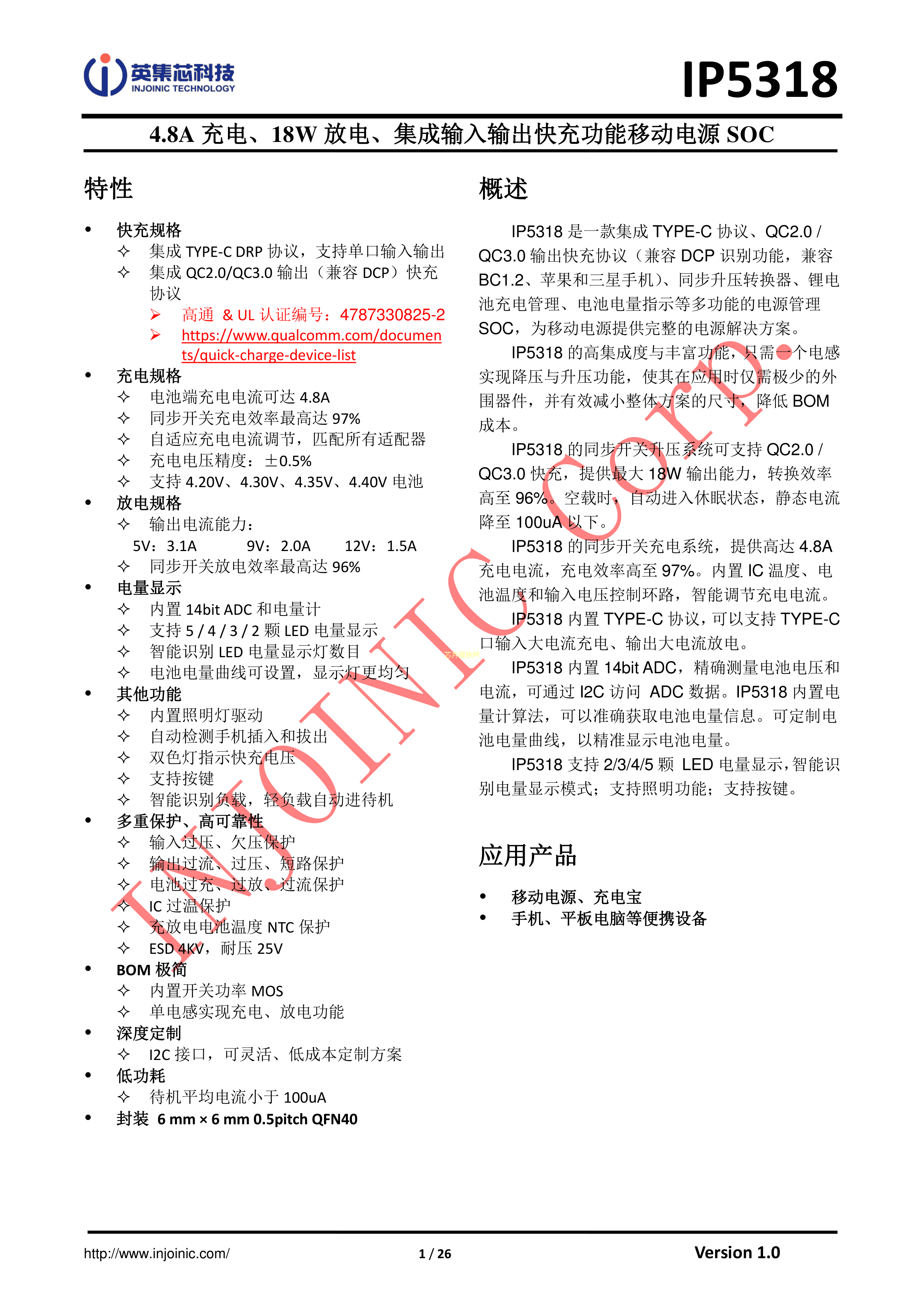 IP5318AQ数据手册QFN-40_6x6x05P封装INJOINIC(英集芯)PDF规格书,中英