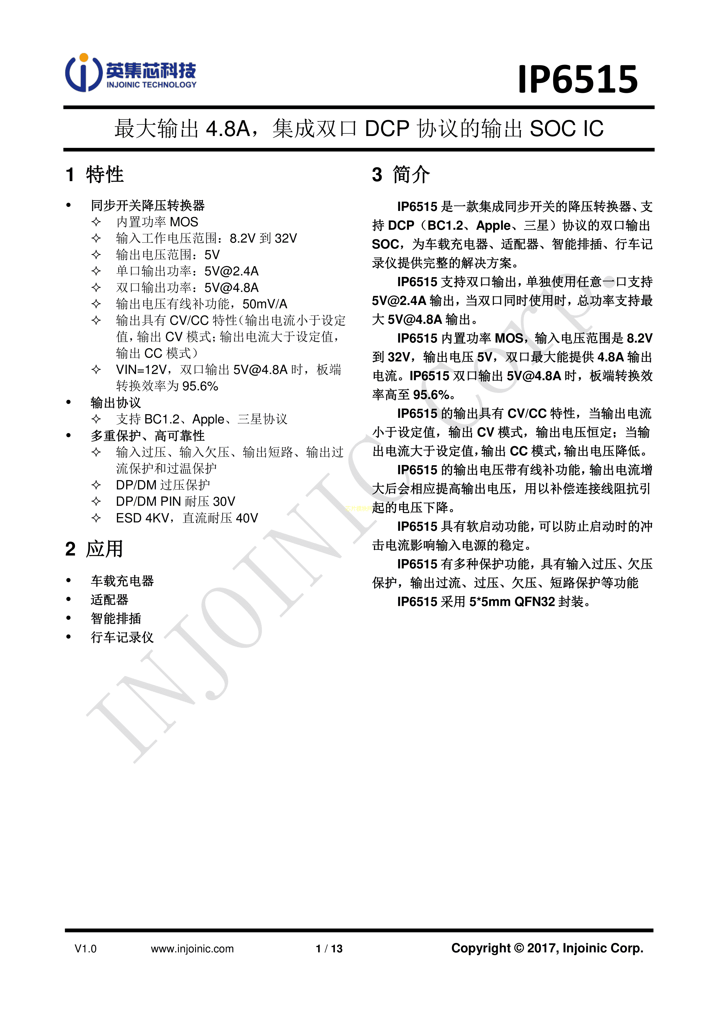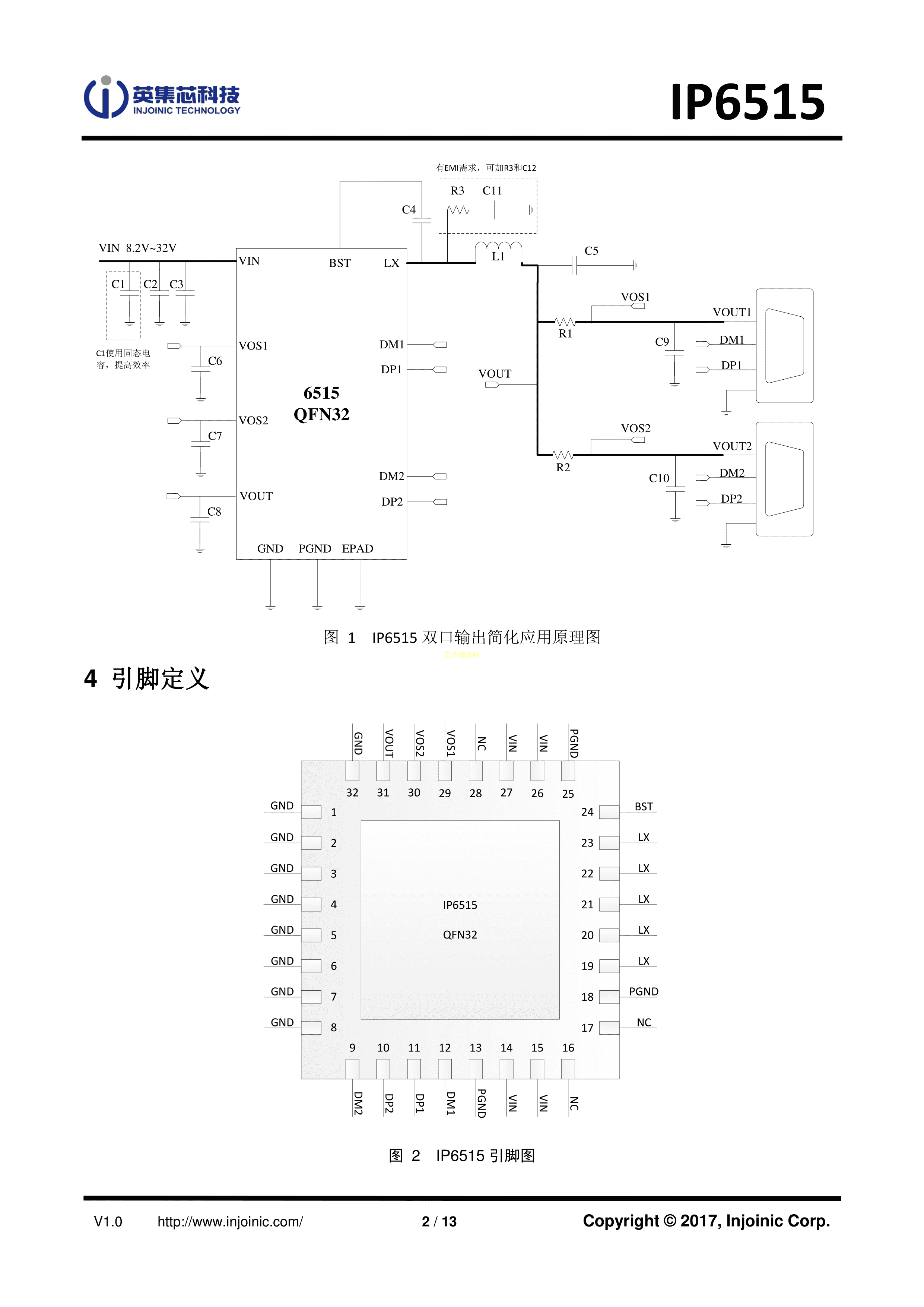 IP6515数据手册QFN-32封装INJOINIC(英集芯)PDF规格书,中英文下载