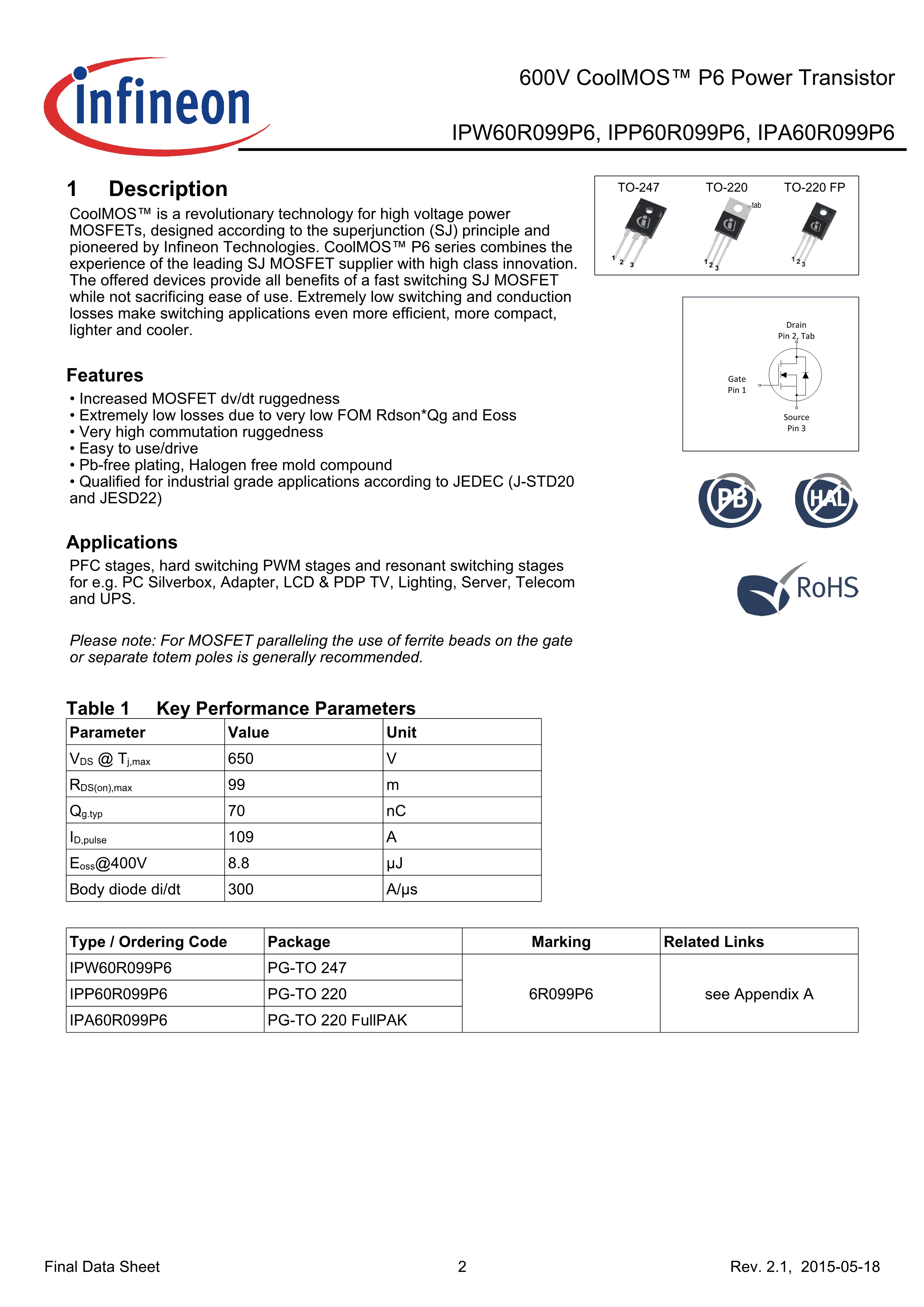 IPA60R099P6数据手册PG-TO220-3封装Infineon(英飞凌)PDF规格书,中英文