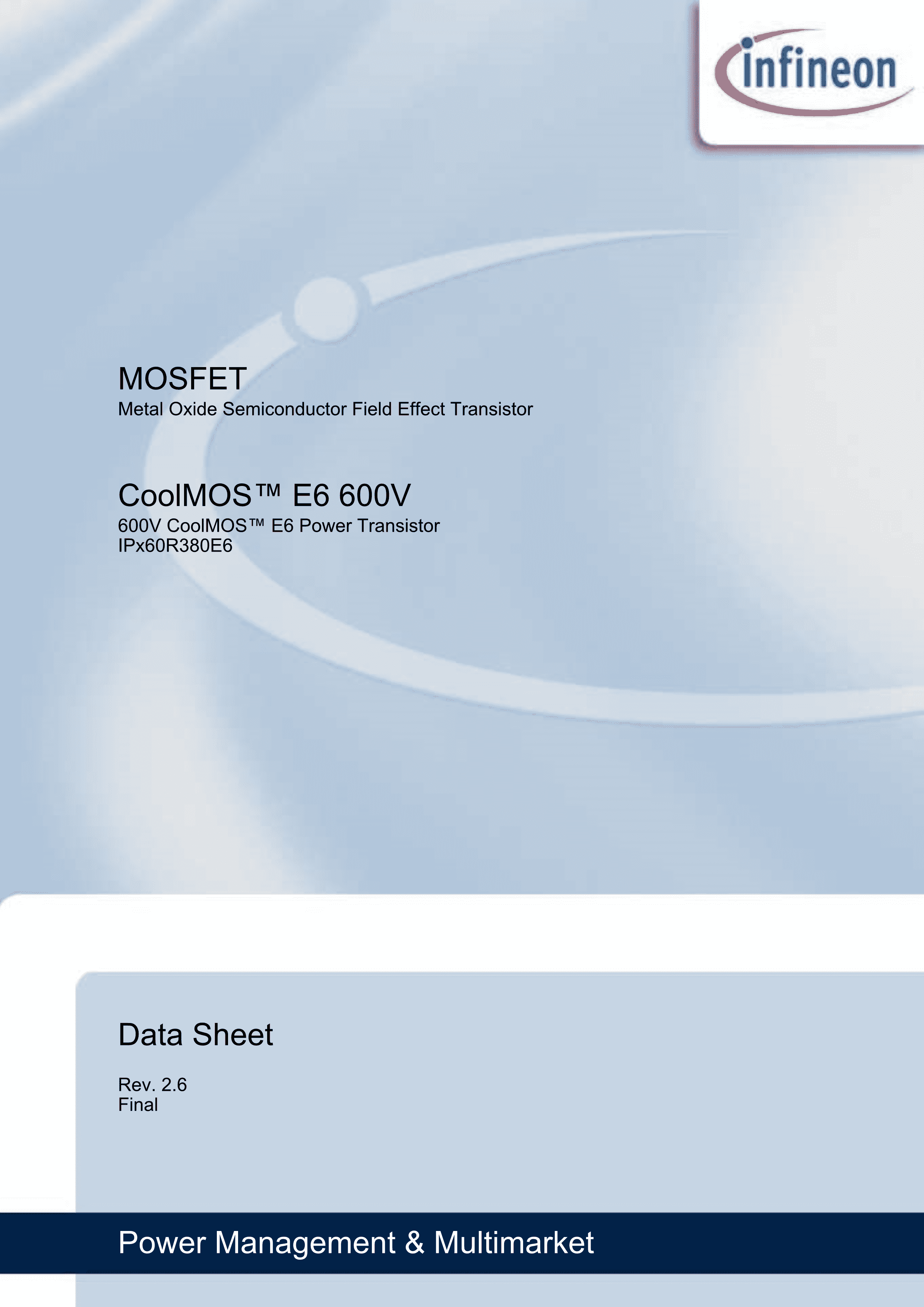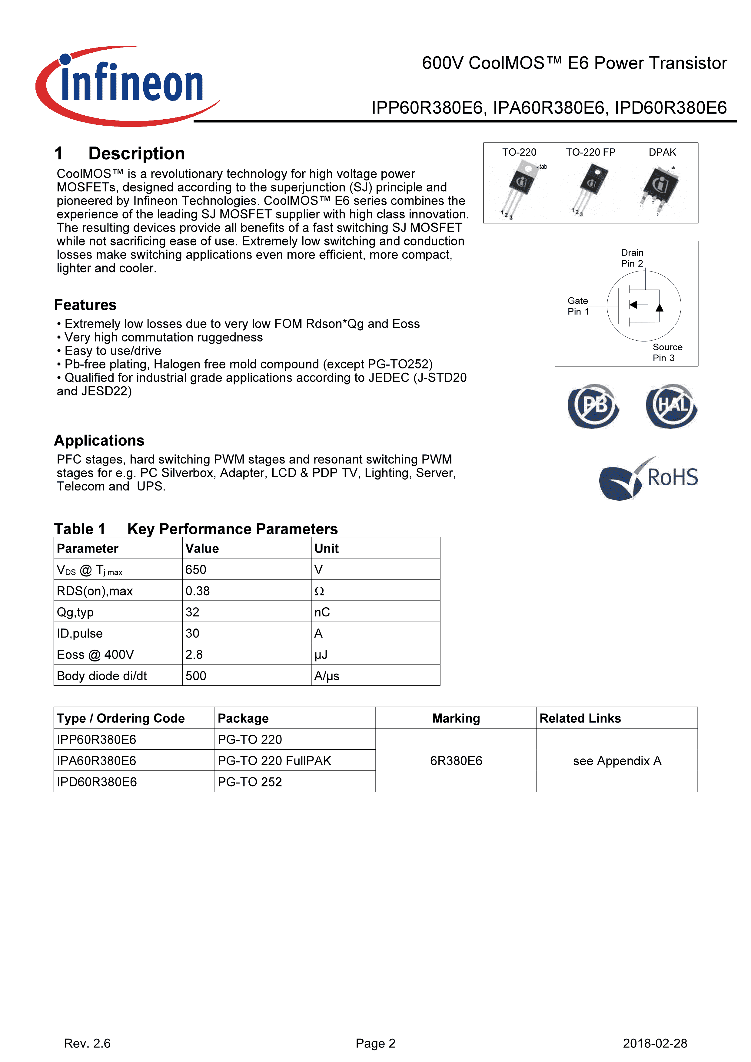 IPA60R380E6数据手册PG-TO-220封装Infineon(英飞凌)PDF规格书,中英文下