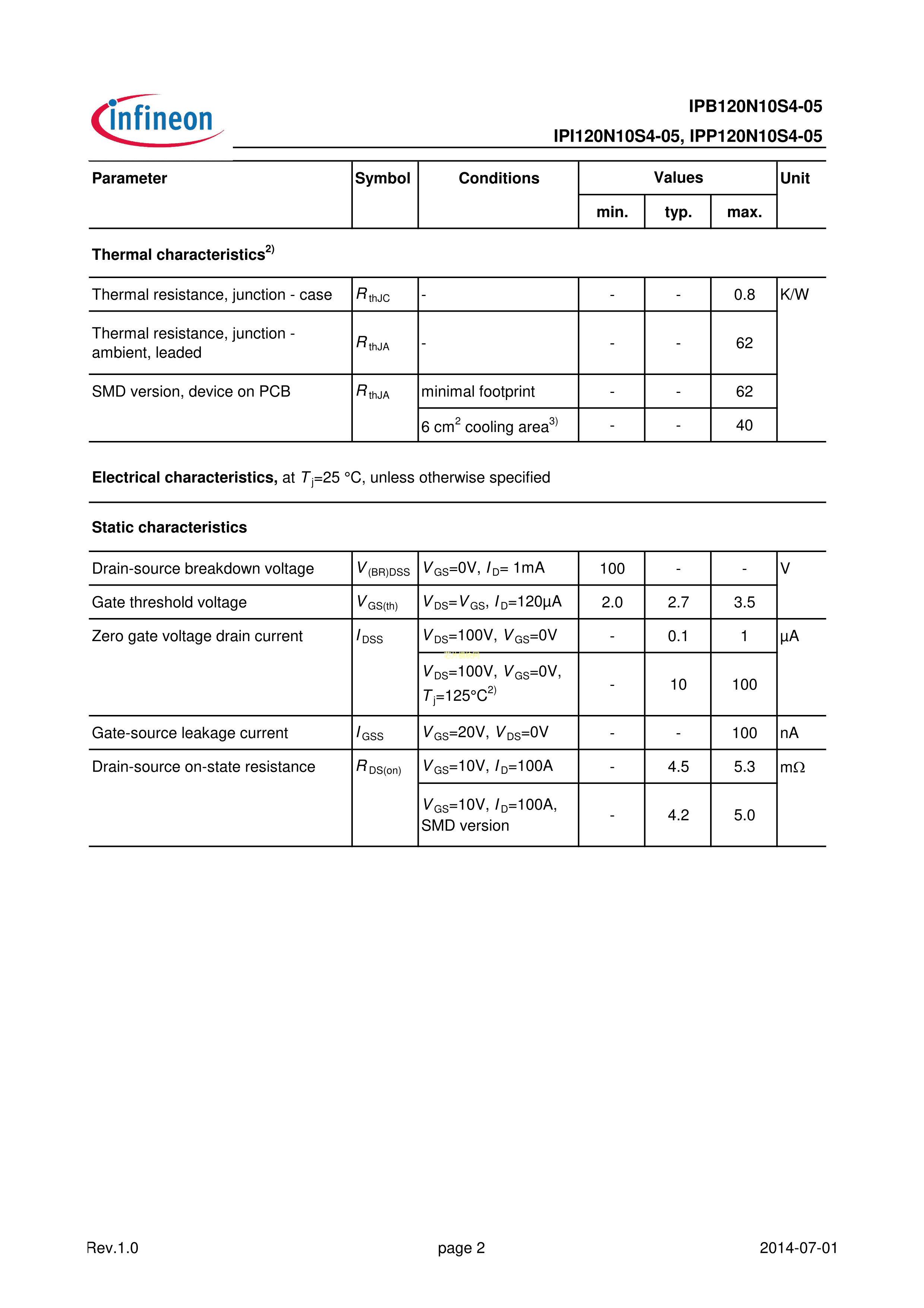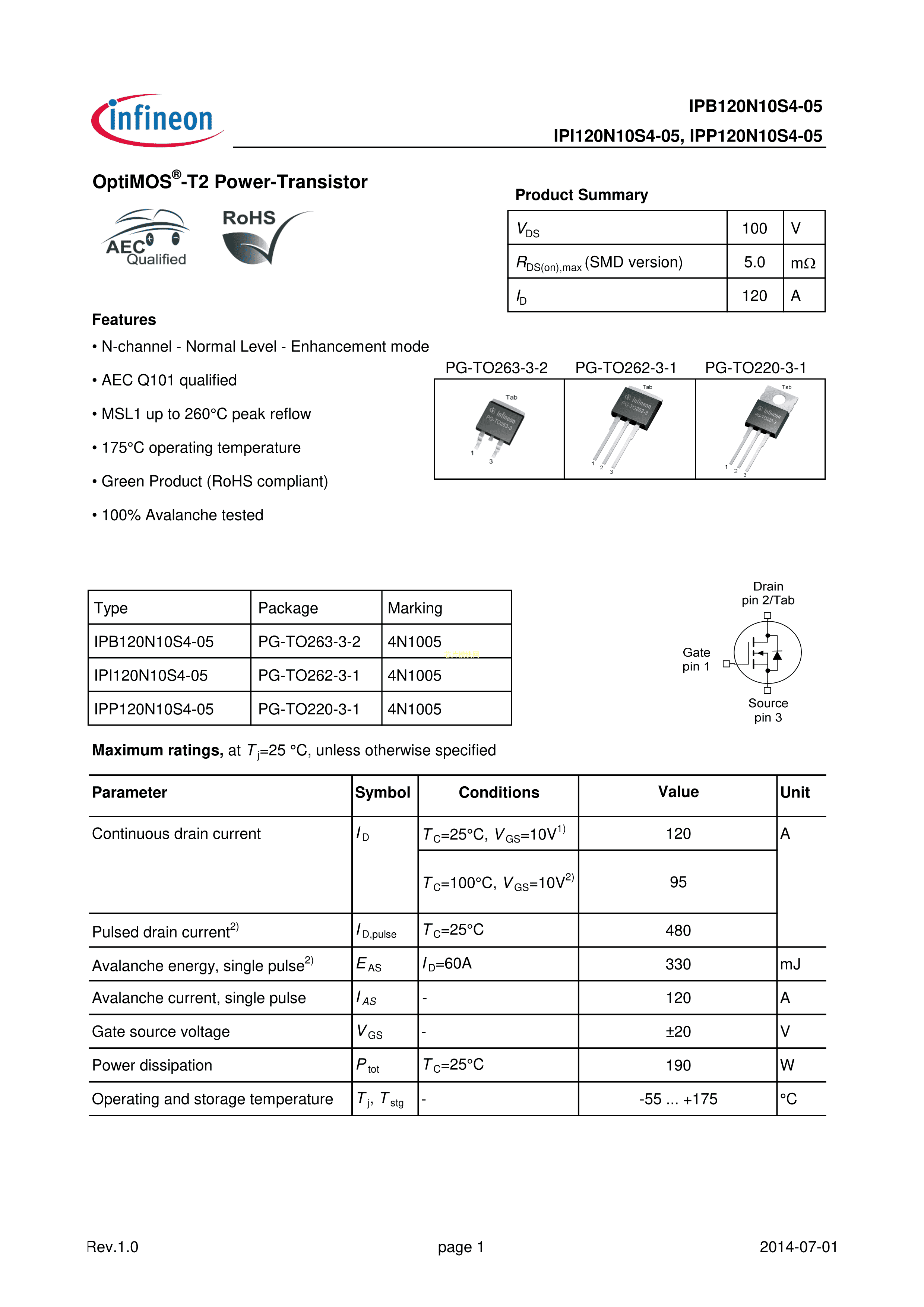 IPB120N10S4-05数据手册PG-TO263-3封装Infineon(英飞凌)PDF规格书,中英文下载