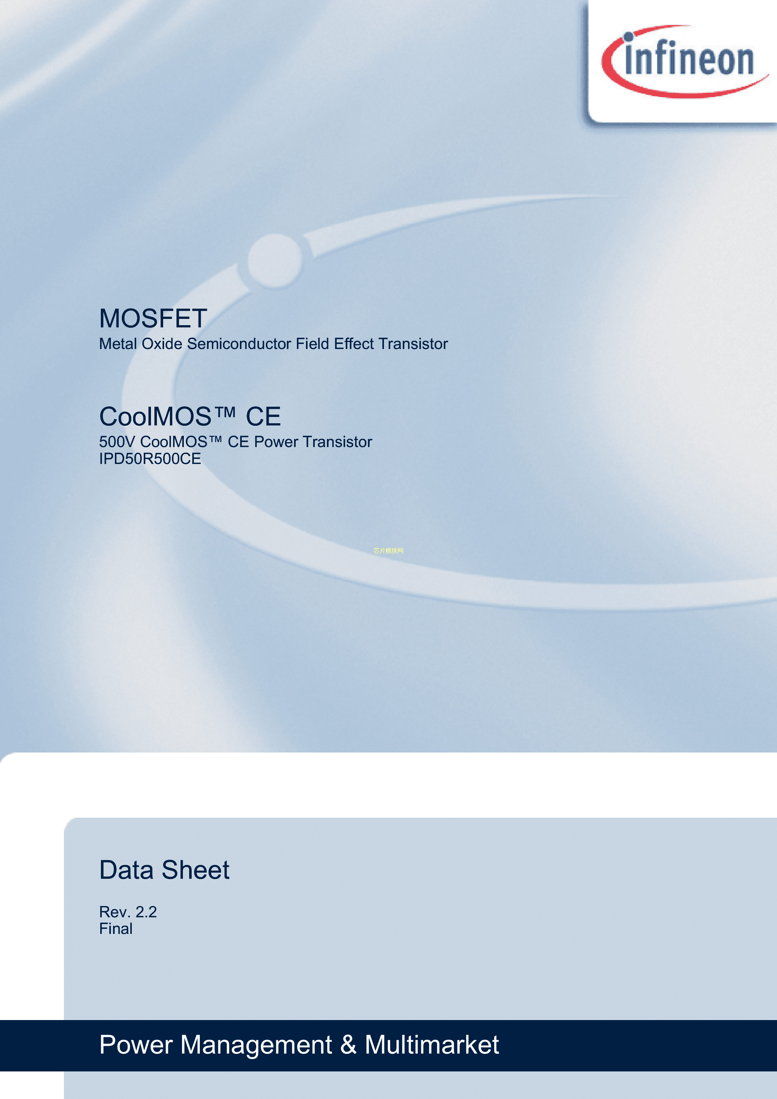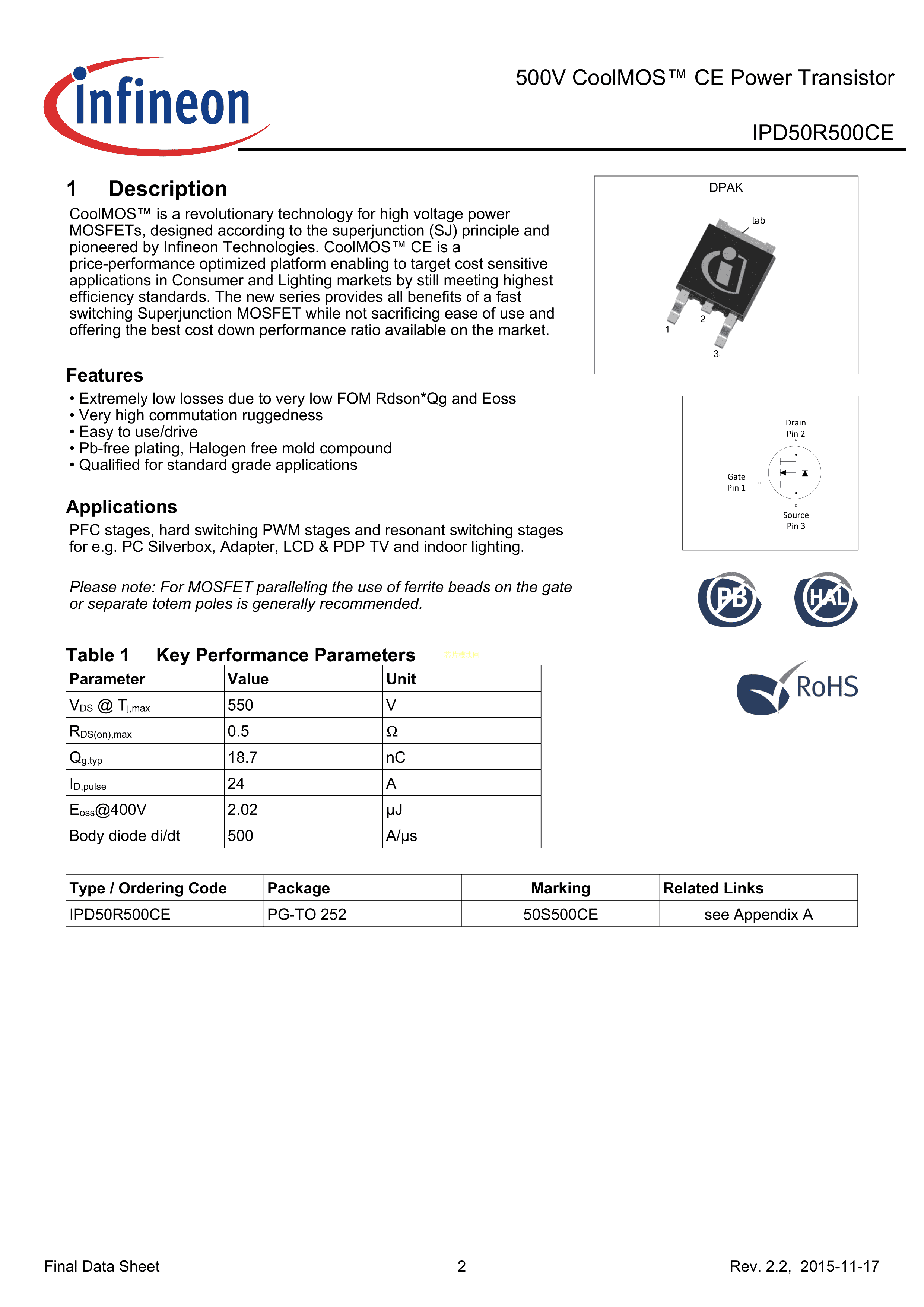 IPD50R500CE数据手册PG-TO252-3封装Infineon(英飞凌)PDF规格书,中英文下载