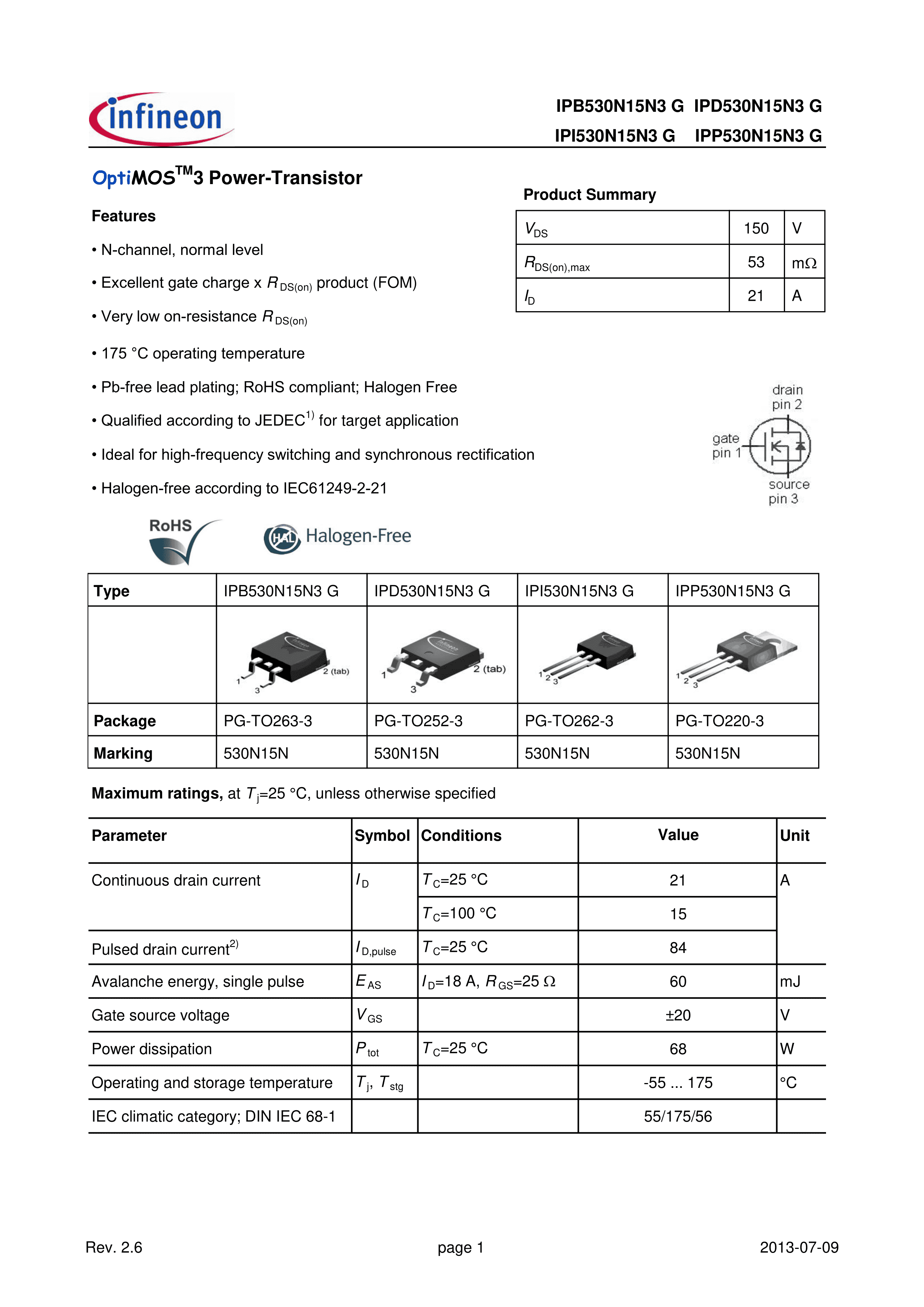 IPD530N15N3 G数据手册PG-TO252-3封装Infineon(英飞凌)PDF规格书,中