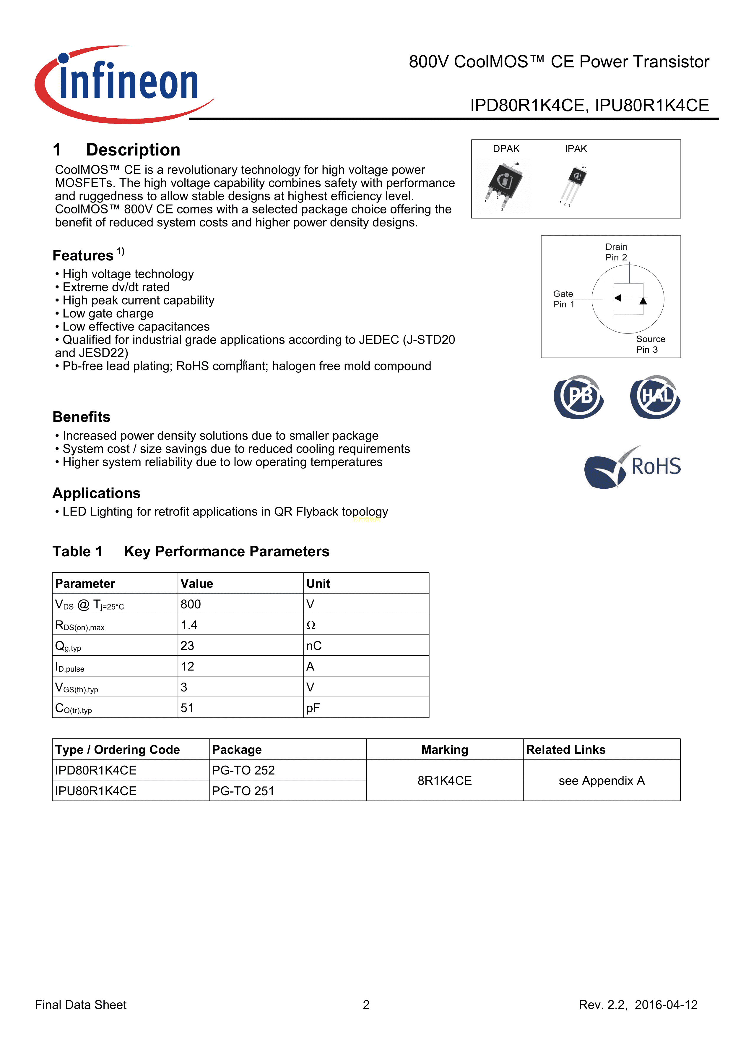 IPD80R1K4CE数据手册TO-252-3封装Infineon(英飞凌)PDF规格书,中英文下载
