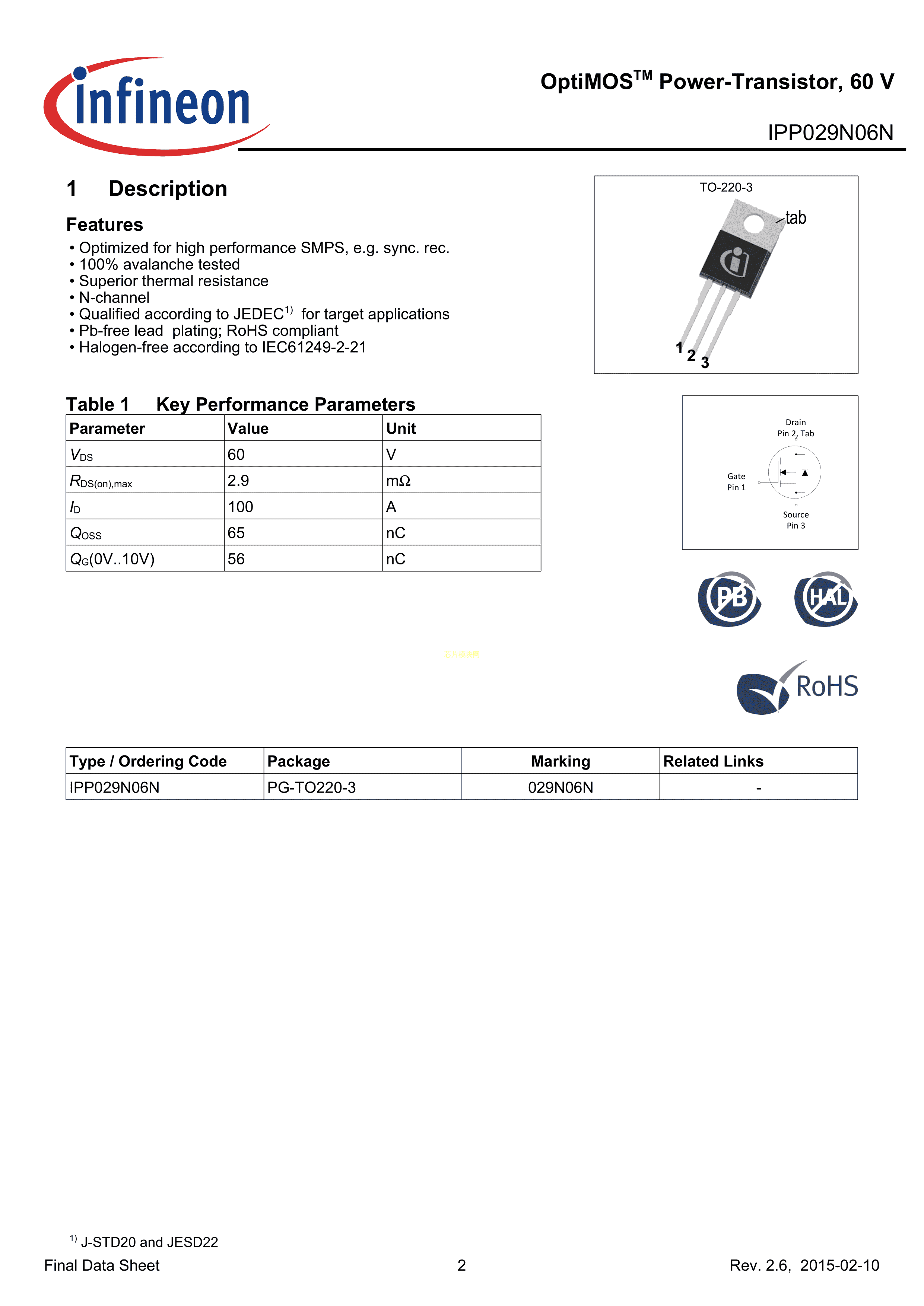 IPP029N06N数据手册PG-TO220-3封装Infineon(英飞凌)PDF规格书,中英文下载