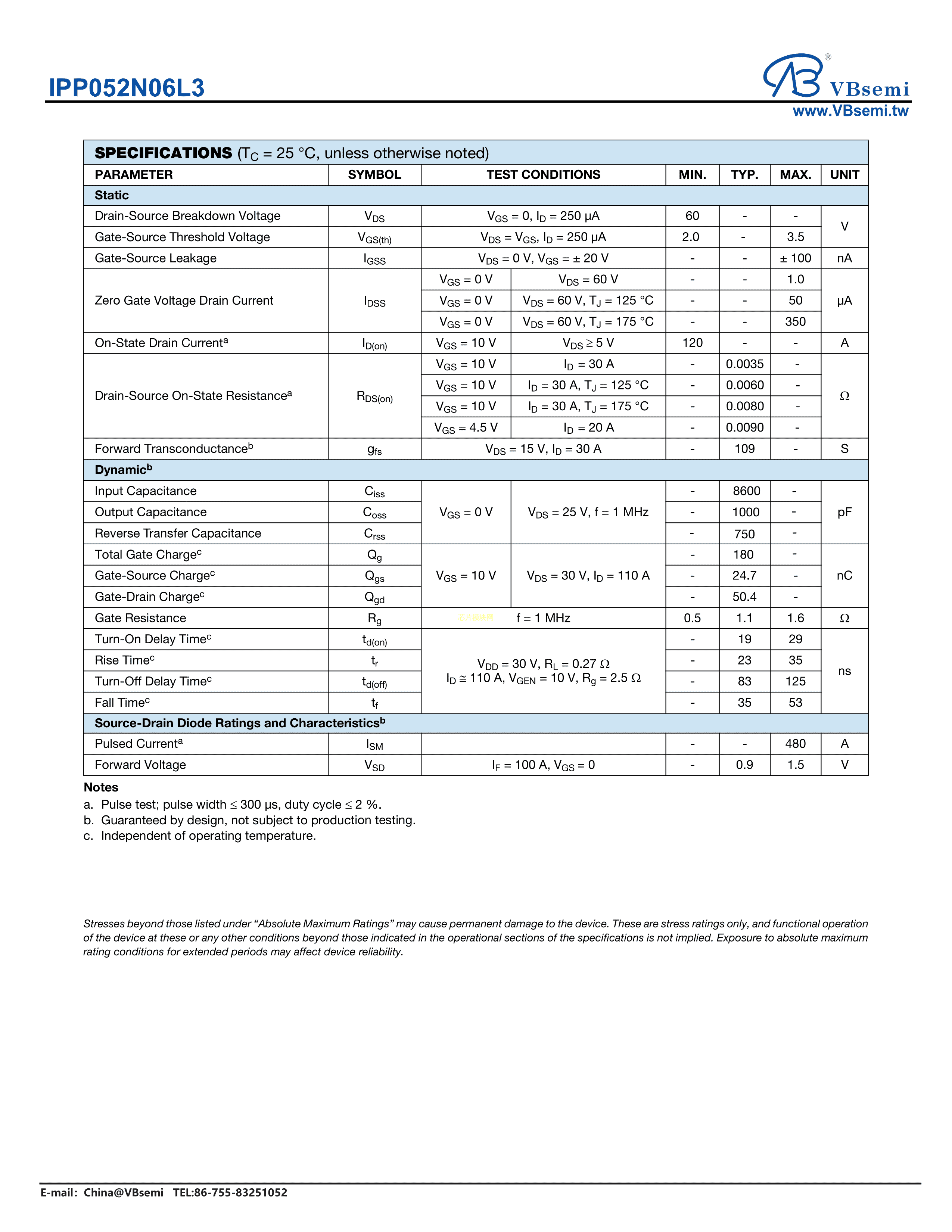 IPP052N06L3数据手册TO-220封装VBsemi(台湾微碧)PDF规格书,中英文下载